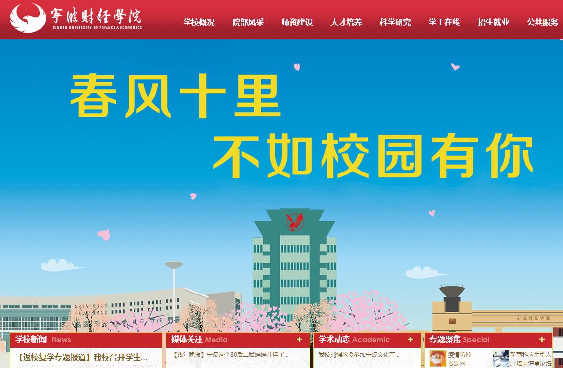 宁波财经学院是一所经国家教育部批准设立的全日制民办普通本科高校,学校创办于2001年,前身为宁波大红鹰职业技术学院,2008年升格更名为宁波大红鹰学院,2015年成为浙江省首批应用型本科建设试点示范高校,2018年更名为宁波财经学院。学校占地面积约1700亩,分为本部校区(位于宁波市区学院路)和杭州湾校区(位于宁波市杭州湾新区);现有金融贸易学院、工商管理学院、财富管理学院、艺术设计学院、象山影视学院、机械与电气工程学院、信息工程学院、人文学院、基础学院、马克思主义学院、成人继续教育学院、国际教育学院、公共文体部等教学单位,35个本科专业;在校全日制本科生近2万人。学校注重打造服务区域新经济发展的财经学科特色,形成了以经济、管理学科为主,经、管、工、文、艺等多学科协调发展的学科专业体系,着力培养具有创新精神和创业能力的中小企业中高端技术、管理岗位高素质应用型人才;现有省一流学科4个,市重点学科5个,省重点专业、优势专业和新兴特色专业建设项目共11个,市品牌、特色、优势等重点专业建设项目共8个;历届毕业生初次就业率均在96%以上,毕业生创业率在全省本科院校中名列前茅,国泰安创业学院被列为“浙江省普通高校示范性创业学院”,学校荣获“全国民办高校创新创业教育示范学校”。学校坚持深化产教深度融合、校政企多元合作,先后共建大宗商品商学院、国泰安创业学院、慧科互联网学院、3D打印学院、VR学院、大宗商品流通协同创新中心、蓝源家族财富管理研究院、埃美柯自动化装备协同创新研究院、创新经济研究所等多个特色学院和研究机构,通过学科交叉融合和产学研协同创新,大力推进新兴特色学科专业建设,培养地方新产业、新业态发展急需的应用型紧缺人才,主动为行业企业提供技术服务和智力支持。学校积极推进国际化办学进程,目前已与美、英、德、澳、韩、日等10余个国家和港澳台地区的50余所高校建立了长期稳定的校际合作关系,与斯洛伐克等中东欧国家开展了密切的教育合作交流,与台湾昆山科技大学合办视觉传达设计专业,与美国阿肯色州立大学、加州州立大学圣贝纳迪诺分校、澳大利亚卧龙岗大学合作开展“2+2本科双学位”联合培养,每年有近百名师生参与国(境)外交流生和交换生项目以及教师进修与访学活动。“十三五”期间,学校将坚持“致良知、育实才、立善业”的办学理念,坚守“成为中小企业发展的首选大学”的办学理想,秉承“自信、专注”校训,围绕应用型示范建设目标,深入推进体制机制创新和教育教学改革,努力建设成为高素质应用型人才的培养基地、解决区域中小企业工程技术问题的研究基地、区域经济增长和社会进步的服务基地,力争早日建成国内领先、有改革创新示范价值、特色鲜明的民办大学。