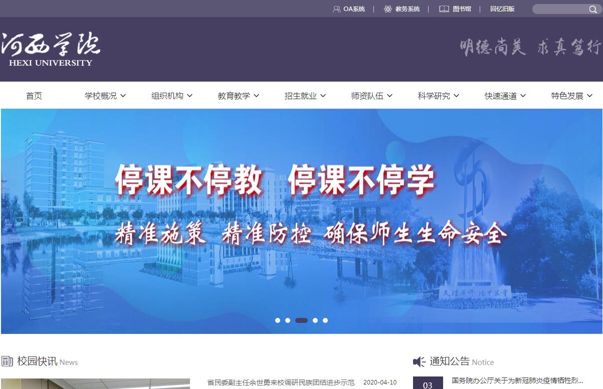 河西学院是甘肃省属普通本科院校,教育部确定的复旦大学对口支援西部高校,教育部卓越农林人才教育培养计划改革试点院校,全国精神文明建设先进单位,全国护理专业人才培养培训基地,硕士学位立项建设单位。杰出校友、中科院院士李灿任名誉校长,中科院院士、复旦大学原校长杨玉良任学术委员会名誉主任,中国工程院院士李玉任应用真菌工程实验室学术委员会主任,中科院院士傅伯杰任祁连山生态研究院学术委员会主任委员。河西学院位于丝绸之路黄金段、河西走廊中部的国家级历史文化名城张掖市,是兰州至乌鲁木齐近2000公里区域内唯一一所综合性普通本科院校,学校服务区域主要面向河西走廊、甘肃及新疆、青海、内蒙、宁夏四个少数民族省区,战略地位重要,地域优势独特,自然资源丰富,文化禀赋深厚,办学育人空间广阔。河西学院发端于1941年创立的甘肃省立张掖师范学校;1958年成立张掖师范学院;1959年改办为张掖师范专科学校;1962年调整为张掖师范学校;1978年恢复张掖师范专科学校;1992年更名为张掖师范高等专科学校;2000年并入原张掖农校和张掖地区职业中专;2001年改制为河西学院;2014年原张掖医学高等专科学校、张掖市人民医院并入河西学院,组建新的河西学院;70多年来已累计培养毕业生10万余人。学校始终坚持立德树人的根本任务,秉承“立足河西、面向甘肃、辐射周边”的办学定位,坚持“做河西文章、出特色成果、建丝路名校”的发展方向,践行“以人为本、知行合一、止于至善”的治校理念,致力于把学校建设成为具有鲜明特色的人民满意的地方性、应用型河西大学,成为甘肃特别是河西地区高素质应用型人才培养基地、科学研究与技术开发基地、文化传承创新基地和区域经济社会发展服务中心。学校总占地面积近4000亩,校舍面积50万平方米,固定资产总值13亿元,实验仪器设备总值1.6亿元,馆藏纸质图书120万册,电子图书110万册;学校拥有全省最好的学术中心、艺术创意中心、教师发展中心等现代化设施,建有钱学森纪念馆、河西走廊生物多样性馆、河西历史文化馆等展馆,学校为全国高校博物馆育人联盟成员单位。附属医院是一所三级甲等医院,甘肃省“全科医学”培训基地和乡村医生培训基地,床位1300多张,年接诊60多万人次。已初步建成美丽校园、智慧校园,被誉为甘肃最美的大学校园之一。学校坚持师、农、医为主,多学科协调发展。设有18个二级学院,59个本科专业,11个医学专科专业,覆盖12个学科门类,已形成“教师教育、生态农业、医疗卫生、应用文理、工程技术”5大学科专业群;有国家级特色专业1个(种子科学与工程),省级特色专业10个(小学教育、学前教育、旅游管理、数学与应用数学、化学、电气工程及其自动化、工商管理、护理学、应用化学、物理学),省级重点学科3个(历史文献学、农业资源与环境、发展与教育心理学)。学校坚持以提高适应性、满足多样性、突出特色性为目标, 坚持立德树人,教书育人,深入推进人才培养模式为重点的教育教学改革,持续实施本科教学质量工程,获多项省级优秀教学成果一、二等奖;有省级教学团队7个、省级精品资源共享课5门、省级精品课程18门、省级实验教学示范中心6个;一大批学生在全国、全省及国际各类竞赛中获奖。学校面向全国18个省、市、区招生,全日制在校本专科学生2万余人,毕业生就业率一直保持在90%以上。学校坚持人才强校战略,大力实施“祁连学者”人才工程,努力培养和造就“师德强、教学强、学术强”的教师队伍。现有教职工1959人(含附属医院),其中专任教师924人,有教授145人(含主任医师),副教授491人(含副主任医师),博士139人(含在读)、硕士625人;有兼职院士6人、国务院特殊津贴获得者6人、省级优秀专家14人、省级教学名师6人、甘肃省“333”“555”创新人才工程学术带头人9人、甘肃省领军人才3人、甘肃省园丁奖获得者9人、甘肃省青年教师成才奖获得者12人;聘请100多位知名专家学者为学校兼职教授。有43个研究院(所、中心),省级科研团队4个,博士后工作站1个(微藻工程)。已建成甘肃省应用真菌工程实验室、甘肃省微藻工程技术中心、河西史地与文化社科重点研究基地等15个省级以上科研服务平台;与复旦大学共建“复旦-甘肃丝绸之路经济带协同发展研究院”,与陕西师范大学共建“丝绸之路经济带河西走廊智库”,与新农创集团共建乡村振兴研究院;中科院院士魏江春、庄文颖和工程院院士李玉领衔设立祁连山菌物保护利用院士工作站。学校始终坚持做河西文章,致力于“产出一批标志性成果,扶持一批河西研究专家,培养一批服务河西的名人”,在河西种业、沙产业、河西简牍、敦煌文书、西北少数民族研究等方面已形成鲜明的学科优势和特色。近5年,先后承担或完成国家自然科学基金和社会科学基金项目50余项,国家部委项目30余项,省市科研项目200多项;出版著作和教材220多部,发表论文3000多篇,其中发表在SCI、SCIE来源期刊上的论文200多篇,近百项成果获省、市科技进步奖、科技发明奖、社科成果奖, 获得50余项发明专利。学校坚持以经典文化打“底气”,以精品活动养“文气”,以核心价值立“正气”,实施“一院一品”工程,打造特色品牌,已成为彰显河西精神的文化学术高地。近年来,秦大河、杨玉良、李玉等30多名院士和陈平原、陈