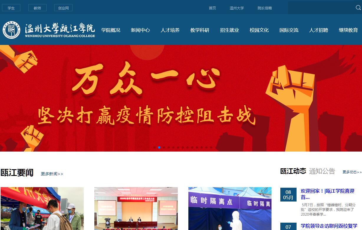 温州大学瓯江学院成立于2000年1月,由原温州师范学院创办,经浙江省人民政府批准设立;2004年由国家教育部批准为独立学院;2018年7月通过了独立学院规范设置省级验收。学院具有独立法人资格,实行董事会领导下的院长负责制,温州大学校长任学院董事长,中国工程院院士金宁一担任学院名誉院长。学院以“区域性应用技术型独立学院强校”为发展定位,致力于培养高层次应用技术型人才。在浙江省2015-2016学年普通本科高校分类评价中,学院名列教学为主型独立学院第4名。在浙江省教育评估院2017年公布的“用人单位对2016届毕业生的综合素质满意度评价”中,学院以94.73%的满意度在独立学院中排名第一;在其公布的“全省2016届毕业生一年后创业率排名”中,学院以6.39%的成绩位居全省本科高校第一。根据武书连2017中国265所独立学院学科排行榜,学院多学科进入全国前十强。学院位于温州市茶山高教园区,南眺罗山群峰,北蕴三垟湿地,校园占地面积504亩;校舍总建筑面积18.9万平方米,教学科研仪器设备总值6832.37万元,馆藏纸质图书81.68万余册,并共享温州大学的各类图书和中外文期刊数据库。学院下设6个二级学院,共有44个本科专业;面向全国15个省市招生,现有全日制在校生7570余人。学院拥有专任教师421人,专任教师中具有高级职称的占39%,具有硕博士学位的占81%。根据2017《中国大学评价》,学院教师创新能力在中国独立学院位列第14位。学院以区域经济与社会需求为导向,不断健全专业随产业发展的动态调整机制,构建了“通识教育平台、学科基础平台、专业基础平台、模块方向平台”四位一体、分层分类的应用技术型人才培养新模式。学院形成了班级企业化人才培养模式、订单式人才培养模式、校企合作人才培养模式、CDIO工程教育人才培养模式等特色人才培养模式;成立了“亚龙学院”等行业产业学院,打造产教融合示范载体。“基于创新创业教育的‘班企合作’人才培养模式创新与实践”获浙江省教学成果二等奖。“温州大学瓯江学院-浙江恒丰泰减速机制造有限公司实践教学基地”获批为省大学生校外实践教育基地,为首批获得省级该类项目立项的独立学院,以此为依托的《工业机器人减速器高精度高效率减速器开发》获得国家高技术研究发展计划(863计划)重大项目课题。与此同时,学院积极发展继续教育,适时发展研究生教育,形成多元化的人才培养层次。服务地方经济产业发展,以“特色专业对接区域优势,专业群对接产业链”为原则,深化“政产学研”协同创新。学院现建有23个科研机构与服务平台,其中市级平台4个;与浙江恒丰泰减速机制造有限公司、浙江亚龙教育装备有限公司等科技型地方支柱产业的龙头企业,及多家业内领军企业、中小骨干企业建立了深度合作关系。推进“瓯文化”传承创新,深入研究与推广瓯窑、瓯漆、瓯剧等温州地域特色文化,同时推进相关专业人才培养、创意文化发展、校园文化传播,积极努力构建地方文化高地。建成了瓯剧艺术研究与推广中心,瓯剧文化创意体验馆,瓯窑、漆器研究所,国学研究院,温州非遗研究与推广中心等。2018年,学院成功入选浙江省首批普通高等学校创业示范性学院。学院秉承温商精神,专创融合,构建起“通识+专业+实训+项目”四位一体的课程教学体系、“众创空间+创客实训基地+创业虚拟实训中心”的三大创业实践平台(面积分别为6000平方米、2000平方米、3000平方米)、“校+政+产+行+企”孵化链的多点联动的的创新创业人才培养体系,形成打通专业课内外、创业园内外、学院内外的创业教育生态链。学院培育了“专创融合、公益创业、师生共创、女性创业”四大创业教育特色,现为国家级创业教育人才培养模式创新试验区,列为温州市国家大学科技园温州大学瓯江学院分园;建有全国首个规模型师生共创孵化器(3000余平方米)、浙江省内首个女子创业学院、专创融合的实验班5个和创客工作坊7个。近年来,为社会输送了160多家成长型企业,涌现出傅智建、孙建强等优秀创业典型;毕业生一年后自主创业率平均在6%以上。借力“一带一路”战略机遇,深入推进与学院办学定位相匹配的国际高校的联系沟通,开展多种形式的合作办学,引入师资、课程、教材等海外优质教学资源,以国际化视角创新学院人才培养模式。根据浙江大学高等教育研究所2018年发布的《2017浙江省高等教育国际化发展年度报告》,我院位列浙江省独立学院第四。学院与美国戴顿大学开展3+1+1本硕项目,并与英国密德萨斯大学、美国休斯顿大学、德国欧福应用技术大学、澳洲昆士兰科技大学等10多个国家和地区的高校开展深入合作交流。每年提供近百项国外大学硕士直通项目、交流交换项目和游学项目。在校学生不仅可享受本院丰厚的海外交流奖学金,同时还能享受温州大学本部的国际合作办学资源。卿云漫漫,光华灿烂;夙兴夜寐,风雨兼程。面对未来,瓯江学院已经明确发展方向——坚持立德树人,坚持服务地方,为建成“区域性应用技术型独立学院强校”而努力奋斗。