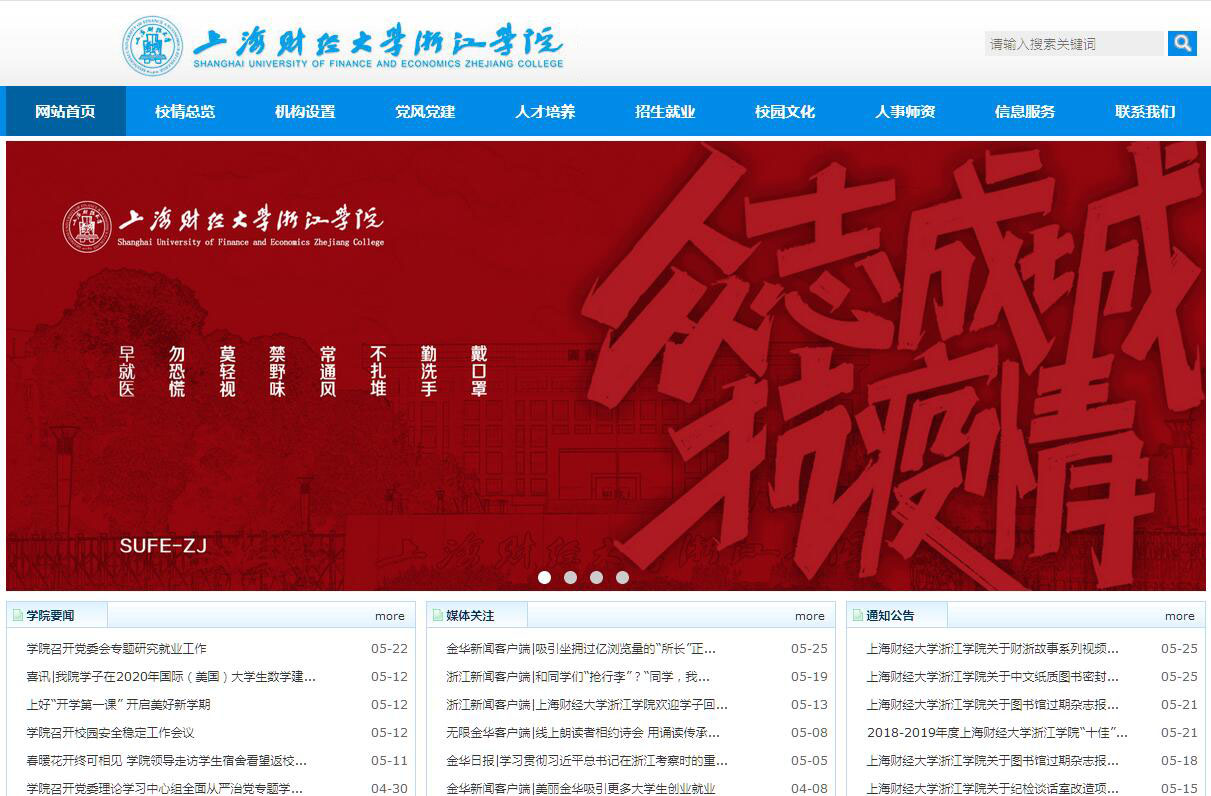 上海财经大学浙江学院由金华市浙中教育集团与上海财经大学合作举办,是一所按新机制和新模式运作、具有独立法人资格的全日制本科独立学院。2008年5月经国家教育部批准成立。学院坐落在著名的国家历史文化名城、全国电子商务之城金华,地处金华市环城南路多湖高教园区,毗邻金华市金东区政府,规划占地面积1005亩,实际占地面积829.63亩,校园建筑面积22万平方米,教学仪器设备1889.43万元,纸质图书64.3万册。学院交通便利,教学设施先进,生活设施齐全,校园环境幽静,是理想的求学之地。现有在校本科生6000余人,生源覆盖全国24个省、市、自治区。学院现有教职员工288人,具有副高以上职称100人,硕士及以上学历238人,另有来自中科院、国家发改委、上海财经大学、浙江大学、复旦大学、厦门大学等外聘教授57人,逐步形成了一支数量充足、结构合理、爱岗敬业、素质优良的师资队伍。学院坚持“共建共享共融共赢”的办学理念,紧密结合地方经济社会发展实际,秉承上海财经大学“厚德博学、经济匡时”的校训,依托母体学校的品牌资源优势,积极借鉴利用国内外优质高等教育资源,深化教育教学改革,强化学院内部管理,优化学科专业建设,为提高人才培养质量、服务区域经济发展奠定了坚实基础。学院设有会计学、财务管理、经济学、金融学、投资学、保险学、应用统计学、工商管理、物流管理、人力资源管理、市场营销、国际经济与贸易、国际商务、电子商务、商务英语、会展经济与管理等22个本科专业、6个专业方向,建有20个专业实验室、34个实习实训基地,已建成会计学、金融学、国际经济与贸易等三个浙江省新兴特色专业建设项目,“三位一体”自主招生、专升本教育、继续教育等不断扩大,初步形成了以财经类专业为主,经、管、文、理、工等学科协调发展的良好态势,学院综合实力和办学水平逐年提高。学院十分注重学生成长成才和个性发展的培养,通过新生始业教育、学业生涯规划、职业生涯规划、创新创业教育、参与社团活动等方式,不断提高学生的综合素质。如对立志考研的学生设立考研班、对有兴趣进行学术科研的学生配备学术成长导师、对优秀学生组织参加“赴上海财经大学访问学生”项目等,为大学生们提供更多的学习和上升空间。学院每年组织学生参加全国大学生“挑战杯”创业大赛、统计调查方案设计大赛、市场调查与分析大赛、财会信息化大赛、大学生英语大赛、大学生健康活力大赛、全球商业模拟大赛等各类专业竞赛和社会实践活动,为培养大学生的实践能力和创新创业精神搭建良好的平台。同时,积极开展与境外高校的合作交流活动,采取走出去、引进来的办法,充分借鉴国内外同类高校的先进经验,加大合作办学的力度,不断提高人才培养质量。目前,已与英国、美国、香港、台湾等知名高校建立了良好的合作关系。学院在金华市委市政府的直接领导下,在上海财经大学的关心支持下,全体师生员工以服务地方经济社会发展为己任,以建设地方性应用型本科高校为目标,团结一致,和衷共济,紧抓机遇,奋发有为,坚持走地方性、应用型、特色化的发展道路,为把学院建设成为全省乃至全国有一定影响力的应用型财经类本科院校而努力奋斗。
