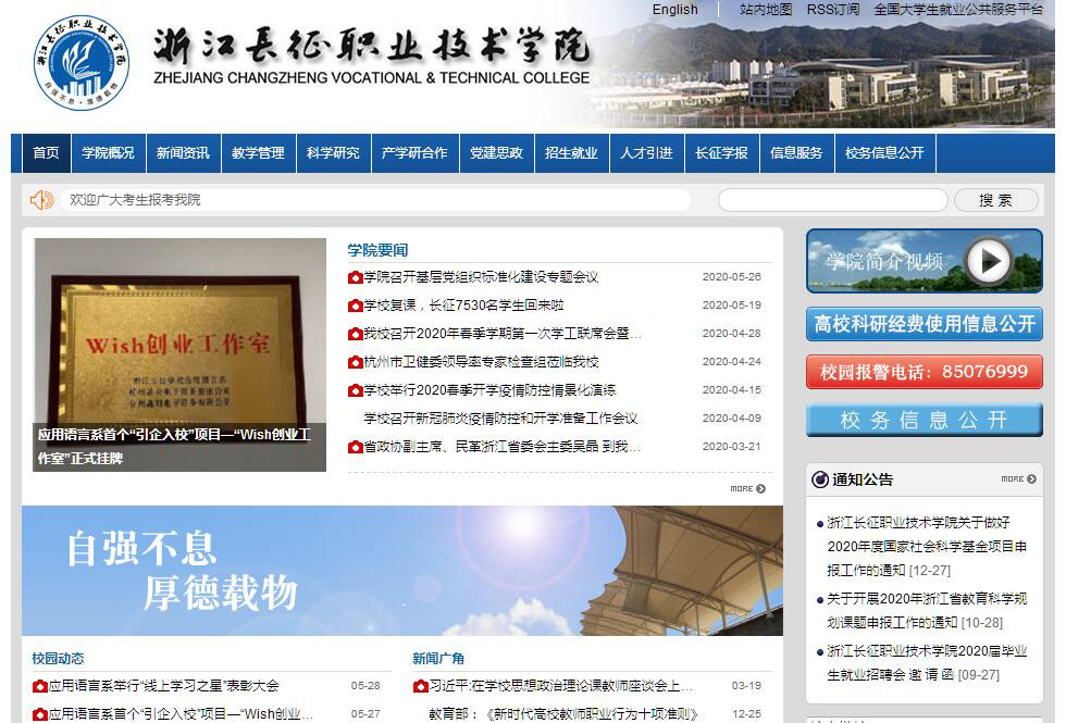 浙江长征职业技术学院是浙江省人民政府批准、教育部备案的全日制普通高等职业技术学院。学院位于浙江省杭州市西湖区小和山高教园区,共享杭城深厚的文化底蕴、丰沛的电商资源、完善的公共设施,坐拥小和山优美的自然环境、丰富的教学资源、便利的交通条件。学院设有财务与会计学院、经济学院、管理学院、人文学院、计算机与信息技术学院等五个二级学院和建筑工程系、智能技术系两个直属系,设有基础课教学部、思想政治理论课教学部以及中小企业会计研究所、中小微企业电子商务研究中心等9个研究所(中心)等。开设财务会计类、商务贸易类、智能技术类、计算机信息类、经营管理类、建筑工程类、应用语言类等七大类39个专业。国际经济与贸易专业为省级优势专业,会计、统计与会计核算、工商企业管理、电子商务专业为省级特色专业。学院拥有一支整体素质优良、教学经验丰富、教学水平高、结构合理的教师队伍。学院现有全日制在校生11000余人。学院教学设施完善,建有独立的实验实训楼、体育馆、风雨操场等教学场所,现有图书馆藏书125.67万册,建有校内实验实训基地115个。建成一个中央财政支持建设的电子商务职业教育示范实训基地,四个省级“十三.五”立项建设的跨境电子商务、中小微企业财务与会计、中小微企业服务与管理、中小微企业机器人应用等高职教育示范实训基地,以及工程管理、应用语言、网络信息、公共计算机、多媒体教学等五个省级实训基地。学院坚持开放办学,强化校企合作,产教融合,以学生为中心,以能力为本位,以人才培养为中心,以改革创新为动力,加强内涵建设,增强社会服务能力,全面提高教育教学质量,培养适应区域经济社会发展的高素质技术技能人才。与阿里巴巴、浙江省三建建设集团有限公司、国信证券股份有限公司、杭州市机器人协会、浙江顺丰速运有限公司、浙商博物馆等387家行业、企业、协会建立校外实习实训基地;与杭州跨境电商产业园区等开展现代学徒制订单式人才培养,为园区提供重要的人力资源保障,园区已经建设成为“浙江长征职业技术学院跨境电商人才培养示范园区”。学院办学39年来,秉承“自强不息、厚德载物”的校训,立德树人、崇学尚能,为社会培养培训各类专业技术人才40万余人,多次受到民革中央、各级人民政府和教育行政部门的嘉奖,先后被授予“民革全国办学先进集体”、第四届“黄炎培职业教育优秀学院奖”、浙江省“优秀民办学院”、浙江省“平安示范校园”、全国“民办职业院校人才培养创新奖”、全国“民办高职内涵建设优秀院校”、“全国商业服务业校企合作与人才培养优秀院校”等称号。学院党委也获得先进基层党组织等荣誉。学院十分重视大学生实践能力和职业技能培养,注重学生创业精神和职业素养的养成。在每年举办一届“大学生创业技能文化节”的基础上,积极鼓励学生参加校内外各类职业技能竞赛,取得了优异成绩。其中,财会类学生在第四、第五届“用友杯”全国大学生会计信息化技能大赛全国总决赛中荣获团体一等奖;计算机类学生在教育部举办的全国ITAT教育工程就业技能大赛中数次荣获一等奖、二等奖,在“蓝桥杯”全国软件和信息技术专业人才大赛中数次获得一等奖、二等奖,在第十一届、第十二届浙江省大学生程序设计大赛中分别获金奖和银奖,在2017年、2018年全国应用人才技能大赛中,获“匠心•民族魂”平面设计创新创意数个一等奖、二等奖、三等奖,获“兄弟连杯”移动互联网编程大赛二等奖;管理类学生在全国应用人才浙江省第三届高职高专院校管理案例分析大赛中荣获团体一等奖;经贸类学生在第四届全国商科院校技能大赛中荣获浙江赛区一等奖,在首届“沃土杯”在杭高校大学生网上创业大赛中获一等奖;人文类学生在浙江省首届高职高专英语写作大赛中荣获公共英语组特等奖等等。学院主动适应地方和区域经济社会发展需要,坚持以服务为宗旨,以就业创业为导向,走校企合作、工学结合的发展道路,突出为民营中小微企业服务的办学特色,打造“长征精神”校园文化品牌,培养德、智、体、美全面发展,具有良好文化素养、业务素质和职业道德的高素质技术技能人才,为地方和区域经济转型升级和社会发展提供强有力的人才和技术支持。