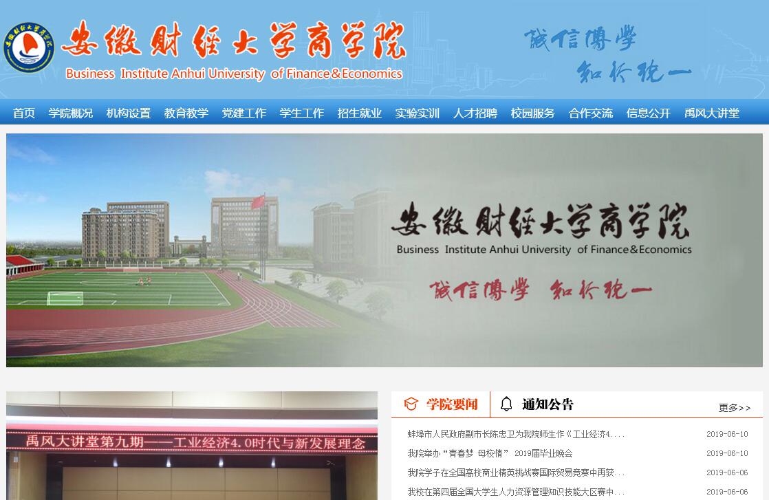 安徽财经大学商学院是2003年6月由安徽财经大学创办并经教育部确认的本科层次全日制独立学院,2015年9月遵照教育部26号令要求由安徽财经大学与祥兴集团合作举办。学院拥有禹会和龙湖两个独立校区,龙湖校区位于蚌山区龙子湖风景区西侧(宏业路255号),占地401亩;禹会校区位于禹会区涂山风景区东侧(东海大道7100号),占地1000亩,2017年8月正式投入使用。商学院设有会计学系、经济与金融系、工商管理系、财务与审计系、国际商务系、人文与艺术系等6个系级教学机构,1个基础教学部;拥有24个本科专业的举办权,其中会计学、国际经济与贸易、金融学、财务管理、市场营销、人力资源管理、工商管理、物流管理、广告学、英语(商务英语方向)、审计学、经济统计学、国际商务、资产评估、金融工程等15个本科专业处于人才培养之中。学院自成立以来,紧紧依托安徽财经大学的品牌优势和优质教育教学资源,加大教育教学改革力度,走内涵式发展建设道路,重视师资队伍建设,不断夯实育人基础。专任教师中具有高级职称的教师比例达到31.9%,博士(含在读博士)占专任教师比例达到37.2%,具有硕士学位以上的教师占专任教师比例达90.42%。省教学名师2人,省优秀教师1人,省教坛新秀5人,校教学名师3人,校优秀教师9人,校骨干教师11人,校教坛新秀3人。先后获得国家社科基金项目6项、国家自然基金项目2项、教育部人文社会科学项目3项、省厅级课题等近100项。在办学过程中,商学院充分发挥举办学校优势,主打经济管理品牌专业,注重学生综合素质提升,进行人才分类培养。围绕着应用型人才培养目标,加大教育教学改革创新力度,创新推行考试改革,助推形成良好的学风院风;创新并完善“三位一体”就业工作模式,切实提升毕业生就业率;积极搭建实验实训平台,大力开展专业实验;多年坚持开展创业意识培训和创业模拟实训,累计培训人数5000余人次;学历教育与执业教育相结合,校企合办“会计学ACCA方向班”; 创办学院“禹风”大讲坛,提升学院文化软实力,助推商学院的现代大学精神建设;注重加强学生实习基地建设,提高学生的实践能力和就业竞争力。办学以来,学院重视学生学以致用、应用能力的培养,积极组织学生参加国内外各类学科竞赛活动,并取得骄人成绩。近5年来,学院在各类竞赛中共获省级以上奖项200余项,其中国际奖10项、国家级奖项50余项。在全国大学生管理决策模拟大赛中共获奖35项,其中国家级特等奖4项、一等奖4项、二等奖2项;在全国商科院校技能大赛中共获奖9项,其中国家级一等奖1项、二等奖4项;在国内外大学生数学建模大赛中共获奖70余项,包括在国际数学建模竞赛中获一等奖1项、二等奖5项,在国内赛区比赛中获一等奖9项;多次获得学科竞赛优秀组织奖。目前全国大学生管理决策模拟大赛、全国大学生数学建模大赛均已成为学院特色品牌赛事。学院坚持以市场需求为导向,创新人才培养模式,严谨治教,注重质量,突出特色,办学水平稳步提高,社会知名度日益增强。自成立以来累计向社会输送了11253名毕业生,毕业生就业率平均达90%以上,受到用人单位好评。学院2010年荣获“安徽省先进独立学院”称号,2013年、2014年连续两年位居 “武书连中国独立学院评价榜”中国高水平独立学院第5名;2015年、2016年位居第4名;2017年位居第9名,其中教师创新能力排名第5名,教学科研效率排名第4名,毕业生质量排名第4名。今后,商学院将紧紧围绕提升办学质量、深化教育教学改革、积极转换管理体制机制,努力将学院打造成为适应地方经济社会发展需要的,以经济、管理学科为主,省内一流、在全国有一定影响力的应用型高等院校。