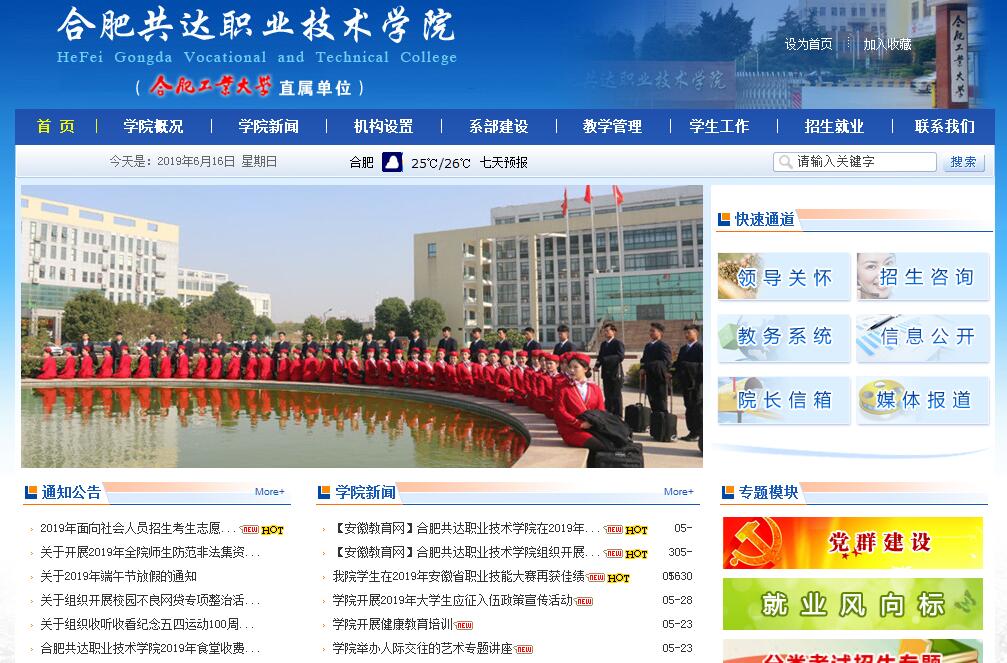 合肥共达职业技术学院(学校代码:14135)是经安徽省人民政府批准、国家教育部备案的省属普通高等学校。合肥共达职业技术学院创建于2007年,是合肥工业大学的直属单位。自办学以来,学院依托合肥工业大学优质的教育资源办学,在发展规划、专业建设、师资建设、图书资源、实验实训条件等多方面得到合肥工业大学的支持。学院党委隶属于合肥工业大学党委,学院党委书记、院长、副院长等主要管理人员由合肥工业大学委派。合肥工业大学重视合肥共达职业技术学院的师资队伍建设,选派合肥工业大学教师到学院任教,强化学院的专兼职师资队伍建设。学院九顶山路校区位于合肥新站高新技术产业开发区,毗邻合肥综合保税区、国家级液晶平板显示产业基地,地势开阔,楼宇隽永,校园人文气息浓厚,教学、生活、体育等配套设施齐全。校区占地329.22亩,建有综合教学楼、综合实训楼、图书馆、行政楼、学生公寓、汽车工程实训中心、工程训练中心、400米标准塑胶跑道运动场、硅PU篮球场和排球场等,校园总建筑面积10万余平方米。学院强调学生动手能力的培养,各类基础、专业实训室设施完善,满足各专业教学培养要求。学生可在学院计算机、电子电工、单片机应用、电子产品装机、电工维修与工厂供电、电子与通讯技术、可编程应用、电机拖动与传感器检测、机床电气PLC、力学、建筑测量、水力学、土力学、建筑材料、建筑结构、动漫设计、创业培训等实训室以及合肥工业大学工业培训中心、机械工程和机械CAE实训室、电气与自动化专业中心实训室、校企共建实训室、实训基地等进行实践学习和能力培训。学院充分发挥工科的特点和优势,工学结合、校企合作,培养基础理论扎实、知识结构合理、专业技能熟练、适应岗位快、创业能力强,面向生产、建设、管理第一线急需的应用型、技能型人才。学院往届毕业生供不应求,被评为“安徽省普通高校毕业生就业工作先进集体”。2016年,学院获得安徽省高职院校技能大赛一、二、三等奖15项,其中一等奖2项。学生谢春良荣获2016年安徽省先进成图技术与产品信息建模创新大赛“尺规绘图组”一等奖。学生周茗皓荣获2016年教育部“西门子杯”中国智能制造挑战赛全国总决赛(高职组)二等奖。2017年,学院获得安徽省高职院校技能大赛二等奖2项、三等奖3项。学院土木工程系代表队获得第二届全国建设类院校施工技术应用技能大赛(高职组)团队三等奖。