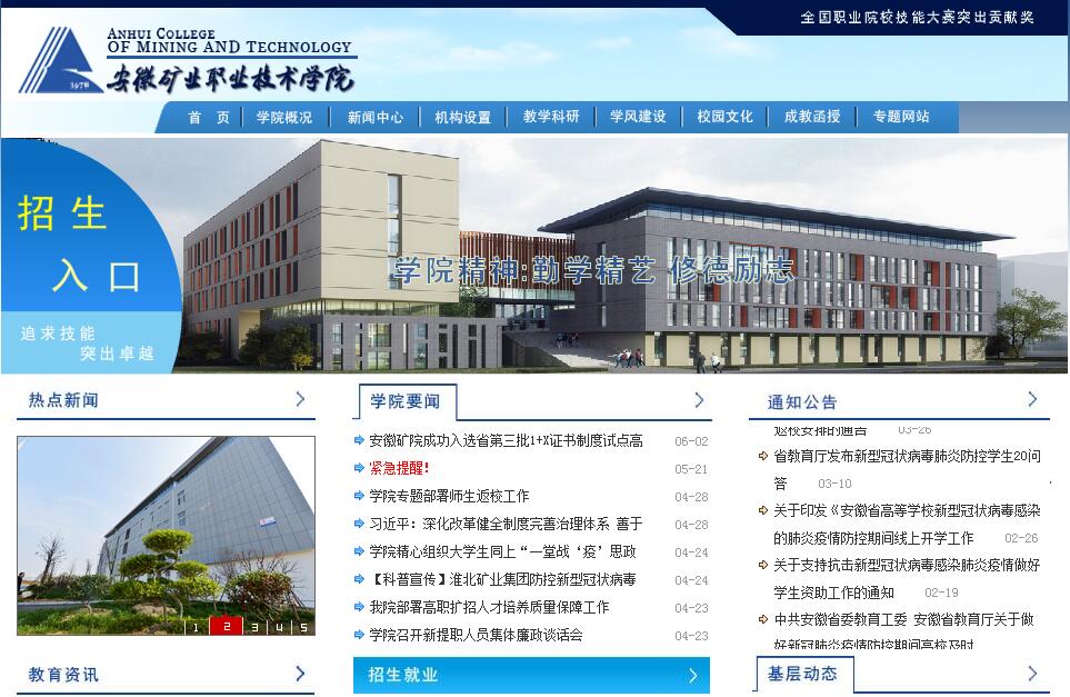 安徽矿业职业技术学院坐落于安徽省淮北市市中心,北枕相山,南临濉水,是经安徽省人民政府同意设置、教育部批准建立的全日制普通高等职业院校。安徽矿业职业技术学院的前身是安徽淮北矿业集团公司党校、干校、职工教育中心,业务主管单位是安徽省教育厅。学院前身创建于1978年,现有机电工程系、能源工程系、机械工程系、自动化与信息工程系、公共课教学部、培训部、成教处、实训中心等教学单位。安徽矿业职业技术学院拥有东、西、新三个校区,占地800余亩,校舍建筑面积33万平方米,拥有教学楼、办公楼、学术报告厅、电教馆、餐饮洗浴大楼、标准化学生公寓和价值3000多万元的实习实训设备。校内建有总建筑面积达23800平方米的“实训基地和安全警示教育基地”,有电工、电子、PLC、液压、通风等40多个实验室和语音室、大型微机室;有矿机、矿电、机电修配、数控、钳工、家电等30多个实习实训车间,可以同时为6000人提供实习实训,充分满足教学、实训、科研和人才培养需要;除此之外,还拥有校外实训基地30多个。学院现有纸质图书13.42万余册,电子版图书1.5万册以上,建有电子图书系统、校园一卡通和计算机网络服务体系。学院现有教师188人,在现有教师中,专职教师160人,兼职教师28人;副高级以上专业技术职务的教师85人。安徽矿业职业技术学院将依托煤焦化电盐行业,辐射周边区域行业和企业;以专科学历教育为主,适度发展非学历教育和岗位培训;以工科类专业为主,工科、理科相互支撑,协调发展;以加强学生职业能力培养及职业道德养成为核心,为生产建设管理一线培养高素质技术技能型人才。2012年成功举办全国职业院校技能大赛“淮北矿业”杯(煤矿安全),圆满完成了六个赛项的比赛任务,得到教育部、省教育厅和参赛院校的广泛好评,因此安徽省教育厅获国家技能大赛“优秀组织奖”,淮北矿业集团被国家二十三部授予“特殊贡献奖”。我院选手在大赛上取得4个一等奖,2个二等奖的骄人成绩。2009年,首期设置工科类煤矿开采技术、矿山机电、机电一体化技术、电气自动化技术、数控技术、应用电子技术六个专业,计划招生800人。经过4年的发展,结合地方经济建设和社会发展对应用技术专业的需求,科学调整和增设专业,专业设置增加到29个。多年来,校园基础设施、教学设备等办学条件进一步完善,具有了较强的办学实力和水平。学院坚持走特色办学之路,不断深化教育教学改革,注重内涵建设,努力把学院建设成为行业知名、特色鲜明的高等职业院校。