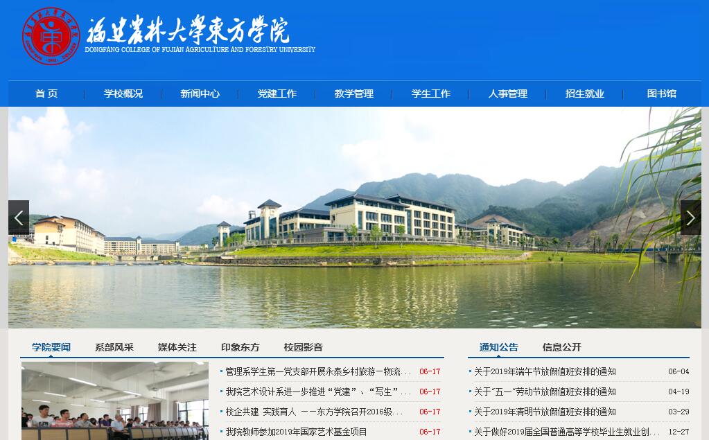 福建农林大学东方学院2002年由福建农林大学申办,是教育部批准设立的以财经管理类学科为主,多学科协调发展,服务区域经济和社会发展的全日制本科独立学院。2005年,学院通过教育部专家组的专项评估。2011年,通过省教育厅学士学位授予权单位审核评估。学院新校区位于福建省福州永泰葛岭,校园占地面积近800亩,校园风景秀丽、四季梅李花香。整个校园分为教学行政区、学生生活区、图书馆与体育运动区、对外交流与教学实训区、景观内湖等五大部分,新校区办学设施齐全,万兆光纤网络覆盖全校,智慧校园建设初具规模;建成了省内高校领先水平的云桌面系统和云数据共享平台,初步实现云财会实验模拟仿真,建成了20多个专业教学实验室和校内经管实训基地,为学生创造了一流的学习和生活条件,是莘莘学子求学的理想园地。学院依托具有80多年办学历史的福建省一流大学重点建设高校--福建农林大学,共享其优质办学资源。不断提升办学内涵和人才培养质量,现设有经济系、管理系、会计系、文法系、信息工程系、艺术设计系等6个系和1个公共基础教学部,共30个本科专业,涵盖经、管、文、法、农、工、艺术7大学科门类,在校生近8000人。学院坚持以应用型人才为培养目标,积极开展校地校企合作,与永泰县合作共建全国首个县级“乡村振兴研究院”,建立120多个校外实践教学基地。加强对外合作交流,与台湾铭传大学、台湾华梵大学达成了互派交换生,师资资源共享。学院高度重视学生综合素质和创新创业能力培养,成立创新创业学院,实施“三全”育人模式,构建以“社团活动+学科竞赛”为载体的人才培养体系,打造“一系一品”的社团精品活动,鼓励学生积极参与课外学术科技作品竞赛、“互联网+”大学生创新创业大赛。学院曾获福建省高校校园文化建设优秀成果三等奖;在"园冶杯”大学生国际竞赛、“蓝桥杯”全国软件设计大赛、“用友杯”全国大学生创业设计暨沙盘模拟大赛、中国高校美术作品学年展、全国英语竞赛等学科竞赛中获得优秀成绩。办学迄今已培养两万多名毕业生,为福建省乃至国家经济建设和社会发展输送了大批高素质应用型人才。2017届毕业生就业率达96.20%。展望未来,学院将紧密结合国家社会经济发展对应用型人才的需求,秉承“明德、诚智、博学、创新”的校训精神,朝着建设有特色、高水平的应用型本科高校这一目标奋勇前进。