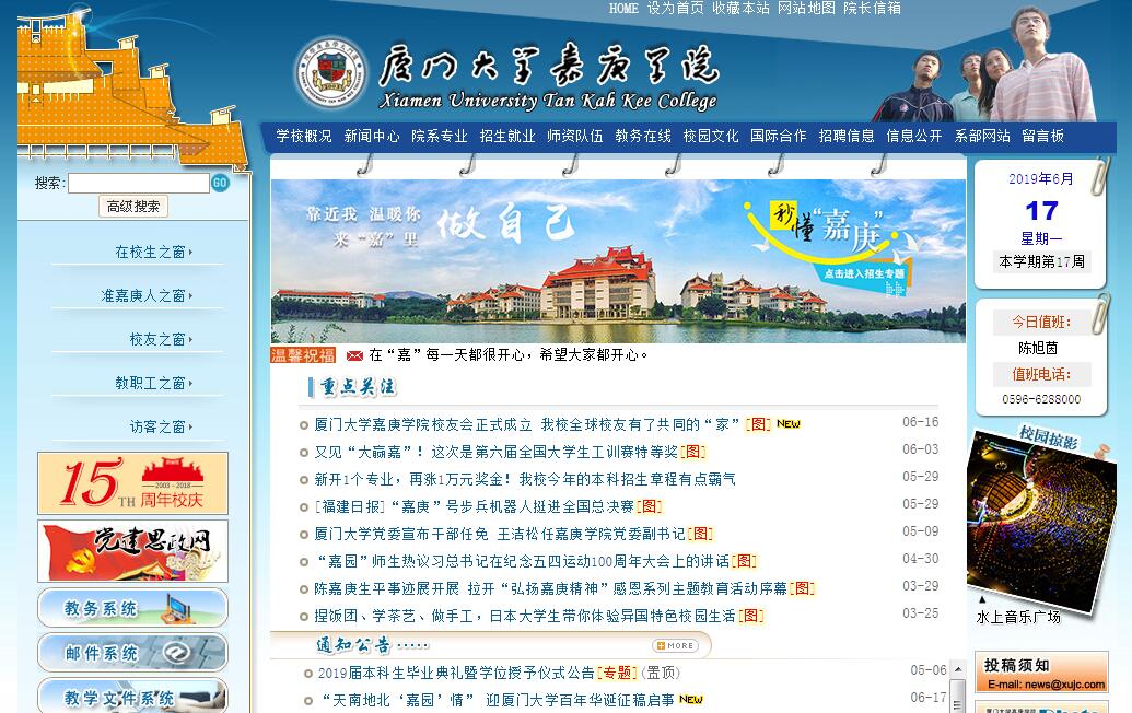 厦门大学嘉庚学院创办于2003年,是经国家教育部批准,由教育部直属重点大学厦门大学和厦门嘉庚教育发展有限公司共同举办的,按新机制和新模式运作的独立学院。2010年7月,学校获评“全国先进独立学院”。2011-2018年,学校连续8年入选腾讯网教育产业价值榜,位列独立学院榜榜首,先后获得中国最具品牌价值独立学院、中国最具品牌影响力独立学院、最具领导力独立学院、最具知名度独立学院、品牌实力独立学院、综合实力独立学院等称号。在《2012-2016年全国普通高校竞赛评估结果(本科)TOP300》中,学校位列全国普通高校第180名、民办高校及独立学院第1名;在《2014-2018年全国普通高校学科竞赛评估结果(本科)TOP300》中,学校位列全国普通高校第179名、民办高校及独立学院第1名。在中国侨联和凤凰卫视发起的2017-2018华人教育家大会暨“聚焦中华”教育盛典、2018-2019华人教育家大会暨荣耀盛典上,学校分别获评“最具国际影响力独立学院”“国际化办学典范高校”。2003年10月21日,时任国务委员陈至立、福建省委副书记黄瑞霖为厦门大学嘉庚学院揭牌,掀开了嘉庚学院向优质大学奋进的历史。历经15年的跨越发展,嘉庚学院目前已设有涵盖理学、工学、文学、经济学、管理学、法学、艺术学等学科的9个学院、5个独立系、3个教学部、2个实践教学训练中心和1个科研中心,51个本科专业,81个专业方向,拥有在校本科生约19000人、硕士研究生70人(与厦门大学联合培养)。嘉庚学院自办学之日起在福建省即在本二批次招生,生源质量逐年提高,近五年嘉庚学院在全国招收本一线上考生860人,全国本二线上考生数突破96%。嘉庚学院面向全国31个省(自治区、直辖市)招生,是福建省省属院校中省外生源比例最高的院校,省外学生人数占在校生人数的58%。嘉庚学院位于厦门大学漳州校区,校区占地2726亩。校园依山面海而建,与厦门大学思明校区隔海相望。校园建筑以嘉庚风格建筑为主,中西合璧,恢弘大气,错落于湖光山色之间,给学子们营造了沐浴书香、畅游学海、静学深思的修读氛围。“以学生为中心”是嘉庚学院的核心办学理念。嘉庚学院坚持运用这一理念指导办学实践,实施“宽口径、厚基础、重能力、求个性”的人才培养模式,推行“服务与管理”并重的学生工作模式,全力营造因材施教、因势利导、尊重个性、激发潜能的教育环境。嘉庚学院为学子成长成才提供了一流的软硬件设施。现代化气息浓郁的图书馆,提供198万册藏书和优雅宁静的学习环境。完善的实验室配套、投资5200万建成的工业实训基地,提供强化动手能力的优越平台。与339家知名企事业单位合作建立的实习基地,构筑实习预就业的畅通渠道。富有嘉庚学院特色的转专业制度和教师答疑制度,使学子在以兴趣为导向的学习环境和亲密的师生关系中快乐成材。嘉庚学院遵循“教学与科研并举,以有效教学见长”的发展思路,在不断提高教学质量的同时,将大力发展科研工作作为学校新一轮跨越发展的重大举措和生长点之一。一方面,学校立足于培养应用型、复合型人才的办学定位,博采众长,大胆创新,既严格遵循教育规律,规范办学,完善教学质量保障体系,又全力加强师资队伍建设,努力推进各项教学改革;另一方面,学校加大力度,循序渐进,逐步推进科研工作,提升学校的整体办学水平和教育质量,增强社会服务能力。如今,学校已拥有一支由900余名训练有素、教研并长的专兼职教师构成的师资队伍,481项“教学质量与教学改革工程”项目(国家级117项、省级364项),7项福建省高等教育教学成果奖(含1项特等奖)。人才培养也取得显著成效,学生在国际性赛事获奖155项,全国性赛事获奖1006项,区域性赛事获奖160项,全省性赛事获奖1558项,日益树立起“综合素质高,创新精神强,实践能力突出”的品牌形象,受到用人单位的普遍欢迎。近几年,在学校的大力推动下,科研工作也取得突破性进展,目前已拥有省级科研创新平台2个、校企合作创新平台8个、各类科研项目392项(省部级以上重要项目61项)。开门办学,强力推进国际合作,是嘉庚学院一直遵循的办学宗旨。在学校的专任教师队伍中,活跃着来自美国、英国、日本、澳大利亚等各国的外籍教师的身影。学校与美国、英国、日本、新加坡、加拿大、新西兰、澳大利亚、法国、荷兰等国家的多所高校开展了校际交流与合作,并与19所海外高校建立了人才培养合作关系。学校也积极与香港、台湾地区高校展开交流活动,与5所台湾地区大学建立校际合作关系。在校主陈嘉庚先生“自强不息,止于至善”的精神指引下,嘉庚学院坚持规范与创新并举的发展思路,努力为学生提供优质教育,为社会培养合格适用的人才。2014年开始,嘉庚学院迈入新一轮跨越发展,提出“教学与科研并举,以有效教学见长”的发展思路,以制度建设与队伍建设为立足点,以实践教学、开放办学、学科建设、科研工作、研究生教育为生长点,打造特色,树立品牌,努力实现成为国内同类高校中一流的、获得国际广泛认可的、以有效教学见长的一所新型优质高等学府的高远愿景。