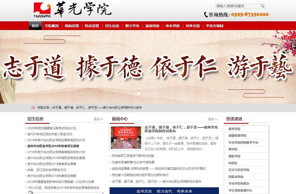 泉州华光职业学院位于东亚文化之都、“海上丝绸之路”的起点、国际花园城市、中国品牌之都、全国最佳魅力海滨城市、著名侨乡——泉州市,是一座充满文化艺术氛围的花园式高等学府。学校现占地730亩,建筑面积近20万平方米。学校设有摄影学院、运动科技学院、艺术设计学院、建工学院、商学院、健康养老产业学院、婚庆产业管理学院和教育学院等8个二级学院,设置36个专业,建立一批国家级、省级职业技能鉴定站和校内外实训基地。招生规模持续稳定,生源质量不断提高,学校与企事业单位签订人才合作协议书,毕业生就业率连续五年达98%以上,摄影、鞋服等特色专业就业率100%,人才培养质量得到社会高度赞誉。2016年6月顺利通过教育部人才培养工作二轮评估,2017年积极创建福建省示范性现代职业院校,是泉州市支持升本高校。学校连续三届被评为“福建省文明学校”,先后荣获“福建省职业教育先进单位”、“全国科研兴教示范单位”、“中国摄影名校”、“全国摄影业百强企业”、“全国艺术教育新人奖”、“全国摄影业管理成就奖”等荣誉称号。学校按照“崇德、敬业、精艺、创新”的校训精神,遵循高等教育发展的规律和技术技能型人才培养与成长规律,着力提高人才培养质量。学校坚持“面向产业、服务地方”的办学理念,紧密对接泉州海丝文化、轻工纺织、电子商务等主导和新兴产业,坚持“优化(传统专业)、培育(新兴专业)、集群(协调发展)”的专业发展思路,优化专业布局,着力专业调整,重构专业体系,提升专业内涵,夯实专业基础,突出专业特色。构建协调发展的专业体系和以省级精品、示范、重点专业为支撑,具有集聚各种资源能力的开放专业办学平台,形成摄影摄像技术、鞋类设计与工艺、服装设计、室内设计技术、电子商务、建筑工程技术等专业群。积极探索构建“校企双主体”人才培养体系,建设“华光创客空间”为学生提供创新创业环境。学校先后同台湾、韩国等国(境)内外20多所大学建立合作关系。2017年继续与泰国曼谷吞武里大学联办海外教育学院,在中国境内招收本科、硕士学生赴泰留学。积极开展闽台“校校企”联合培养技术技能型人才。近年来,学校承办了多个国际比赛及学术研讨会:国际新闻摄影高峰论坛、首届海峡两岸大学生摄影创作大赛、华光杯海峡两岸高校摄影季赛等,拓宽了师生的学术交流渠道,提升了学校的对外声誉。学院不断开拓创新,积极进取,正在为申办具有鲜明特色的应用型地方性本科院校而奋斗。