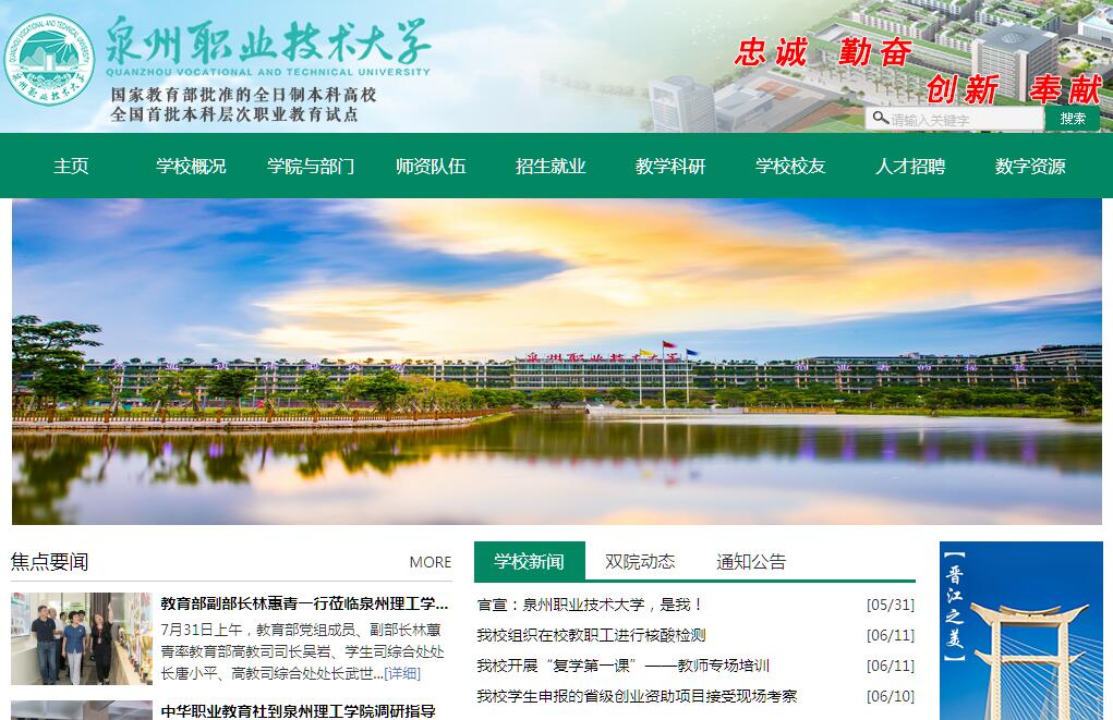 泉州职业技术大学,前身是1986年创办于晋江市金井镇的“晋江摩托培训学校”,1994年发展成为“福建省摩托汽车培训学校”,2002年“泉州中营职业学院”正式建校,2007年,经教育部备案更名为“泉州理工职业学院”,2018年12月获教育部批准升格本科,暂定校名为“泉州理工职业学院(本科)”,2019年5月,教育部正式函告福建省人民政府,更名为“泉州职业技术大学”,系全国首批本科层次职业教育试点学校。首批设置机械设计制造及其自动化、汽车服务工程、计算机应用工程、土木工程、油气储运工程、财务管理、电子商务、服装与服饰设计、数字媒体艺术、学前教育等10个职业本科专业”。学校目前拥有一校三区,主校区位于中国品牌之都一一晋江市,接壤沈海高速公路,毗邻高铁晋江站。泉州产学研园区地处泉州市中心(客运中心站旁),是引企入校、工学结合、学生顶岗实习、创业孵化的品牌园区;金井校区是学校的发祥地,主要作为教学工厂建设基地,从而形成“主体坐晋江、窗口设泉州、辐射八闽、一校三区”的办学格局。学校以“产业伙伴型大学”作为办学定位,以“创业者的摇篮”作为育人定位,积极探索实践产学研一体化的人才培养模式。以培养学生的一技之长和全面提高综合素质为育人目标;全面实施双证书培养,坚持全员育人、全程育人,着力培养学生健康体魄,坚强意志、创新意识和创业能力,所培养的具有晋江模式基因的创业者深受社会欢迎,形成了自身鲜明的办学特色与优势。学校开设中营汽车学院、智能制造学院、能源学院、人居环境学院、商学院、财经学院、文化旅游与体育学院、艺术传媒学院、通识教育学院、马克思主义学院共10个学院35个专科专业。在校生5944人,专任教师335人,现有教学科研仪器设备值6651.76万元,拥有校内教学实践、实习基地107个,校外实践、实习基地174个;图书馆藏资源丰富,现有纸质图书52.24万册。学校承担省级教育改革项目6项,省级创新创业教育改革试点专业4个,省级二元制试点专业3个,省级现代学徒制试点专业4个,建成1个省级服务特色专业群、1个产教融合示范专业点,3个省级示范专业,2个省级精品专业。获省级教学成果奖5项(其中特等奖1项、一等奖1项),1个市级名师工作室。学生竞赛获国家级奖项120项、省级奖项344项;教师参加省级以上业务能力大赛获奖85项。学校科研成果突出,建设了省级院士专家工作站、应用技术协同创新中心、应用技术工程中心等13个省市科研平台,科研平台拥有量位居全省职业院校、民办高校首位。承担市厅级以上科研项目172项、横向课题93项,获得国家专利156项(在校生规模的2.62%),向社会、政府提供咨询报告52篇,教师出版教材104部、发表论文618篇,获得省部级科研成果奖21项。
