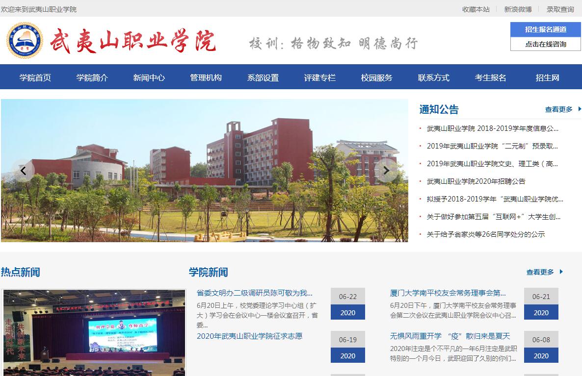 武夷山职业学院成立于2007年,是一所由台商投资兴办,并经省政府批准、国家教育部备案的全日制普通高等职业院校。学院已建成占地500亩,建筑面积达8万平方米的花园式校园。学院以“格物致知,明德尚行”为校训,以“立足武夷,连接两岸,服务福建,辐射全国,全力打造与现代服务产业融合度的职业院校”为办学定位。依托武夷山“双世遗”的世界级名片,主动融入新福建经济建设和大武夷旅游经济圈,把学院建成规模适中、特色鲜明、优势突出的地方性高职院校。在专业建设方面,提出了六个“一”的专业建设目标,即:每个专业至少有一名来自相关行业具有高级职称的专业带头人;每个专业至少有一个校内生产性实训实践基地;每个专业至少有一本和企业共同合编的校本教材;每个专业群至少有一个中级以上职业技能鉴定机构;每个专业至少要与一家大型的、稳定的企业合作;每个专业群至少要有一个与台湾兄弟校的合作项目。目前,学院依据闽北产业对技能型人才的需求,构建了5个专业群(旅游餐饮专业群,财金专业群,茶产业专业群,建筑工程专业群,视觉设计专业群)。开设23个高职专业。2009年6月,学院被福建省教育厅确定为首批闽台联合办学先行先试校。近年来,学院积极开展闽台高职教育交流合作,探索闽台“校-校-企”合作办学模式。先后与台湾的北台湾科技学院、吴凤科技学院、南荣技术学院、美和科技大学等院校合作就师资互派、教材共享等方面签订《合作办学协议》。与台资企业华夏民族城、厦门日月谷酒店等单位共同制定“校-校-企”人才培养方案、共同开发教材。学院自创办以来,先后聘请了台湾“餐旅教父”李福登教授为名誉院长、台湾大学机电博士茆政吉为院长、中国政治文化大学博士林鸿海为执行院长,引进台湾教师到校开展模块教学,闽台合作人才班3个。我院主办了两岸职业教育交流研讨会5次、朱子文化交流会4次。迄今 共计70多位学生赴台湾学习, 20位教师及管理人员到台湾合作院校学习交流。