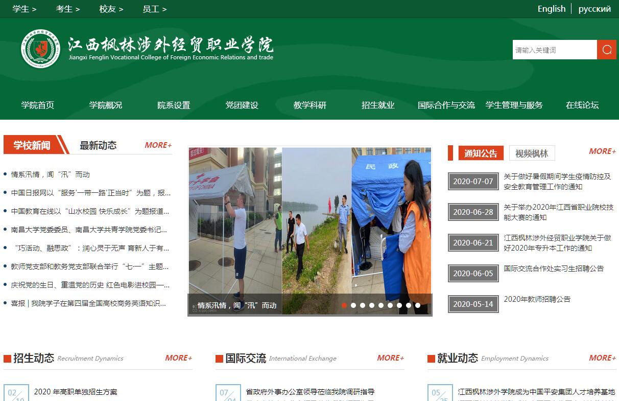 江西枫林涉外经贸职业学院成立于2003年,是经江西省人民政府批准、国家教育部备案、以培养涉外型人才为特色的全日制普通高等专科院校。学院位于江西省赣江新区永修组团境内,距离南昌市中心城区40分钟车程。校内各项学习、生活设施齐全,教学行政用房达7.6万余平方米。学院以服务一带一路企业为宗旨,以引进国际优质教育资源为办学目标,突出涉外办学特色,先后与加拿大、美国、俄罗斯、泰国、马来西亚、韩国、格鲁吉亚、乌克兰、哈萨克斯坦、保加利亚等10个国家的20所高校建立了教育交流关系。学院秉承古代书院的教育模式,推崇修身养性的教育理念,践行远离尘嚣,褪去浮华,潜心修学,成就自我的校训,全面提倡博雅教育,着力培养学生批判性思维,努力实现强其骨,明其心,实其能之实用人才培养目标。办学以来,学院积极探索和推行产教融合、工学交替的教学模式,有效地提升了学生的技能与个人能力。通过多年的发展建设,学院已逐渐形成了以企业高级技师、海归学者为主的中外教师队伍,现有专任教师115人,兼职教师60人。专任教师中具有高级职称教师23人,中级职称教师39人,具有博士、硕士学位教师42人。新时代,新征程,新作为。发展中的江西枫林涉外经贸职业学院,将不忘初心、牢记使命,全面贯彻落实党的教育方针,坚定社会主义办学方向,坚持立德树人根本任务,努力为区域经济发展做出新的更大贡献。
