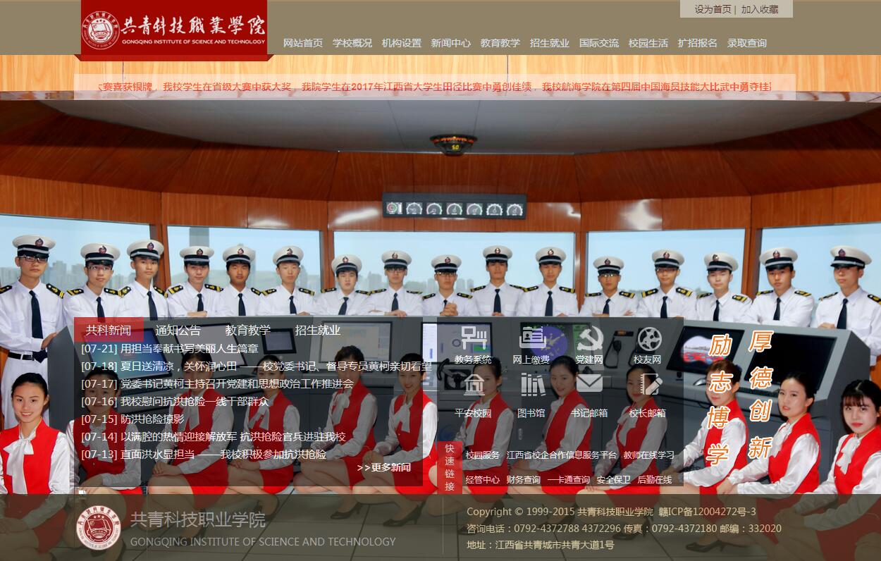 共青科技职业学院是一所经江西省人民政府批准、教育部备案的全日制民办普通高职院校,是江西省唯一一所经国家交通部海事局批准的具备“国际远洋船员培训资质”的高等院校,并评定为A级海船船员培训机构。是江西职业教育十佳示范学校(高职类),江西省批准列入“十三五”升本规划学校。学校创办于2004年,已有15年的办学历史。学校位于“让青年来了就不想走”的共青城市,北望匡庐,东临鄱阳,仁山智水,地灵人杰。学校秉承“励志、博学、厚德、创新”的校训,坚持“工科为主,航运为特”的办学特色,立足江西,面向全国,着眼行业发展,关注社会需求,以立德树人为根本,以服务江西经济社会发展为宗旨,以促进就业为导向,建成了以航海技术、轮机工程、机电工程、信息工程等工科为主,管理、经济、艺术等学科协调发展的专业体系,着力培养高素质技术技能型人才。学校现设有机电工程学院、信息工程学院、建筑工程学院、航海学院、经管学院、艺术学院、教育学院、护理学院、创新学院等9个二级学院和2个教学部。开设有机电一体化技术、计算机网络技术、航海技术、轮机工程、会计、艺术设计等41个专业。现有全日制在校生6041人。学校坚持发展学生、成就教师、以人为本、和谐发展、建设幸福共科的人文理念,坚持以人才培养为中心,深化专业内涵建设,推进课程体系、教学模式改革,不断创新校企合作、产教融合的育人机制,注重加强学生技术技能积累,形成了融人文素养、职业精神、职业技能为一体的育人文化,人才培养质量不断提高。近三年,我校学生在国家与省级各类专业技能大赛中共获奖126项。其中全国技能大赛中共获奖39项(一等奖5项、二等奖26项,三等奖7项,其他1项);省级各类专业技能大赛获奖87项(一等奖18项、二等奖23项、三等奖23项、其他1项、体育类获奖22项)。航运类专业学生连续二年参加了长江海事局举办的海员技能大比武,与本科院校同台竞技,蝉联团体总分第一名,两次获操艇项目第一名、获知识竞赛第一名的优异成绩;学校设有校内勤工助学、技能大赛奖助学等助学基本项目,毕业生考取专业技能证书通过率达98%以上,同时毕业生综合素质高,动手能力强,历年就业率均达到97%以上,用人单位对毕业生满意率均在95%以上,在江西省教育厅2016-2018年度毕业生就业评估中获“优秀”等级;学校大力支持和鼓励学生自主创业,市政府与学校共建创新创业孵化中心,学校的大学生创业项目已入驻其中。学校坚持人才强校战略,面向全国招聘人才,鼓励和支持年轻教师专业发展和学术水平提升。学校有一支年龄、学历、职称、学缘结构合理的师资队伍。现有专任教师341人,其中副高及以上职称159人,占专任教师46.63%;具有研究生学历的170人,占专任教师49.85%;“双师型”教师173人,占专任教师50.73%。有省级教学名师1人;并聘请了胡德平、欧阳自远院士等一批专家、学者为客座教授,定期来到学校“鄱阳论坛”讲学。学校积极鼓励广大教师开展科学研究和技术创新。近三年,学校共承担省级科研课题40项,公开发表学术论文288篇,其中SCI收录及核心期刊48篇,出版专著18部、教材45部,获国家专利授权98项。学校获省级优秀教学成果奖1项,获省级优秀社科奖2项,校级教学成果奖7项,教师论文及艺术作品获奖26项,各类教学项目获奖29项。2016年,学校顺利通过了教育部全国高职院校评估;近三年,学校均以优秀的成绩通过了江西省教育厅高职人才培养工作年检。学校坚持走产、学、研、用相结合的道路,现有工程技术研究中心、共青精神研究中心、智能制造研究中心、智能航运研究中心等四个校级研究中心;建有131个校内实验、实训室,其中有省财政投资664万兴建的电气自动化实验室、工业机器人技术实训室等实训实验室15个。有与省内外企业共建共享的校外实训基地113个。学校大力开展国际交流与合作,目前,已与美国加利福尼亚州旧金山市硅谷圣马特奥三学院正式签订了合作办学协议,并与韩国大邱大学和南部大学结成为友好姊妹学校。学校现有甘露和高新技术产业开发区两个校区,西海航运培训基地1个,校办企业共青城航天科技有限公司1个。学校占地面积93.96万平方米(1409亩),已取得土地证67.16万平方米(1007亩);校舍建筑总面积22.69万平方米(已办理房产证的有21.44万平方米)。教学科研仪器设备总值1.0125亿元。纸质图书70.4万册,电子图书120万册,有中外期刊208种,电子期刊8100余种。学校坚持“工科为主、航运为特”的办学道路,以“人工智能”为引领,在专业设置上,以航海技术、机电工程、信息工程等工科为主,兼顾管理、经济、艺术等协调发展,不断促进学科之间的交叉与融合,努力形成“人工智能+”的复合专业培养新模式,构建对接江西区域经济社会战略发展的“新工科”专业群,不断深化教学改革,促进产教融合;建立和完善科技创新与成果转化、应用研究与产业发展导向相结合的科研体制和机制,不断提升科研能力,走产学研用相结合的科技创新之路,扎实推进社会发展与科技应用等方面的研究,努力把学校建设成为具有鲜明特色和较高水平的应用型本科院校,培养服务地方经济发展急需的高素质应用型人才。新的时代给我们提供了良好的发展机遇,国家积极支持社会力量举办高等教育。学校举办者具有明确的教育理念、办学思想和人才