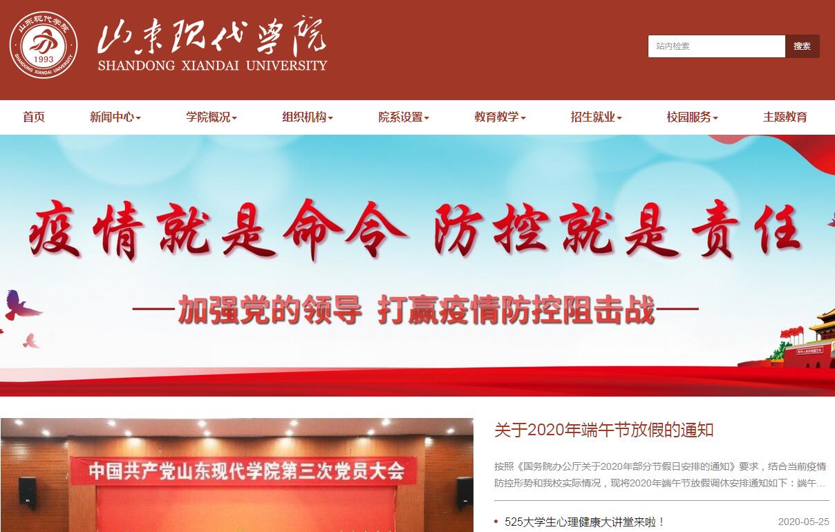 山东现代学院创建于1993年,2003年在山东民进中西医进修学院和山东现代计算机专修学院的基础上,经山东省人民政府批准,国家教育部备案,成为具有独立颁发学历文凭资格的全日制普通高校山东现代职业学院。2015年4月,国家教育部批准在山东现代职业学院的基础上建立应用型普通本科高校——山东现代学院。学院占地面积1266亩,现有在校生万余人,下设电子信息学院、汽车技术学院、建筑工程学院、经济管理学院、护理学院、医学院和人文学院等7个二级学院,开设护理学、康复治疗学、药学、学前教育、交通运输、汽车服务工程、计算机科学与技术、电子信息工程、网络工程、工程管理、工程造价、土木工程、市场营销、物流管理、汉语国际教育、中药制药、数字媒体技术、体育经济与管理、视觉传达设计、财务管理、中药学、绘画、舞蹈表演、人工智能、数据科学与大数据技术、医学检验技术等26个本科专业和21个专科专业,形成了以工学和医护为主体,工、医、管、教育、文、艺术等多学科协调发展的学科专业建设格局。校内建有医学、护理、电子信息、计算机、汽车技术、经济管理、建筑工程、学前教育等9个实验实训中心和2个校企共建生产性实训基地;校外与285家企事业单位合作,建立了实习实训就业基地。在董事长刘春静教授的正确领导下,学院秉承“天道酬勤”的校训和“立德树人,知行合一”的办学理念,以教学为中心,不断加大办学投入,优化办学条件,提升内涵建设,经过全院教职工的共同努力,发展成为桃李满天下的万人大学。