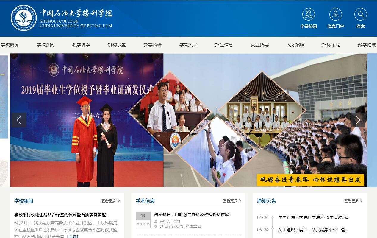 中国石油大学胜利学院是国家教育部批准设立的全日制普通本科高等学校,是由教育部直属高校中国石油大学(华东)、国家特大型企业胜利石油管理局在优化整合有着25年办学历史的原胜利油田师范专科学校优良办学资源基础上,按新机制、新模式合作举办的规范化独立学院。学校于2003年3月成立,时称石油大学胜利学院,2005年3月更名为中国石油大学胜利学院。2013年11月,中国石油大学(华东)、胜利石油管理局和东营市人民政府三方签署共建协议,中国石油大学胜利学院掀开新的发展篇章。学校位于黄河三角洲中心城市、有着石油之城、生态之城美誉的山东省东营市。在油地校三方共建的机制下,学校改革创新,开拓奋进,走上了健康快速发展的道路。学校形成石大、师专两校区办学格局,主校区为石油大学东营校区,“211”高校完备的教学资源服务于学校的建设发展。学校占地1563亩,建筑面积28万平方米,教学仪器设备总值10723万元,图书馆藏书181万册,办学条件完备,生活服务设施齐全。学校教学设有油气工程学院、化学工程学院、机械与控制工程学院、文法与经济管理学院、教育与艺术学院、基础科学学院、护理学院。开设石油工程、化学工程与工艺、自动化、软件工程、护理学、法学、学前教育等29个本科专业及油气开采技术、应用化工技术、药学等15个专科专业。专业涵盖理、工、文、法、教育、管理、艺术、医学等8大学科门类,形成理工科为主、石油石化专业特色鲜明、文理兼备的专业结构体系。学校面向全国28个省市(自治区)招生,现有在校本专科生10348人。专任教师546人,其中教授、副教授188人,讲师232人;具有硕士及以上学位的教师占84%以上。学校多名教师被聘为教育部工程图学课程教学指导分委员会副主任、教育部工科基础课程教学指导委员会委员、中国图学会图学教育专业委员会副主任、中国图学学会奖励工作委员会委员、全国智能制造专业委员会常务理事、中国工程教育专业认证专家、国家科技部重大专项评审专家、山东省本科教育机械类教学指导委员会主任、山东省高等学校设置评议专家、山东省教学名师、青岛西海岸新区首批拔尖人才、中国信息化推进联盟应急容灾专委会专家、中国高等学校电工学研究会第八届理事会常务理事、东营市政府法律专家库成员、东营市人大常委会预算审查监督咨询专家组成员、东营区社科联名誉主席、社科联副主席;学校还聘请了一批石油石化企事业单位的技术骨干和学者担任兼职教授。学校科研成果快速增长,先后承担各级各类科研计划项目307项,其中,国家863计划项目2项,国家自然科学基金课题1项,国家科技计划(火炬计划)1项,国家重点实验室开放课题2项,“十三五”国家科技重大专项课题子课题1项。3部教材入选国家级规划教材,其中《工程图学教程》被评为普通高等教育国家精品教材。近几年,各类科研成果获奖236项,取得国家发明专利36项,其中获国家级教学成果一等奖1项、山东省省级教学成果特等奖1项、山东省省级教学成果一等奖6项。学校新生录取率、新生报到率均居省内同类院校前列,毕业生就业率90%以上,考研上线率在30%以上。近几年参加数学建模竞赛、科技创新大赛、机器人大赛、英语竞赛获国家级、省级奖励300余项。2016年全国大学生沙滩排球赛荣获普通组女子冠军、男子亚军。依托中国石油大学(华东)的师资力量、学术研究、教学管理优势,胜利石油管理局国家大型企业实习实训优势,东营市人民政府政策、财政支持,学校的核心竞争力不断提升。“石油装备设计制造教师团队”获“山东省高校黄大年式教师团队”称号,全省独立学院唯一获此殊荣。在教育部公布的首批“新工科”研究与实践项目中,山东13所院校上榜,学校的《石油装备智能制造协同育人平台的探索与实践》项目作为独立学院唯一代表入选。中国科教评价研究院等机构发布中国独立学院竞争力排行榜,我校在全国261所独立学院科研竞争力评价中排名第11位;2018年综合评价全国排名40,连续4年居全省独立学院第一名。在省民政厅社会组织评估中被授予“5A”的最高等级;新浪山东教育盛典连续两年被授予“山东最受网民欢迎的独立学院”,2017年荣获“山东最具办学特色的本科院校”荣誉称号。油地校三方合作的特色办学模式受到教育部专家的肯定,被省教育厅、民政厅作为先进典型推广。学校的美誉度知名度继续提升。随着国家山东半岛蓝色经济区和黄河三角洲高效生态经济区开发战略的实施,学校面临着更好的发展机遇和更加广阔的发展空间。新时代、新征程,学校将以油地校三方共建为契机,抓住机遇,锐意改革,从胜利走向胜利,为实现创建省内一流应用技术型普通本科高等学校的发展目标而努力奋斗。