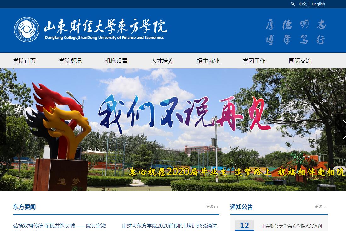 山东财经大学东方学院成立于2005年6月,是由山东财经大学、山东黄金集团联合举办,以实施全日制普通本科教育为主的高等院校。学校是全国应用技术大学(学院)联盟单位、教育部“数据中国产教融合促进计划”试点高校、全国创新创业实践联盟单位、美国注册会计师协会中国协会(USCPA China Society)理事单位,被誉为“优秀应用型财经人才的摇篮”。学校秉持“厚德明志、博学笃行”的校训,本着“以教学为中心,以学生为主体,以服务为根本,以质量为生命”的办学理念,建立了“理论教学+实践教学+素质教育+创新创业教育+心理健康教育”五位一体的教育教学体系,培育了“胸怀天下、勇攀高峰、求真务实、开拓创新”的东方精神,明确了“一体两翼、扎根地方、服务产业、开放融合”的发展战略,走出了一条适应社会经济和产业发展需求,既充分发挥高水平母体学校的支撑优势,又真正体现自身办学特色的发展之路。学校地处“五岳独尊”、“中华国山”的泰山脚下,南眺孔子故里圣城曲阜,北倚华夏母亲河黄河,山水圣人荟萃于此,文化底蕴丰厚,学校占地530余亩。凤凰河畔树茂风清,园林景观错落有致,校园环境安静优雅。信息化教学设施完备,生活配套完善便利;图书馆纸质藏书近50万册,电子图书百余万册,期刊6200余种,“掌上学习通”移动图书馆全面上线,为学生潜心治学和健康成长提供了优越条件。学校积极对接国家、省市重大产业发展战略和山东省新旧动能转换重大工程实施规划,前瞻设定学科专业布局,现有会计学院、财税金融学院、工商管理学院、国际商学院、数据科学学院、人文艺术学院、公共教育学院、马克思主义学院8个二级学院,正保会计学院、创新创业学院、曙光瑞翼大数据学院、东方世博数字创意学院4个特色学院,开设涉及经、管、文、艺、理等五大学科门类的28个本科专业和特色专业方向,形成了紧密对接产业链的应用型专业体系。依托母体高校雄厚师资力量,学校形成了一支以山财大教师、自有教师为主体,以行业(企业)专家为补充的学术型、应用型高水平“双师型”师资队伍,为高素质应用型人才培养提供了可靠保障。学校实施“百名教师下企业计划和百名企业专家进校园计划”,荟萃行业领军人才、管理精英参与教育教学;聘请了几十名各领域专家学者担任特聘教授、客座教授;省级教学名师领衔的大批优秀中青年教学骨干,活跃在教学科研一线。学校积极践行“人为本、德为先、学为上”的育人理念,“一人一方案”全面实施大学生主体性、个性化学分制教学,营造因材施教、因势利导、尊重个性、激发潜能的教育环境;以入选教育部产教融合促进计划试点院校为契机,不断深化“政校行企”四方联动、产教融合、协同育人模式,组建数据科学学院、创新创业学院、曙光瑞翼大数据学院、东方世博数字创意学院等特色学院,面向全国产业布局和山东省“一圈一带”区域现代服务、生产制造和经营管理一线,培养具备创新精神、职业素养、人文情怀、社会责任感较强的管理、服务能力和较高技术应用能力的优秀经管人才。学生在大学生数学建模大赛、中国“互联网+”创新创业大赛、“创青春”全国大学生创业大赛、全国大学生英语演讲竞赛、全国大学生创业设计暨沙盘模拟经营大赛、山东省软件设计大赛、山东省大学生科技创新大赛等国家、省市各级各类学科竞赛和科技创新赛事中屡获佳绩,荣获省部级、国家级奖励500多项。学校全面推行第二课堂“五个一”工程(科技学术、社团活动、社会实践、文体艺术和身心发展),学生第二课堂活动欣欣向荣,现有学生社团近百个,社会实践活动基地88个,义务支教基地17个,学生社会实践参与率100%,为广大学子提供了施展才华、飞扬个性的广阔天地。有近百人次荣获省级社会实践和志愿者服务先进个人称号。广西“追锋”支教团队5次荣获省级重点团队,贵州习水支教团队2次荣获省级重点团队荣誉,学校连年被团省委评为暑期“三下乡”社会实践“优秀组织单位”。校园文化活动精彩纷呈,“东方讲坛”、“创业大讲堂”、“大学生学术科技节”、“大学生文化艺术节”、“嘉年华社团活动月”等成为校园文化品牌,让东方学子度过大学最美好的时光。学校健全就业工作机制、完善就业服务体系,始终把学生就业作为“最大民生工程”,毕业生平均就业率93%以上。毕业生因创新工作能力强、业务素质高、工作作风扎实,受到用人单位的广泛认可,学校获“新浪网2017年度山东最具就业竞争力本科院校”奖项。与地方政府和知名企业合作共建大学生创新创业孵化基地和大学生创业培育中心,为学生创新创业提供资金、政策和平台支持,让每一个立志创业的学生都拥有自主创业的广阔空间。根据学生学习,实施分类培养,鼓励学生升学深造,专升本录取率达28%以上;近年来硕士研究生录取率稳步攀升,数百名学生高分考取“985”、“211”名校及地方高水平大学。学校积极拓展国际交流与合作,引进国内外优质教育资源,培养具有国际视野的创新型人才。与马来西亚精英大学联手打造“国际专升本、本硕连读、双文凭本科”联合培养人才模式;与英国伯明翰城市大学共建金融管理与实务(专科)国际实验班,前三年在国内学习,获得东方学院专科学历证书,第四年在英国伯明翰城市大