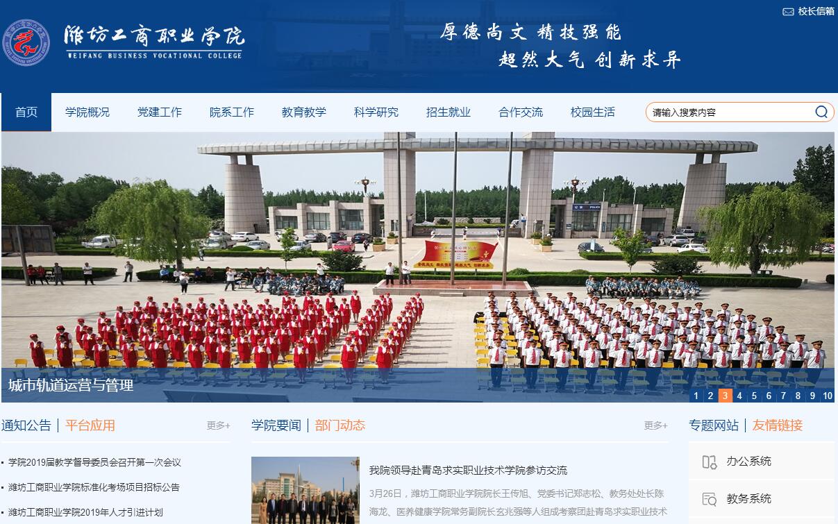 潍坊工商职业学院坐落于享有“中国龙城·舜帝故里”美誉的山东省诸城市。2005年8月,经山东省政府批准、教育部备案成立,以专科层次的职业技术教育为主的全日制普通高校。目前占地近1300亩,建筑面积26.1万平方米,馆藏纸质图书55万册、电子图书70万册,建有102个校内实验实训室和90多个校外实训基地,总资产8.2亿元;现有全日制专科在校生9332人,教职工496人,其中副高以上职称171人,中级职称304人,“双师素质”教师212人,具有硕士、博士学位的教师220人。学院组织机构健全,设有3个二级学院,5个教学系,3个公共课、基础课教学部,10个科研院所;开设39个专科专业,面向全国9个省(自治区)招生;拥有山东省与教育部共建潍坊国家职业教育创新发展实验区特色品牌专业4个,中央财政支持重点建设专业3个;山东省级特色专业3个,省级联合精品课程群2个9门课程,省级教学团队1个。学院组织机构健全,设有3个二级学院,5个教学系,3个公共课、基础课教学部,10个科研院所;开设42个专科专业,面向全国9个省(自治区)招生;拥有山东省与教育部共建潍坊国家职业教育创新发展实验区特色品牌专业4个,中央财政支持重点建设专业3个;山东省级特色专业3个,品牌专业群2个,优质资源共享课14门,教学团队1个。学院始终坚持以科学发展观为统领,遵循高等职业教育规律,坚持内涵为主,协调发展;以“和谐建校、质量立校、特色兴校、人才强校、服务荣校”为办学理念,深化教育教学改革,提高人才培养质量。学院确立了建设省内高水平有特色现代高等职业教育的目标,始终坚持为地方经济建设和社会发展服务的宗旨,走开放办学、校企合作、产学结合的道路;坚持以人为本,德育为先,全面发展的育人观;坚持培育高素质技术技能型人才的质量观;坚持内涵为主,综合协调的发展观。学院注重由重规模发展向重质量提高、由粗放管理向精细管理、由散点同质发展向特色优势发展、由继承发展向创新发展转变的“四个转变”。学院高度重视校企合作培养技术技能型人才,与中兴教育集团、京东集团、中航天使、北京商鲲集团、北汽福田、义和车桥、新郎希努尔集团、得利斯集团等知名企业建立了密切的合作关系。在多年的办学中,学院以培养人才为根本宗旨,努力打造“三全育人”的格局,创建“安全、文明、整洁、优美、有序”的校园育人环境,形成了良好的校风、学风、教风,取得了一些优异的成绩,分别获得“全国职业教育先进集体”“山东省职业教育先进单位”“山东省教书育人先进单位”“山东省教学工作先进单位”“山东省学校管理先进单位”“山东省绿化美化先进单位”“山东省职业院校技能大赛突出贡献奖”“潍坊市职业院校技能大赛十强学校”等多项荣誉称号,树立了良好的社会形象。学院还承担一定的成人继续教育任务,面向社会各阶层开展远程开放教育、网络教育、成人教育、教师教育和社会培训,形成了专业齐全的中专、大专、本科、研究生等学历提高体系和多元化的社会培训模式。学院是山东省专科单独招生院校,山东省高等教育自学考试在校生实践课程考核试点本科院校,设有教育部计算机应用能力和英语应用能力考试中心、全国信息化工程师考试培训中心、中国国际电子商务中心培训分院、山东省建设管理局认证培训中心、山东省财政厅设立的会计从业人员继续教育培训中心和会计从业资格考试中心、潍坊市人社局职业技能鉴定站、潍坊市国家商务英语职业资格认证培训考试管理中心等机构,为学生搭建了就业创业的良好平台。面对新形势、新机遇,2016年诸城市政府与山东高科教育科技有限公司签订了合作举办潍坊工商职业学院的协议,共同推进学院办学实力和办学层次的提升。在“十三五”期间,以实现学院升本目标统领全局,以提升办学层次为总抓手,坚持内涵发展、特色发展、转型发展、开放发展、和谐发展战略,坚持开放性、应用型、地方性的办学定位,进一步解放思想转变观念,以学科专业建设为龙头,以社会和市场需求为导向,突出教学工作的中心地位,加强师资队伍和课程建设,加强基础设施和办学条件建设,加强校企合作,走产学研“一体化”路子,着力提高人才培养质量,提升科学研究水平,增强社会服务和文化传承创新的整体能力,实现学院跨越式发展的目标。