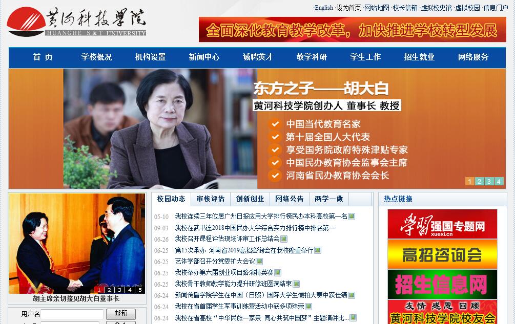 1984年,因公烧伤的胡大白在病床上了解到,河南作为人口大省,高等教育资源极为紧缺,老百姓的孩子希望上大学的愿望强烈,社会发展急需大批专门应用型人才,胸怀“为国分忧,为民解愁,为社会主义现代化建设服务”的崇高理想,她拿出家中仅有的30元钱创办了郑州高等教育自学考试辅导班。1985年,经郑州市教委批准,郑州高等教育自学考试辅导班更名为黄河科技专科学校。1989年,经河南省教委批准,黄河科技专科学校更名为郑州黄河科技大学。1994年,经国家教委批准建立民办黄河科技学院,学校成为全国第一所实施专科学历教育的民办高校。2000年,经教育部批准成为全国第一所实施本科学历教育的民办高校。2004年,学校取得学士学位授予权;时任河南省委书记的李克强视察学校时,称赞学校“用较短的时间,走完了可能是很多学校多年走不完的历史”。2008年,学校以“良好”等级通过教育部普通高等学校本科教学工作水平评估。2013年,被教育部批准为全国首批“应用科技大学改革试点战略研究单位”,并成为中国应用技术大学联盟的首批成员。学校发展史被联合国教科文组织官员称为“世界教育史上的奇迹”,两次被美国弗吉尼亚大学商学院写进案例。办学业绩被中央电视台、《人民日报》《华盛顿邮报》等中外著名媒体多次报道。学校董事长胡大白教授荣膺首届“中国当代教育名家”,第十届全国人大代表,兼任中国民办教育协会监事会主席、河南省民办教育协会会长。校长杨雪梅教授荣获“全国五一劳动奖章”“全国五一巾帼奖章”等荣誉称号,先后当选第十二届、十三届全国人大代表,任中国民办教育协会副会长、河南省高校创新创业协会会长等。学校现有四个校区,占地2300多亩,校舍建筑面积100多万平方米,被评为“河南省绿化先进单位”“河南省高等学校标准化学生食堂”“河南省高等学校智慧校园建设试点单位”等。现有全日制本科在校生24674人。教职工1805人,其中专任教师1377人,高级职称的教师占46.48%,青年教师中79.67%具有研究生以上学历,双师双能型教师373人,中国工程院院士、享受国务院政府特殊津贴专家、教育部新世纪优秀人才、国家级教学成果奖获得者、国家和省级教学名师、教育部全国首批万名优秀创新创业导师、省级学术技术带头人、“中原百人计划”专家、河南省优秀教师等荣誉教师150余人,担任河南省电子学会、省工程图学学会等学会会长教师5人。学校建有河南省院士工作站、博士后研发基地、重点实验室、国际联合实验室、工程技术研究中心、实验教学示范中心等高层次教学科研平台50余个。各科类实验室127个,实验分室410个,校外实训基地224个;教学科研仪器总值3.29亿元;馆藏图书355.6万册。学校始终把坚持党的领导、加强党的建设作为改革与发展、学科与专业建设和人才培养的政治保证和力量源泉,形成了鲜明的特色和品牌。作为全国第一所建立党委的民办高校,建校初期积极寻求建立党的组织,创办人胡大白“十年找党”的故事传为佳话。在探索实践中,形成了“党委发挥政治核心作用,参与学校重大决策”的工作机制,提出了“以党建为核心,全面加强思想政治工作”的思政模式,创立了“以党校和校卫队为抓手,积极培养发展学生党员”的组织格局。近年来,学校深入贯彻落实党的十八大和十九大精神,坚持以习近平新时代中国特色社会主义思想为指导,紧扣“培养什么人、如何培养人、为谁培养人”的根本问题,认真落实“立德树人”根本任务,打造职业化、专业化的思政工作队伍,坚守思政课堂主阵地,挖掘各类课程的育人功能,形成了思政工作合力。学校荣获“全国五四红旗团委”“河南省先进基层党组织”“河南省文明单位”“河南省高校思想政治工作先进单位”等称号。学校紧贴经济社会发展需求,形成了工科优势突出、学科链与产业链关联度高、学科布局对地方主导产业支撑度强的办学优势。学校设有工、理、文、医、管理、经济、法、教育、艺术等9大学科门类;开设67个本科专业和35个专科专业。人工智能、材料、机械、自动化、文化创意等一批优势学科专业,凸显了对区域及河南省经济转型、产业升级的支撑作用。学校重点建设了电子信息与计算机类、机械与材料类、生物医药类、文化创意类、经济管理类等特色专业集群。现有省级重点学科5个,河南省特色专业6个,河南省民办教育品牌专业9个,河南省专业综合改革试点专业8个,河南省本科工程教育人才培养模式改革试点专业1个。学校拥有的省级重点学科、特色品牌专业数量居全省民办高校首位。学校持续创新“本科学历教育与职业技能培养相结合”的人才培养模式,为国家和社会输送了16万余名高素质应用型人才,近三年毕业生就业率均保持在97%以上,深受用人单位欢迎。涌现出“中国大学生自强之星标兵”“全国优秀共青团员”“河南最美大学生”等一批优秀学子,“全国优秀乡村医生”“全国优秀大学生村官”等一批优秀毕业生。2014年,学校人才培养模式改革成果获国家教学成果二等奖、河南省高等教育教学成果特等奖,学校被评为“全国毕业生就业典型经验高校”(全国高校毕业生就业工作50强);2015年,获首批“河南省示范性应用技术类型本科院校”;2016年,获首批“全国社会组织教育培训基地”;2017年,荣登“2012-2016年