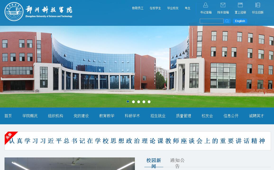 郑州科技学院创建于1988年,2001年实施专科学历教育,2008年升格为普通本科高校,2015年接受并顺利通过教育部本科教学工作合格评估。建校三十年来,为社会培养和输送了12万名高素质的应用型创新型复合型人才。学校全面贯彻党的教育方针,坚持社会主义办学方向和公益性原则,围绕“实基础、重实践、强能力、会创新”人才培养目标,构建了“学历证+职业资格证+综合素质证”三证合一的人才培养模式,促进学生全面发展。学校坚持把自身发展放到地方经济社会发展中去思考,按照“强化优势、突出特色、示范带动、整体推进”的原则,合理布局专业结构,形成了以工学为主,经济、管理、艺术、文学、教育等多学科协调发展的办学格局。目前,学校有机械工程、电气工程、信息工程、土木建筑工程、车辆与交通工程、食品科学与工程、工商管理、财经、外国语、艺术、音乐舞蹈、体育、马克思主义、基础部等15个二级学院(部)。学校现占地1500亩,在校生2.6万人,总建筑面积60万平方米,纸质图书212万册,电子图书70多万种。学校科研成果丰硕,科技创新卓有成效,围绕培养应用型创新型复合型人才的实际,不断加大实践平台建设的投入力度,搭建了由实验中心、工程训练中心、科教中心、众创中心组成的四大实践平台。目前,学校拥有各类实验室170余个,实训车间12个。学校与郑州航空港区、郑州经开区等地方政府及郑州市人力资源和社会保障局等部门在人才培训、科研服务等领域建立合作关系。先后在宇通客车、三全食品、中联重科等140余家知名企业建立了实习基地,开办了“中联重科班”“赛腾工程师班”“JAVA/PHP工程师”等57个订单培养班,构建了“企业课程进校园”“企业讲师进课堂”的协同育人模式。学校被评为“郑州市职业教育校企合作办学示范单位”。《人民日报》《光明日报》《中国青年报》《中国教育报》《河南日报》、教育部门户网站、人民网、中国网等网站及河南电视台等多家媒体对学校的教育教学进行了全面报道。学校先后获得“全国学生就业示范民办高校”“中国就业质量十强民办大学”“河南省大中专毕业生就业工作先进集体”“河南省毕业生就业评估优秀单位”“中国民办高等教育优秀院校”“全国美育工作先进单位”“河南省优秀民办学校”“河南省依法治校示范校”等荣誉称号。2018年我校在高校智库发布的中国民办大学排行榜中名列第三位。