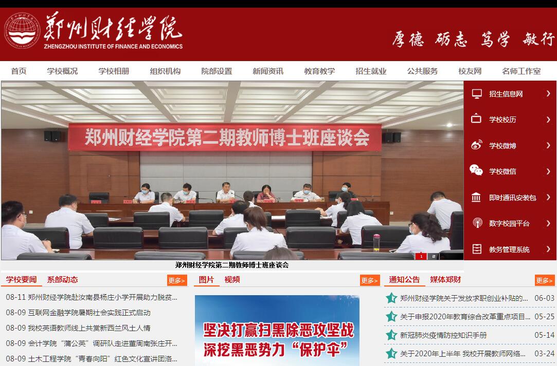 郑州财经学院是一所经教育部批准成立的全日制民办普通本科院校。位于河南省会郑州市区。自1997年建校以来,始终坚持社会主义办学方向,全面贯彻党的教育方针,依法规范办学。经过22年的建设和发展,已经成为一所规模较大、学科特色鲜明、教育质量和科研水平居于全省同类院校前列的应用型本科院校。学校占地1876亩,建筑面积57万平方米,教学科研仪器设备总值9000余万元;建有功能先进的校内实验实训室120个,校外实习实训基地212个;教学用计算机7000台,多媒体网络教室和多媒体语音室257个;图书馆馆藏各类图书200万册;学校现有教职工1572人,其中,教授、副教授465人,具有研究生以上学位的教师868人,“双师型”教师386人,并从行业、企业管理人员、专业技术人员和高技能人才中有针对性地聘请兼职教师169名。学校下设会计学院、电子商务学院、现代物流与管理学院、土木工程学院、艺术设计学院、信息工程学院、互联网金融学院、机电与汽车工程学院、现代教育学院、外国语学院、马克思主义学院、继续教育学院12个二级学院和体育教学部、公共艺术教学部2个教学部;开设69个本专科专业,其中本科专业31个,涵盖经济学、管理学、工学、文学、艺术、教育学6个学科门类。形成了以会计学为引领、物流管理和电子商务为主干、数据科学与大数据技术为支撑的优势特色专业群。学校拥有学士学位授予权。千兆宽带和无线网络覆盖整个校园;学生宿舍实行标准公寓化管理,建有带空调宿舍,可供学生选择;后勤服务设施完善,建有田径场、篮球场、排球场、网球场、足球场、下沉音乐广场等各类体育文艺设施,能满足学生文体活动的需要。学校先后荣获“河南省文明标兵学校”、“河南省依法治校示范校”、“河南省优秀民办学校”、“河南考生心目中最理想的高校”、“郑州市花园式单位”、“河南省最具综合实力民办高校”、“河南省高等教育就业质量十佳示范院校”、“新中国成立70周年河南人民满意的十大高校”等荣誉称号。