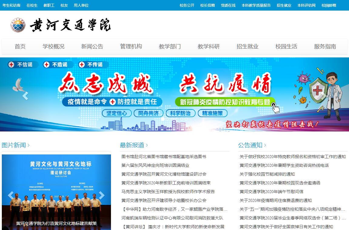 黄河交通学院(Huanghe Jiaotong University)是国家教育部批准的河南省唯一培养交通运输类人才为主的普通本科高校。建校20余年来,学校秉承“修德、启智、博学、笃信”的校训,面向现代综合交通运输和现代机械制造行业办学,先后为社会培养了近10万名专业人才,为河南奋进新时代、中原更加出彩提供强有力的智力支持和人才支撑。黄河交通学院地处郑州“一刻钟经济圈”内,与“郑州黄河风景名胜区”隔河相望,乘坐城际列车从郑州火车站至学校仅需十余分钟,交通便利,环境宜人。学校现有三个校区,总占地面积1800余亩,建筑面积近78万平方米,教科研仪器设备总值1.15亿余元,图书馆藏图书147余万册,千兆校园网络全覆盖、学生公寓空调、洗浴设施齐全,教学楼、实验实训楼、体育馆、餐厅等设施功能完备,为莘莘学子提供了良好学习生活环境。学校紧紧围绕服务区域经济社会发展办学,设有汽车工程学院、交通工程学院、机电工程学院、智能工程学院、经济管理学院、马克思主义学院、继续教育学院7个二级学院,形成了以工科为主,工学、管理学、经济学、法学、艺术学等多学科协调发展的格局。学校现开设71个本专科专业,拥有实验实训室127个,校外专业实习基地136个,在校生1.8万余人。学校实施“人才强校”战略,现有教职工近千人,中高级职称和研究生以上学历占教师总数70%以上。学校坚持以教学带动科研,以科研促进教学。先后获批成立了“河南省智能制造技术与装备工程技术研究中心”“挂车车架轻量化设计工程研究中心”“汽车空调新冷媒技术工程研究中心”“桥梁无损检测工程技术研究中心”等1个省级、7个市级工程技术研究中心,1个黄河流域历史文化研究所。其中4个研究中心并被考评为“优秀”等级,先后产生60多项发明专利,获批省部级项目15项,多项厅级以上科研项目获奖并获得资助拨款近130多万元。学校不断深化应用技术高校内涵建设,积极构建“产教融合、校企合作”的办学模式,先后与中国汽研、中国农机院、中国二冶、中国邮政集团、特斯拉、东风标致、东风雪铁龙、东风风神、奇瑞汽车、顺丰速运、美的集团、格力电器、阿里巴巴、京东等国内外上百家知名企业签订了校企合作协议,牵头成立职业教育集团、汽车行业协会,并与河南理工大学、北京理工大学出版社、河南省社科联、河南省交通科技研究院、郑州机械研究所等科研院所建立了合作关系,开展了多种形式的产学研合作。其中,规划用地1500亩,总投资19.7亿元的“国家智能清洁能源汽车质量监督检验中心”由学校与中国汽研联合建设,该项目填补了河南省内无国家级一类汽车检测机构的空白,是国内为数不多的由央企和高校合资共建的产教融合型项目,是我省应用型本科高校标志性成果,是产教融合标志性工程。2019年9月,预投资20亿元、占地10750亩的“国家智能农机装备科技教育示范园”项目签约落户黄河交通学院,政校企三方共同打造最具特色的国家级农业智能生产全程机械化示范基地,打造国家级农机具/食品机械质量监督检验中心,打造融合中原农村地区三大产业的科技教育示范基地。学校全面实施素质教育,注重学生“双创”能力培养。大学生就业创业、创新成果层出不穷。“黄河交通学院众创空间”获得河南省2018年度高校众创空间建设项目立项,在校大学生张梦龙“空中奇兵”项目荣获首届河南省大学生创新创业优秀项目选拔赛大赛的“一等奖”。多名学生在全国周培源大学生力学竞赛河南赛区、全国大学生嵌入式设计大赛全国总决赛、河南省大学生物流仿真设计大赛、“创青春”河南省大学生创业大赛等赛事中获奖。近几年来,学校德育工作成效凸显,优秀学子辈出,先后涌现出创业先锋郭举、发明狂人仝长鹏、感动中原新闻人物叶龑、带病母上学张照满、携笔从戎大学生优秀代表迭建磊、绿城卫士孙志彦等大批优秀学子。学校充分发挥高校资源优势,积极践行社会服务功能,与阿里巴巴集团合作建立培训基地,培养全国农村淘宝新农人。学校主动承担脱贫攻坚、智力扶贫培训任务,对口援建西藏山南职业技术学校,捐资助学贵州毕节技术学校、开封靳砦小学,结对帮扶武陟嘉应观乡二铺营村28家贫困户。多年来,黄河交通学院在理事长李顺兴先生带领下,广行扶危济困的社会大义,先后资助职业教育、基础教育资金多达1000余万元。学校坚持“质量立校、特色兴校、人才强校”的办学理念,社会声誉和影响力不断提高,先后获得了“河南省文明学校”“河南省教育系统行风评议先进单位”“河南省教育系统先进集体”“先进教工之家”“河南省高校先进基层党组织”“河南省依法治校示范校”“河南省平安校园”“新中国成立70周年河南人民满意的十大高校”“河南省高等教育就业质量十佳示范院校”等近百项重要荣誉。不忘初心、牢记使命、砥砺前行。黄河交通学院以习近平新时代中国特色社会主义思想和党的十九大精神为指引,深入学习贯彻全国教育大会和新时代全国高等学校本科教育工作会议精神,坚持社会主义办学方向,以立德树人为根本任务,以改革创新为根本动力,以培养担当民族复兴大任的时代新人为历史使命,为创建特色鲜明、人民满意的应用型本科高校而努力奋斗。