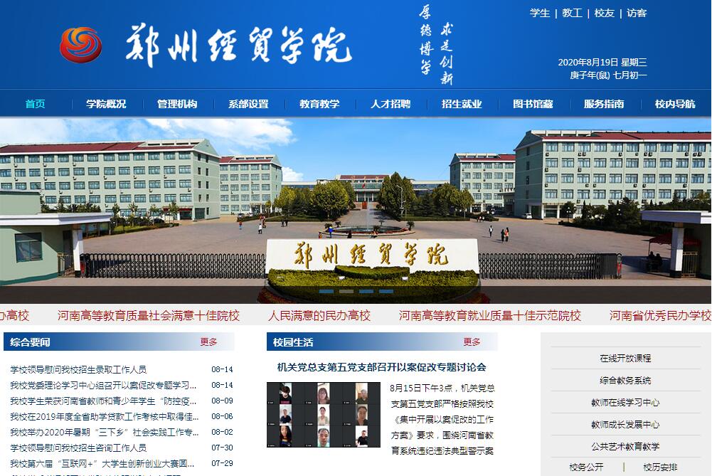 郑州经贸学院前身为中原工学院信息商务学院,成立于2003年4月,是首批经国家教育部批准具有全日制普通本科学历教育办学资格的独立学院。2020年6月30日,教育部印发《关于同意中原工学院信息商务学院转设为郑州经贸学院的函》(教发函〔2020〕40号),“同意中原工学院信息商务学院转设为郑州经贸学院,学校标识码为4141013508;同时撤销中原工学院信息商务学院的建制”,郑州经贸学院系独立设置的本科层次民办普通高等学校,由河南省教育厅主管。学校位于河南省省会郑州市南龙湖教育园区双湖大道2号,毗邻郑州航空港区。学校拥有完备的教学楼、实验楼、图书馆等教学设施;拥有河南省标准化食堂和标准化学生公寓等生活设施;建有标准的塑胶田径运动场、篮球场、网球场、体育馆等体育设施。校园道路宽敞,绿树成荫,鸟语花香,环境优美整洁。学校现有学科涵盖管理学、经济学、工学、艺术学、文学、法学等六大学科门类。学校十分重视学科、专业建设,现有省级重点建设学科3个(企业管理、机械设计制造及其自动化、控制理论与控制工程),省级实验教学示范中心2个(服装与纺织品设计综合实验教学中心、经济管理实验教学中心),省级一流专业3个(财务管理、服装与服饰设计、计算机科学与技术),省民办高校学科专业建设资助项目3个(会计学、物流管理、计算机科学与技术),省民办高校品牌专业9个(建筑环境与能源应用工程、服装与服饰设计、市场营销、电气工程及其自动化、会计学、财务管理、国际经济与贸易、电子商务、广播电视学),省专业综合改革试点专业4个(会计学、信息管理与信息系统、服装与服饰设计、英语),河南省示范性虚拟仿真实验教学立项建设项目1个(服装与纺织品设计),河南省一流本科课程3门(摄影技术与艺术、英语阅读三、市场调查与分析),河南省精品资源共享课程1个(民法学),河南省级高校思想政治理论课优秀课程1门(毛泽东思想和中国特色社会主义理论体系概论),河南省高等学校精品在线开放课程6门(操作系统、三维动画设计、职业规划与创业、市场营销学、Excel在财务中的应用、管理会计),河南省高等学校优秀基层教学组织3个(电子商务教研室、英语教研室、财务管理教研室)。学校坚持“以服务为宗旨,以就业为导向,以特色创品牌,以质量谋发展”的办学理念,积极实施“人才强校”战略,拥有一支结构合理、师德高尚、素质优良的优秀教师队伍,通过不断深化教育教学改革,积极探索应用型人才培养模式,人才培养质量不断提高。近年来,学生在全球品牌策划大赛、全国电子设计竞赛、全国数学建模大赛、全国“挑战杯”大赛、全国大学生“恩智浦杯” 智能汽车竞赛等各类比赛中屡创佳绩,获奖层次和数量均在我省同类院校中名列前茅。毕业生就业率连续多年保持在95%以上,且就业质量不断提高,受到用人单位的普遍青睐和广泛赞誉。建校以来,学校不断加强内涵建设,办学条件日益改善,师资队伍建设不断加强,学科专业建设成效显著,人才培养质量稳步提高,为区域经济社会发展做出了积极贡献,赢得了上级主管部门和社会各界的一致好评。学校先后被授予“全国先进独立学院”、“中国民办高等教育优秀院校”、“河南省优秀民办学校”等20余个荣誉称号。