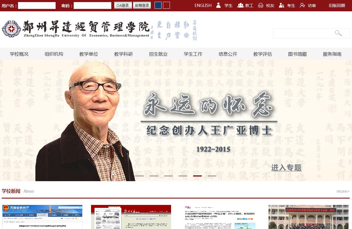 郑州升达经贸管理学院始建于1993年,前身是由豫籍台湾教育家王广亚博士为董事长的台北广兴文教基金会与郑州大学合作兴办的郑州大学升达经贸管理学院。2011年4月,经教育部批准,转设为独立设置的民办普通本科高校。学校代码为14333,河南省招生代码为6195(普通本、专科),6196(专升本)。建校之初,创办人一次性捐资2亿多元人民币用于学校建设,提出了“勤俭朴实、自力更生”的校训,“伦理、创新、品质、绩效”的办学理念,“好的师资、好的设备、好的管理、好的制度、好的福利”的“五好”办学原则。25年来,学校坚持“三个始终不动摇”,即:社会主义办学方向始终不动摇,公益性、非营利性办学宗旨始终不动摇,服务地方经济社会发展始终不动摇。近年来,学校以合格评估为契机,进一步加大投入,优化办学条件,强化教学建设,深化教学改革,细化教学管理,注重文化育人,奠定了较好的办学基础,形成了较厚的文化底蕴。学校现有金融贸易、会计、管理、商学、信息工程、外国语、文法、艺术、建筑工程、体育10个学院和创新创业教育学院及思政、基础2个教学部,开办本科专业39个。全日制在校生24519人,其中本科生20105人。形成了以经济学、管理学为主,工学、文学、艺术学、教育学、法学多学科协调发展的基本格局,拥有河南省专业综合改革试点5个,河南省品牌专业建设点9个,河南省特色专业3个,数量居全省同类高校第一。学校注重把教师作为办学第一资源,持续强化师资队伍建设。现有专任教师1245人,其中自有专任教师790人。自有专任教师中,高级职称教师占39.87%,具有硕士、博士学位的教师占73.54%,双师型教师占29.37%。其中,享受国务院特殊津贴教师2人、国家级及省级优秀教师6人,河南省教育厅学术技术带头人、骨干教师30人。“专家引领、骨干支撑、双师结构”的师资特点初步显现。学校注重优化教学条件。现有龙湖和登封两个校区,校园占地2203亩,建筑面积54.47万平方米,教学行政用房24.40万平方米,学生宿舍20.56万平方米,教学仪器设备总值1.15亿元。建有土木建筑、语言综合、学前教育等16个实验教学中心,其中经济管理实验教学中心是省内最大的经管类综合实训中心。拥有教育部“科学工作能力实训示范基地”1个,省级实验教学示范中心2个,市级重点实验室1个。纸质图书总量235万册,2次被评为全国、8次被评为全省“全民阅读先进单位”,2015年,获中国图书馆学会颁发的最高荣誉“全民阅读示范基地”。校园网覆盖率100%,是“河南省高等学校数字化校园示范工程项目建设单位”。学校注重教学建设与改革。近年主持承担各级教改课题177项,发表论文545篇,编写教材285本,建设精品课程和网络课程52门,制定了“学用创相融”的培养方案,实施了“三优”专业核心课程建设,强化了“分层次、重体系”的实践教学,“产教融合、协同育人”的培养模式正在形成,获教学成果奖17项。是全国首批、民办高校中唯一入选教育部科学工作能力提升计划(百千万工程)的试点院校。学校注重应用科学研究。近三年主持省级及以上纵向科研课题59项、横向课题13项,获省市级教学科研奖励322项。目前拥有省重点学科5个,数量居全省同类高校第一。学校落实立德树人根本任务。不断深化“三大教育”(爱国教育、劳动教育、感恩教育),持续实施“三大竞赛”(秩序礼仪、文明宿舍、学生整洁),着力强化“三方育人”(环境育人、教书育人、服务育人)。有追求、爱劳动、懂感恩、知礼仪已成为学生的明显特征,形成了学生教育、管理、服务的鲜明特色。学校注重学生双创能力培养。成立创新创业教育学院,设立三位一体的组织机构,培育三师合一的师资队伍,构建三课合一的课程体系,打造三赛合一的赛培体系,完善三体合一的实践平台。学生创业孵化项目连续4年受到河南省大学生创业体系建设引导资金扶持,孵化学生创业项目42个,2016年,学校荣获“全国民办教育创新创业教育文化建设奖”。学校注重国际交流与合作。与美国、韩国、日本、马来西亚等国家的18所高校建立了合作关系,承办了海峡两岸国贸金融实践教学研讨会等10余次两岸学术交流会议,坚持选派优秀学生赴台学习,多次组织“孔子行脚”等两岸大学生交流活动,被誉为“豫台交流的典范”。目前,学校已向社会输送了近7万名各类人才,培养了以牛津大学博士后、中国人民大学重阳金融研究院副主任、世界银行顾问胡玉玮为代表的学有所成,以盛世乐居(纳斯达克上市)联合创始人李建保、江苏谷峰电力有限公司(新三板上市企业)董事长张高峰为代表的干有所成的一批优秀人才。近三年,应届本科毕业生初次就业率平均为91.81%,高出河南省平均就业率10个百分点,连续三年评为河南省普通高等学校毕业生就业工作评估优秀单位。中国教育报、人民网、中国网等媒体多次报道学校的办学理念与办学经验。办学水平得到了上级领导和社会各界的认可和好评,学校被评为河南省优秀民办学校、河南省依法治校示范校、河南省平安校园、河南省学校行风建设先进单位等荣誉称号。