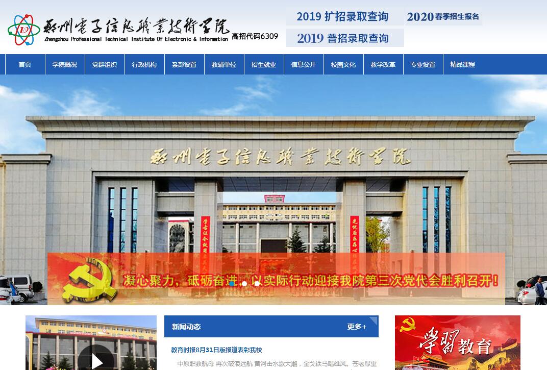 郑州电子信息职业技术学院是经河南省人民政府批准、教育部备案设立的普通高职院校,是省政府规划的升本高校。学院地处郑州都市区、郑州航空港区、中原经济区三区叠加发展区域,郑汴一体化的中心,学院承担着为郑州国家中心城市、航空港区、郑州汽车工业园区培养大批高技能人才的任务。办学30年来已有十万余名毕业生在全国各地工作着,很多毕业生已成为企业界的领军人物,毕业生就业率连年接近100%。学院的办学事迹受到国家省市100多家新闻媒体的报道表扬,被誉为“技师、工程师、企业家的摇篮”,先后荣获“全国先进职业院校”、“全国职业指导先进院校”、“河南省高等职业教育特色院校”。学院多次被评为“省级办学先进单位”及郑州市“十佳院校”等荣誉称号,河南省高工委、省教育厅党组授予我院党委“河南省高等学校先进基层党组织”称号。时任国家教育部长周济、河南省长郭庚茂、国家政协副主席王志珍到我院调研,对学院在高等职业教育办学方面取得的成绩给予了高度评价。学院千余亩花园般的校园,30余栋教学科研大楼,近万名在校生,620多名专兼职教师中教授、副教授、高讲、高工等中高级职称的教师占60%以上,其中,国家突出贡献专家2人,享受国务院政府特殊津贴专家2人,再加上解放军信息工程大学、河南大学、郑州大学等高校在我校任教的专家教授已组成了强大的师资队伍。学院近亿元的各种先进教学设备,实验实训室81个,其中:“电工电子实训基地”、“ 数控实训基地”、“ 郑州海马校外实训基地”被评为省级示范实训基地;“电工电子实验室”、“ 机电一体化实验室”、“ 汽车检测与维修实训中心”被评为郑州市重点实验室。100多家国家大中型企业授牌授证书确立为人才培养输送基地和校企合作实验实习基地,确保学生理论实践相结合。图书馆百万册图书,千兆校园网,校园无线WiFi全覆盖,2500多台先进的计算机,为同学们学习成长奠定了坚实基础。学院建有两个大型体育运动场、一座室内体育中心,足球场、网球场 、篮球场等。学生宿舍为标准四人间,配有空调、独立卫生间、电脑桌、书柜、宽带等设施;校园信息化建设取得初步成效,投资近千万元,建有60个标准化考场;校内机动车检测中心;校内工厂一家;汽车实训中心,基本实现以师带徒。学院设置七系四部:电子工程系、机电工程系、土木工程系、交通运输系、信息工程系、艺术设计系、经贸管理系、基础教学部、中专教学部、思想政治理论课教学部、体育教学部。现开设专业51个。2016年我院“电子信息工程技术专业”被批准为“河南省品牌专业”;2016年省教育厅授予我院为“河南省高等职业教育特色院校”称号。学院实施“专家治校”战略。外引内培,加强“双师型”教师队伍建设,提升教师学历层次,优化师资结构。努力构建集团化校企合作办学模式,创建具有专业特点的产教融合、校企一体的人才培养模式。学院始终遵循教育规律和市场规律,始终把为当地经济建设培养急需人才作为工作重心。实行校企合作,厂门校门对接、工学结合、订单培养,学生理论扎实,动手能力强、具有创新能力的办学特色。学院竭尽全力为祖国培养品德好,专业技术过硬,适应市场需求的具有开拓、创新能力的高级技能型人才。目前学院正遵照河南省“十三五”规划精神,努力为实现中原崛起、河南振兴培养所急需的高级技能型专业技术人才,提高自身办学层次,为把学院办成一所现代化的本科高校而努力奋斗。