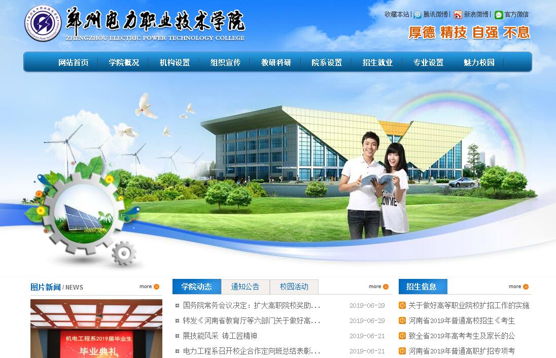 郑州电力职业技术学院是一所集电力、机电、建筑、汽车、信息、经贸、艺术类专业为一体的普通高等专科学校,是培养国家经济建设和社会发展需要的高技能应用型人才的摇篮和基地。学校位于中原经济区、郑州都市核心区、郑州新区三区叠加之处,毗邻郑州绿化博览园和方特游乐园,环境优美,设施完善,是一所园林式、生态型的现代化大学。经过多年来的不断发展,学校已经形成了以工科为主,工、管、经、艺协调发展的专业体系。学校现设九个教学系部(电力工程系、控制工程系、机电工程系、建筑工程系、汽车工程系、信息工程系、经济管理系、艺术传媒系和公共教学部),四个教辅单位(计算机中心、实验实训中心、网络中心、图书馆),共开设了40个市场需求量大的优势专业。人才是第一资源,更是学校发展的战略资源。我校引进了一大批高职称、高学历人才为学科带头人,聘用了具有丰富经验的行业企业专家、专业技术人员担任专兼职教师。学校现有教职工500余人,其中硕士生200人,博士生18人,副高以上职称教师150人,“双师型”教师、省市级优秀教师、学科带头人共计260余人,强大的师资队伍为学校的教育教学工作提供了强有力的保障。学校始终高扬教学主旋律,牢固确立教学中心地位,建立院、系两级教学管理体系,采取“教学做一体化”、工学交替、顶岗实习、项目驱动等先进教学模式,不断加强和推进校内外实习实训基地建设,突出教学过程的实践性、职业性和开放性,教学质量和人才培养工作水平得到显著提升。在上级教育主管部门的领导下,我校全面贯彻国家教育方针,以立德树人为根本,以市场为导向,以质量为主题,以服务为宗旨,走校企合作、工学结合之路,全面培养具有较高职业素质、较强社会适应性的高等技术应用型人才。学校历经多年的发展,积累了丰富的办学经验,具备了优越的办学条件,办学实力、规模及社会声誉不断提升,多次受到上级领导的肯定和主管部门的表彰:原教育厅厅长蒋笃运来我校调研时,对我校所取得的成绩给予了充分肯定;教育界、学术界等众多知名人士也对我校给予了高度评价。先后被授予省级“行风建设先进单位”“发展(成长)最快的院校”“依法治校示范学校”“先进办学单位”“五好教育先进单位”“园林式单位”“安全校园优秀学校”“优秀民办学校”“优质特色学校”“职业院校实验室建设先进单位”“最具品牌影响力的典范高校”“河南最具就业竞争力品牌高校”等荣誉,并连续八年被郑州市教育局评为“民办教育十佳单位”。学校的发展得到了社会各界的广泛关注和赞誉,中央电视台、新华社、东方卫视、凤凰卫视、河南电视台、郑州电视台、《河南商报》《大河报》《河南日报》《中国教育报》《人民日报》《教育时报》、人民网、中国青年网、凤凰网、网易、腾讯、搜狐、新浪等新闻媒体单位先后多次对我校做了相关报道。学校建有电力工程、控制工程、机电工程、汽车工程、建筑工程、信息工程、经济管理、艺术传媒、计算机中心等九个校内综合性实验实训中心,拥有实训室168个,多媒体教室103个,语音室12个,计算机2000余台,仪器设备总值6500万元,其中部分实训中心、被评为“省级重点实训室、省级先进实验室”先后与大唐电力有限公司、国能生物发电有限公司、中航光电有限公司、姚孟电厂、郑州日产、华夏星博教育科技公司、中国兵器河南红宇集团、郑州新华重型机器有限公司、海马商务汽车有限公司、奇瑞汽车(河南)有限公司、河南省第一建筑公司、郑州市第一建筑公司、河南省建筑科学研究院、郑州电子商务中心、郑州会计服务中心、郑州地铁、高铁等100多家知名企业合作共建了校外实习实训基地,实习实训教学时数达50%以上,保障了各专业实习实训教学的质量。另外学校建有现代化的图书馆藏书90万册,其中纸质图书65万册,电子图书25万册。这里已成为全面培养学生综合素质最重要的“第二课堂”。学校设有校内运动场、多功能室内体育馆、标准化塑胶操场、足球场、篮球场、排球场、网球场、乒乓球场、羽毛球场;校内有中心花园、垂柳林、东区天鹅湖、文化广场等休闲去处;拥有超市、医院、快递中心、物流中心、移动、联通、电信营业厅、邮政、农行、建行、工行自动取款机、洗浴中心、理发店、大小餐厅等服务场所;学生宿舍装有空调,每间住3—6人,设有独立卫生间,内设有衣柜、书柜、电话、宽带接点等;宿舍楼内设有投币洗衣机。学校大力实施学习践行社会主义核心价值观教育活动,致力于建设“和谐校园、活力校园、学术校园、文明校园”,形成了两个品牌(校园科技文化艺术节、田径运动会)及五个系列(科技活动、文艺活动、体育活动、社会实践活动和社团活动)为主的校园文化模块。特别是双截棍协会、太极社、跆拳道协会、音缘吉他协会、F—Z街舞协会、梦幻足球协会、篮球协会、轮滑协会、骑行社等20多个学生社团活动,陶冶了学生的情操,启迪了学生的心智,促进了学生的全面发展,营造了奋发向上、生机勃勃的校园文化氛围。学校依托行业和区域优势,以提高大学生就业竞争力、促进毕业生顺利就业为目标,在积极拓宽毕业生就业渠道的同时,与多家企业签订了学生顶岗实习及定向培养协议,把企业请进校园,并根据企业