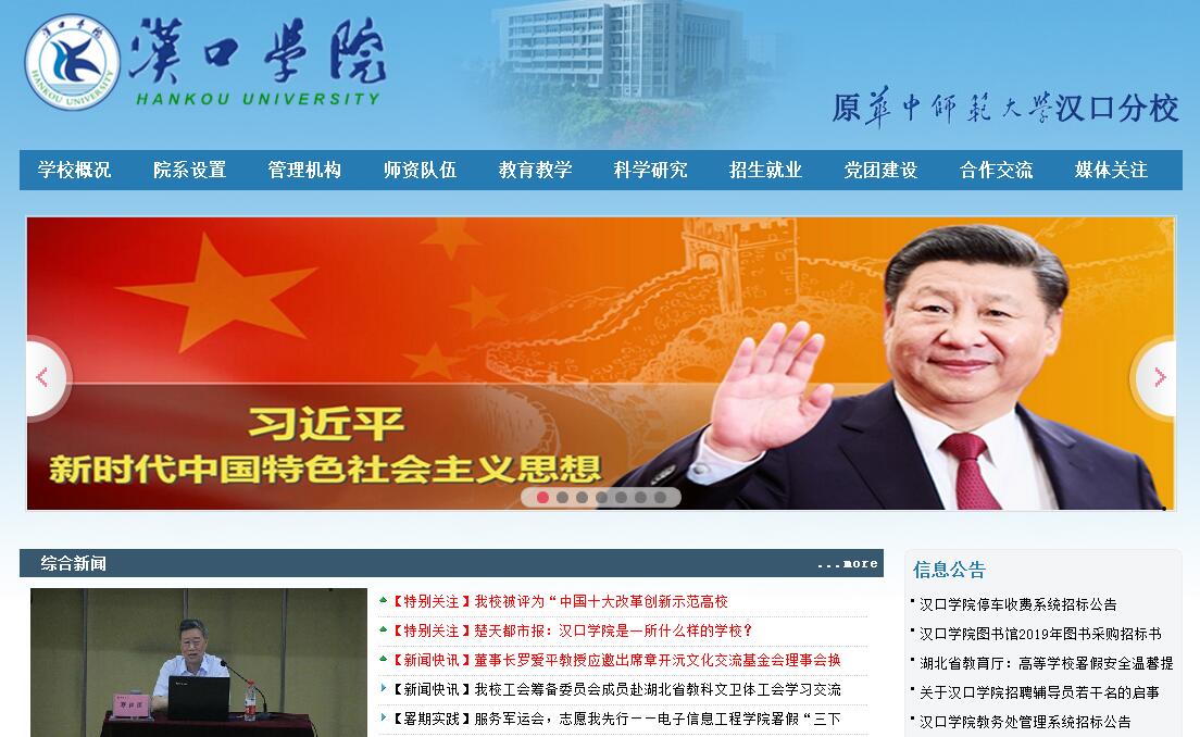 汉口学院是经教育部批准成立的多学科、综合性普通本科高等学校,面向全国招生。汉口学院位于九省通衢的湖北省武汉市,坐落在风景秀丽的汤逊湖畔,毗邻高新科技产业集聚区——“中国光谷”。校园占地千余亩,建筑面积40余万平方米,校园依山傍水,绿树成荫,楼阁有致,亭台生韵,鸟语花香。学校被誉为武汉地区最美最雅的新型大学园区。学校创立于2000年9月,其前身为华中师范大学汉口分校。2011年经湖北省人民政府申请,教育部批准,成立汉口学院。通过18年的砥砺发展,学校形成了培养硕士生、本科生、专科生,以及举办专升本教育、继续教育、职业教育、国际合作交流等完备的高等教育体系,连续五年综合排位居全国同类院校前十多名,2018年全国同类学校排15名,教学质量位居同类院校第13位。学校先后被评为“中国十佳独立学院”“中国十大名牌独立学院”“中国十大改革创新示范高校”“武汉市综合治理先进单位”,荣获“全国爱国主义教育成就勋章”。2018年5月4日,我校杨高飞同学被共青团中央授为“全国优秀共青团员”称号。学校始终坚持贯彻党的教育方针,秉承“敢为人先、实事求是、志存高远、追求卓越”的校训,大力实施“一校一园”发展战略,以“教学改革在全国高校处于领先地位、创业者教育在全国高校处于领先地位、产学研在全国同类高校中处于领先地位”“三个领先”为办学目标,坚持以市场需求为导向设置专业,以提高教育教学质量为核心,把培养专业基础知识牢固、综合素质强、具有创新精神和实践能力的德、智、体、美全面发展的应用型高级专门人才作为人才培养的基本定位,毕业生深受用人单位欢迎。学校基础设施完善,现拥有专业实验室70多个,学生固定实习基地70余个。图书馆建筑面积2.68万平方米,馆藏图书120多万册。学校教学和科研工作总体覆盖文、法、工、经、管、教、艺术等7 大学科门类,坚持“结构合理、重点突出、特色鲜明、优势互补”的专业建设思路,建有39个本科专业、18个专科专业。我校现有湖北省重点学科一个,湖北省重点培育本科专业2 个,战略性新兴(支柱)产业人才培养计划项目2 个,“专业综合改革试点”项目5 个。为了进一步推动科研兴校战略,学校全职引进德国国家科学与工程学院院士、牛津大学教授皮特•萨赫逊担任副校长兼国际创新中心主任,具体负责汉口学院德国产业园的筹建工作,旨在创办国内一流的高新技术研究中心,切实提高学校整体科研实力。学校师资力量精良,拥有一支教学经验丰富、学术水平较高,职称、学历、年龄结构合理的专任教师队伍。现有专任教师600余人,其中院士1人,正教授70余人,副教授190余人,另外具有硕士、博士学位者约占专任教师的68%,有5位教授享受国务院特殊津贴。学校不断更新教育理念,创新人才培养模式,人才培养质量持续提高。近5 年来,共有2000 余人次在国内外各类重大竞赛中获奖,涌现出“全国十佳社团联合会”“全国百强社团”等一批杰出的校园文化活动团体。去年我校代表湖北省参加全国互联网+比赛,取得好成绩。学校传媒学院微电影作品《纸飞机》荣获“中国金鸡百花电影节第三届国际微电影展映盛典”优秀作品奖。学校“旭日合唱团”一举摘取第七届意大利日内瓦国际合唱节最高奖项特别奖和两项金奖,成为第一个荣获此殊荣的中国合唱团。学校资教生签约率连续12 年位居全省同类高校第一,涌现出了一批优秀资教生典范。学校积极鼓励学生再深造,近5年有600 多人考取国内外重点大学研究生。学校还建有完善的奖、助学金体系,困有所助、优有所奖,年奖励金额有700 多万元。学校国际交流合作成效显著,现已具备完善的留学生培养体系和稳定的出国渠道。学校设有:英美项目部、欧盟项目部、韩国项目部、马来西亚项目部、澳新项目部、雅力A-LEVEL 国际课程中心、来华留学生服务中心、语言培训与出国留学服务中心和民办教育国际化研究所。在中外合作办学项目数量和中外合作办学项目在校学生数量均居全省同类院校领先地位。新的征程中,学校全体教职员工将以饱满的热情、执着的信念、严谨的作风,朝着办人民满意的、全国一流的教学型、应用型、创业型大学的目标,昂首阔步前进!