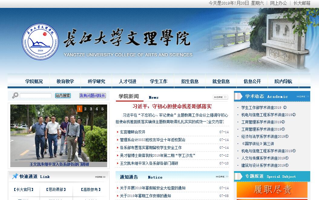 长江大学文理学院(简称学院)是2004年经国家教育部确认、由长江大学举办的全日制普通高等学校,面向全国26个省(市、区)招生,具有自主颁发学士学位和与长江大学联合培养双学士学位资格。学院地处春秋战国时期楚国都城、伟大爱国诗人屈原故里、国家历史文化名城——湖北省荆州市,在城中校区和西校区两校区办学。坐落于荆州古城内的城中校区曾是东汉著名政治家、文学家、教育家马融“设帐讲学”之地,也曾是明朝一代名相张居正求学之所;明清两代县学宫、祭孔、乡试、迎状元等重大活动都在此举行;1936年,湖北第四区简易师范学校在这里诞生,在董必武及中共地下党领导下,这里成为湘鄂西根据地红色堡垒,被誉为“湖北抗大”“江南陕公”。校园内的玄宫塘、文庙、棂星门等标志性历史建筑交相辉映,讲述着自古以来中华民族一代一代栋梁的成才故事。学院举办高校长江大学,是湖北省属高校中规模最大、学科门类较全的综合性大学,为湖北省“双一流”建设高校,是国家“中西部高校基础能力建设工程”入选高校,也是湖北省人民政府与中国石油天然气集团公司、中国石油化工集团公司、中国海洋石油总公司共建和湖北省人民政府与国家农业部共建的高校。学院依托和共享长江大学优质教育资源,设有经济与法学系、人文与传媒系、外国语系、机电与信息工程系、数理与医护系、工商管理系、建筑与设计系、基础课部和高职部等9个教学单位,设置40个本科专业、16个专科专业,本科专业涉及经济学、法学、教育学、文学、理学、工学、农学、医学、管理学、艺术学10大学科门类。学院2010年通过湖北省独立学院本科专业教学合格评估。电子信息工程、市场营销、园林、英语等被列为湖北省本科高校“专业综合改革”试点项目;机械设计制造及其自动化、电子信息工程、园林被列为湖北省普通高等学校战略性新兴(支柱)产业人才培养计划本科项目。现有全日制在校学生近7000人。学院拥有一支结构合理、相对稳定的优质师资队伍和教育管理团队,现有教职工504人,其中专任教师385人,聘请校外教师18人,专任教师中具有副高级以上职称的128人,拥有博士、硕士学位约占77%;长江大学长期委派高水平教师来学院承担教学与管理工作,为学院教育教学及管理提供了坚实的师资保障。学院建有学术报告厅、艺术设计展厅、专业实验室、图书馆、多媒体教室、校园一卡通信息化平台、标准化学生公寓等完备的教学和生活设施;学生公寓安装了冷暖双制空调、热水洗澡系统、宽带网络;教学科研仪器设备资产总值4000余万元,馆藏纸质图书70余万册,并实现了与长江大学图书资源的共享、通借通还。学院全面贯彻党的教育方针,坚持社会主义办学方向,落实立德树人根本任务,秉持“以人为本、学生至上”办学理念,围绕“教学立院、科研兴院,创新强院”办学思路,践行“教书育人、管理育人、服务育人、环境育人”育人理念,已为社会输送了万余名具有创新精神和创新创业能力的应用型、创新型人才,办学水平、人才培养质量和社会影响力日益提升。学院荣获教育部首届全国民办高校党的建设与思想政治工作优秀成果特等奖,第八届湖北省高等学校教学成果二、三等奖,新华网“魅力高校”荣誉称号等。学院践行“博文明理、日新笃行”院训,注重学生个性发展与全面发展相结合,注重专业知识学习与校园文化建设相结合,形成了具有文理特色的多样化人才培养体系。在学生管理中,构建“三强化、三深入”育人体系,即强化过程管理、强化品牌建设、强化工作研究,深入教室、深入寝室、深入学生心理,形成“泮池五月风‘科技文化节’”“十佳大学生”评选表彰和“国学讲坛”等一批有影响力的特色品牌活动,用真心、真情、真意去关心和帮助学生,促进学生成长成人成才。在资助育人中,建立“奖、助、贷、勤、补、免、减”资助困难学生的制度体系,设立国家奖学金、国家励志奖学金、国家助学金、国家生源地助学贷款、学院奖学金、“湖北天蓝地绿”助学金和“松滋园林”奖学金及勤工助学金等多项奖助金,使学生困有所助、优有所奖。在教学改革中,实施知识、能力、素质“三位一体”人才培养模式,突出实践教学地位,将实践能力培养和创新创业教育融入人才培养全过程,积极开展双学位教育,培养复合型人才。近三年,学生学科竞赛成绩斐然,300多人次在国家级及省部级各类竞赛中屡获大奖;学生考研录取率逐年上升,园林专业的20名学生参加2018年硕士研究生招考,16名被录取,录取率高达80%;国家司法考试通过率均约15%,超全国每年约10%的司考通过率;毕业生初次就业率一直保持在90%以上,普遍受到用人单位好评。学院坚持开放办学,大力推进国际化教育和校企合作教育。与英国思克莱德大学、韩国江陵原州国立大学、崇实大学、淑名女子大学、加图立关东大学等高校开展“2+2”“3+1”和“4+1”等多种双学位国际教育;共享长江大学与美国、日本、爱尔兰等国家以及香港、台湾地区合作高校资源,参加“交换生”“专升本”“双学士学位”“申请就读硕士学位”“暑假大学生带薪实践”等学习、深造和实践。同时,与中软国际有限公司、上海宝冶钢结构建筑有限公司等各类单位建立校企合作平台,积极开展产学研合作人才培养。长江大