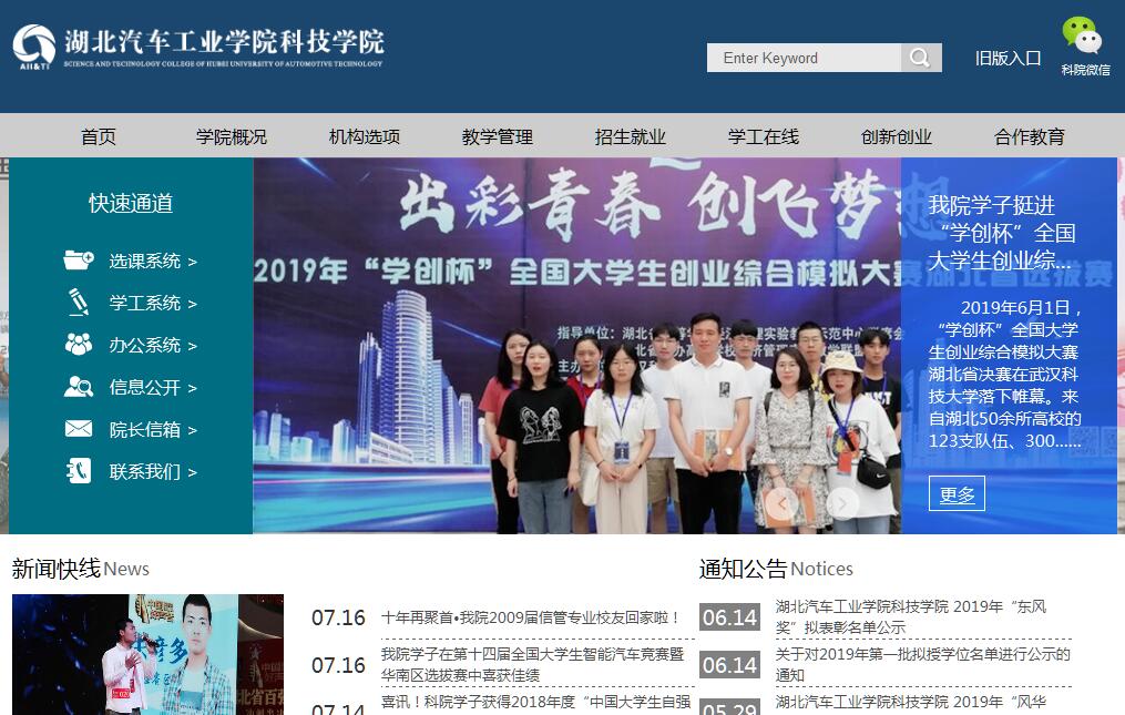 湖北汽车工业学院科技学院是一所经国家教育部批准设立的本科层次独立学院。坐落于世界著名道教文化圣地武当山北麓、汉江秀水之滨、南水北调源头、中国商用车之都的湖北省十堰市。自2003年建校以来,紧紧依托东风汽车公司大工程背景和举办院校的人才与学科基础,发展比较优势,笃志、创新、务实,践行教学、管理育人的理念,秉承“求是创新”校训,以人为本,因材施教,严格管理,坚持产学研合作教育,培养学生优良的工程意识和综合素质,为区域经济建设和汽车产业发展造就高素质的应用型创新人才。专业特色鲜明。学院注重围绕“汽车产业链”优化学科结构,发展特色专业,形成以汽车、材料、控制、机械为主干,以管理、信息、人文为支撑的学科专业布局。现有机械与材料工程系、电气与信息工程系、汽车工程系、经济管理系、人文艺术与外贸系等5个教学组织单位,设有22个本科专业、4个专科专业,其中“车辆工程”和“信息管理与信息系统”为省级重点培育专业。学院面向全国25个省份招生,全日制本专科在校学生近5000人。办学理念先进。学院借鉴德国“双元制”教育模式,充分利用东风汽车公司和地方企业的智力资源和工程环境优势,聘请实践经验丰富的工程师担任兼职教师,具有一支专兼结合的高水平师资队伍,瞄准未来职场的竞争要求,激发学生主观能动性,帮助学生设计最佳专业学习路径。构建了“全面覆盖、全员参与、全程监控”的教学质量监控体系,确保人才的培养质量。重视本科教学建设和改革工作,2017年获湖北省高等学校教学成果三等奖2项,获批省级教学改革研究项目2项,获批教育科学规划重点课题1项,一般课题4项。学科竞赛成绩斐然。学院积极搭建平台,推进项目化运作,以学科竞赛为载体,培养学生的实践能力和创新能力,实现学生知识与技能、实践与创新、文化与素质的交融。着力打造“汽车特色”系列学科竞赛,支持在校大学生参加机械创新设计大赛、工程训练综合能力竞赛、智能汽车竞赛、中国汽车工程学会巴哈大赛等83项竞赛。尤其是我院“飞翼车队”在2016、2017年大学生巴哈大赛均取得了本科组三等奖的好成绩,2017年12月25日,登上由中央电视台财经频道和英翼文化科技联合出品的大型全球高校极客挑战节目《极客出发》。近五年,学校学生获得省部级奖励649项,其中国家一等奖39项、二等奖72项,获奖学生达1407人次。德育硕果满枝头。学院在内涵式发展模式的探索与实践中,持续推行以“自尊、自强、自立”为内涵的三自教育,厚德育人。以“科海扬帆”文化节为主线,打造系列精品校园文化活动,举办了校园十佳歌手大赛、运动会、辩论赛、篮球赛等学生喜闻乐见的活动,深化大学生社会实践和志愿服务工作,促进学生全面发展,寓德育教育于校园文化活动中;以学风建设为抓手,不断开展“文明课堂”、“文明寝室”、“以赛促学”等活动。学工部(团委)曾两次被评为“湖北省高校思想政治教育先进基层单位”,2017年,我院两名新生获省级“最美新生”荣誉称号,K汽车152班团支部获湖北省“百生讲坛”活力团支部创建单位。桃李芬芳香满园。学院先后与神州数码、Infosys、中兴通讯以及东风公司等著名企业开展深度校企合作,拓展毕业生就业平台。毕业生就业率一直保持在93%以上,稳居全省同类院校前列,迄今已为汽车行业和社会发展培养了一万四千多名毕业生。毕业生以其大工程意识和动手能力强、综合素质高、创新意识显著、职业稳定性强深受社会欢迎。湖北汽车工业学院科技学院是一所工程能力突出、专业特色鲜明的应用型本科院校。