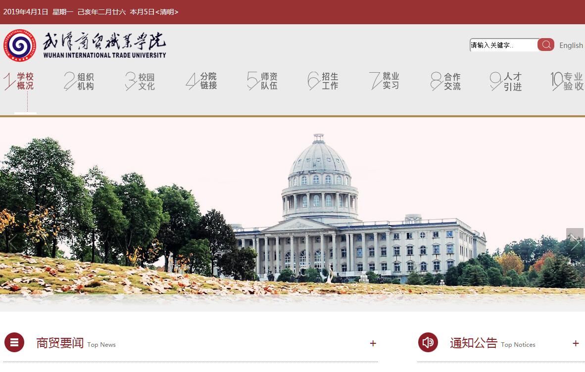 武汉商贸职业学院是经湖北省人民政府批准、教育部备案的全日制普通高校。学校分设武汉和红安两个校区,武汉校区地处武汉东湖新技术开发区(中国光谷)腹地,交通便利,被数千个高新企业环抱;红安校区地处红色革命发源地,举世闻名的“将军县”——红安经济开发区,依山傍水,自然景观优美,生态环境天然。千亩校园,万人大学。校园环境优美,建筑风格独特,集历史、人文、生态于一体,是一所与国际教育接轨、文化气息浓郁的现代大学。学校建筑面积37万余平方米,馆藏图书107万册,教学用地面积15万平方米,教学仪器设备总值5000余万元,功能齐全。学校汇聚了众多有志于职业教育的学者、教授及具有丰富实践经验的行业专家。现有专职教师554人,其中教授43人、副教授120人、楚天技能名师10人,博士和硕士研究生占49.6%。近三年承担省级以上科研课题62项,各类成果获奖59项,获得国家专利21项。2018年3月由中国科教评价研究院、武汉大学中国科学评价研究中心、中国教育质量评价中心和《中国科教评价网》联合对全国1386所高职院校进行综合评价,学校办学综合实力位列中国高职高专院校竞争力300强,湖北省同类院校前列。学校下设航空学院、生命健康学院、旅游与外语学院、汽车与物流学院、电商管理学院、管理与建筑学院、会计与金融学院、国际学院、互联网学院、传媒与艺术学院、继续教育学院等12个学院,开设有40多个专业;拥有物流管理、电子商务、市场营销、酒店管理等多个省重点、品牌、特色专业。形成了以培养现代服务业人才为主体,以培养航空、健康产业人才为特色,涵盖“财经商贸、电子信息、旅游、交通运输、医药卫生、食品药品与粮食、土木建筑、装备制造、新闻传播、文化艺术、教育与体育、公共管理与服务”等12个行业门类的专业体系。学校与美国、韩国、新加坡、新西兰、台湾等国家和地区的学校展开广泛的交流与合作,在商务英语、应用韩语、国际商务、工商企业管理、艺术设计等专业展开合作办学。在校生达到1万余人。现已累计为社会培养3万多名合格毕业生,人才培养质量深受社会好评,先后获得“湖北省职业教育先进单位”、“湖北省行业综合实力百强单位”“湖北省高校思想政治教育先进单位”、“湖北省诚信示范单位”“全国高校活力团支部”等荣誉。学校推行“进化教育”思想,构建优越育人环境,促进学生自主成长。贯彻“教书育人、管理育人、服务育人、环境育人”四育人方针;实施“全学分计划、全目标教学、全过程控制、全方位服务”四全管理模式。建设“课程教师、技能技师、素质导师”三师型师资队伍,推行“产学研相结合、理论学习与技术技能培养相结合、专业教育与创新创业教育相结合”三结合培养模式;培育具有“扎实的专业技术技能、良好的职业精神、良好的科学人文素养”“三合一”人才。