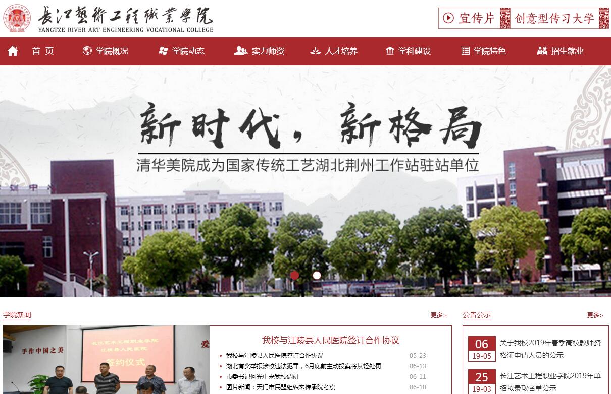 长江艺术工程职业学院是经湖北省人民政府批准、省教育厅主管的全日制普通高等职业院校,坐落在中国首批历史文化名城湖北省荆州市,位于荆州市国家级经济技术开发区,占地面积600亩。学院拥有专任教师300余人,其中,教授、副教授和硕士学位以上教师占40%,楚天技能名师近20人、省级以上民间工艺传承大师30余人。学院开设有工艺美术品设计(楚式漆器工艺等方向)、刺绣设计与工艺(楚汉刺绣设计与工艺)、数字媒体艺术设计、新能源汽车技术、护理(健康养老)、电子商务、旅游管理、酒店管理、财务管理等专业。学院是人社部认定的全国28所职业训练院之一,是湖北省非物质文化遗产生产性保护示范基地、湖北省科技孵化器和湖北省广告人才培养基地。学院为学生建有学习传统文化的3A景区——荆楚非物质文化遗产技能传承院,也是学生实行互动式传习与场景化教学的场所。学院还建有荆楚非物质文化遗产博物馆、医学护理(健康养老)实验实训中心、新能源汽车实训中心等实习实训场所。学院以“工匠精神荣耀中国造”为历史使命,通过对学生的培养让学生,具备“就业和创业”两大本领;具备“个性化、人文化、数字化和国际化”四种素养;具备“审美能力、表达能力、动手能力、运用能力和创作能力”五种能力。为适应区域经济和社会发展需要,学院立足荆州,服务湖北,辐射全国,围绕传统手工技艺和现代智造技艺服务业,培养生产、建设、服务、管理一线的高素质技术技能型创意人才。长江艺术工程职业学院,依托校内文化教研所——荆楚非物质文化遗产技能传承院的引领,融合文化技艺传承与专业技能教育,创新特色的办学理念及教学模式,定位“创意型传习大学”升级大学教育模式,以服务产业升级、引领中国创造为价值导向,打造一所世界一流、体现文化传承之美的创意型大学;整合湖北十八匠文化发展投资有限公司、创业职教集团和荆楚非物质文化遗产技能传承院三方资源,融合产业、教育、科研领域的优势资源,打造一所引领产业发展、培养技艺精湛的创意型专才的特色大学。