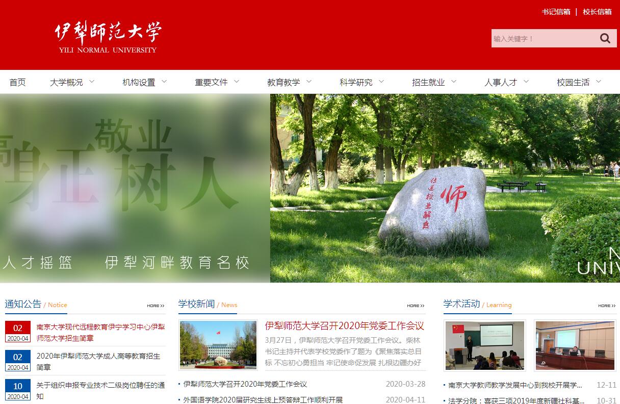 伊犁师范大学是一所隶属新疆维吾尔自治区教育厅管理的普通高等师范学校,具有悠久的历史。学校前身是1948年成立的新疆省立伊犁专科学校,1953年更名为伊犁师范学校,1980年经国务院批准升格为普通本科院校,定名为伊犁师范学院。2018年12月,经教育部批准更名为伊犁师范大学。学校设有人文分院、数学与统计分院、中国语言分院、物理科学与技术分院、电子与信息工程分院、化学与环境科学学院、生物与地理科学学院、外国语学院、马克思主义学院、法学分院、体育分院、艺术分院、教育科学学院等13个学院;开设49个本科专业,涉及文学、理学、教育学、工学、历史学、法学、艺术学、管理学、经济学和农学10个学科门类。拥有中国语言文学、数学、物理学、法学、教育学、化学、生物学7个一级学科硕士学位授权点,工程硕士、教育硕士、体育硕士3个专业硕士学位授权点。学校拥有中国语言文学、物理学、数学3个自治区重点学科,生物科学、应用化学、应用物理学3个自治区重点专业,哈萨克语言1个国家高等学校特色专业建设点。学校现有教职工941人,其中专任教师621人,具有高级职称教师246人。在校普通本科生12868人,专科生657人,硕士研究生609人。学校占地总面积124.69万平方米,教学、科研仪器设备资产总值12807.41万元。图书馆总藏书量132.02万册,其中纸本馆藏89.22万册,电子馆藏42.8万册,在线数据库6个。当前,学校正以习近平新时代中国特色社会主义思想为指导,坚持党管教育根本原则,坚持社会主义办学方向,秉承“品正学实”的校训,发扬爱国、崇德、勤奋、求实的光荣传统,努力建设成为办学特色鲜明,重点学科领先,教师教育优势突出,服务社会能力强劲,区内先进、国内有重要影响的高水平师范大学。