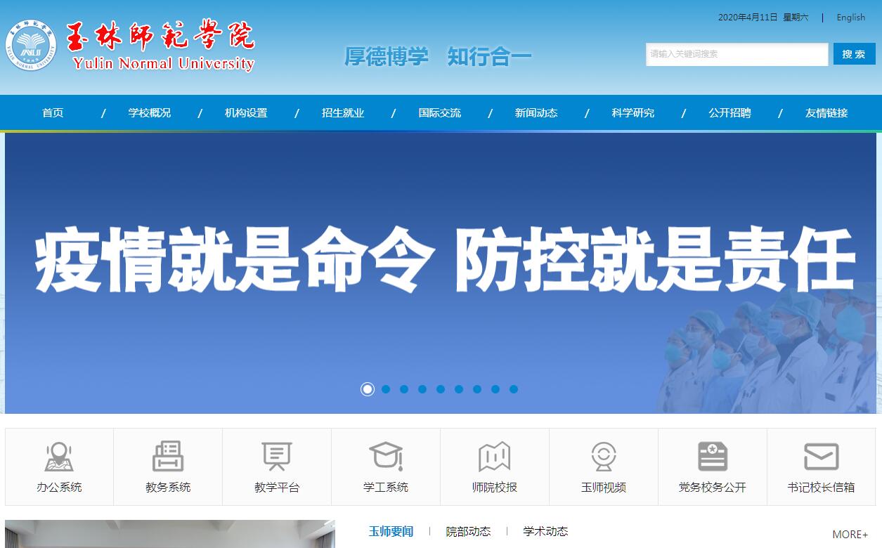 玉林师范学院坐落在著名的语言学家王力的故乡、中国优秀旅游城市、广西东南部的千年古城玉林市,占地面积1746亩,是广西壮族自治区直属全日制普通本科高校。学校创办于1945年,原名广西省立鬰林师范学校,1952年春改名为玉林师范学校,1958年升格为广西玉林专区师范专科学校,开始招收高等教育层次的专科生。1962年更名为玉林专区师范学校。1978年经国务院批准恢复玉林师范专科学校。1994年更名为玉林师范高等专科学校。2000年,经教育部批准,玉林师范高等专科学校、玉林市教育学院、玉林市高等职业技术学院、广西广播电视大学玉林分校,合并升格为玉林师范学院。2007年以优异的成绩顺利通过教育部本科教学工作水平评估。2013年被列为广西新增硕士学位授予单位立项建设项目单位,2014年被列为广西新增硕士专业学位授予单位立项建设项目单位。同年,开始与陕西师范大学、广西师范大学联合培养教育硕士研究生。2015年成为自治区首批综合改革试点院校与整体转型试点院校。2016年成为广西应用型本科高校联盟理事长单位,入选教育部数据中国“百校工程”合作院校。学校成立后,实现了由资源整合、力量聚集到快速发展的转变,现已发展成为一所含本科教育、高等职业技术教育、成人高等教育和留学生教育,具有教师教育特色的综合性本科院校。学校设有17个二级学院,学科涵盖了经济学、法学、教育学、文学、历史学、理学、工学、管理学、农学、艺术学等10大学科门类 ,有59个普通本科专业。学校面向全国25个省(市、自治区)及东南亚国家招生,现有全日制在校生17542人,另招有一定数量的成高生,联合培养在校研究生101人(与陕西师范大学、广西师范大学等高校联合培养)。学校秉承“以德为先,艰苦奋斗”的优良传统,始终坚持面向农村基层培养基础教育师资,已经形成了以师德教育为核心,以能力培养为重点,以多媒体网络环境为支撑的基础教育优质师资和应用型人才培养体系,为地方基础教育和经济社会发展培养了10万多“下得去,留得住,有作为”的义务教育师资和应用型高级专门人才。学校现有教职工1123人,其中专任教师741人,正高职称87人,具有博士学位120人、硕士学位540人,具有博士、硕士研究生导师资格70人,享受国务院政府特殊津贴2人,全国教育系统先进工作者1人,全国优秀教师1人。获评自治区级各类教学与科研创新团队10个,获评厅级以上各类人才及各类培养骨干人选共170余人次。学校育人成绩显著,先后获评为广西高校师范专业办学能力提升计划项目首批示范性教师教育基地、广西21世纪园丁工程B类教师培训基地、广西第一批初中教师教育基地、广西第一批幼儿园教师教育基地、广西小学教师教育基地、广西高校“大学生创业教育示范基地”,获得广西实验实训教学示范中心2个,广西虚拟仿真实验中心1个。区级优秀教学团队4个, 学校年均就业率均保持在90%以上,连续六年荣获“全区普通高等学校就业工作先进集体”,2016年获“全区普通高校毕业生就业创业工作突出单位”荣誉称号。有一批依托学校建设的重点科研平台和基地,其中:省级重点实验室1个(广西农产资源化学与生物技术重点实验室),广西高校重点实验室2个(广西高校桂东南特色农产资源高效利用重点实验室、广西高校复杂系统优化与大数据处理重点实验室),广西高校人文社会科学重点研究基地1个(广西高校民族地区文化建设与社会治理研究中心),广西高校重点实验室培育基地1个(广西高校桂东南珍稀经济物种保护利用重点实验室培育基地),广西教育科学重点研究基地1个,广西重点学科3个(应用数学、生物化工、中国现当代文学)。学校先后被授予“自治区级文明单位”、“全国五四红旗团委”、“全国社会实践活动优秀单位”、“全国绿化模范单位”、“全国模范职工之家”等荣誉称号。学校将遵循“厚德博学、知行合一”的校训,坚持“地方性、应用型、师范性”的办学定位,努力把学校建设成为国内知名、区内领先、以教师教育为特色的高水平地方应用型大学。