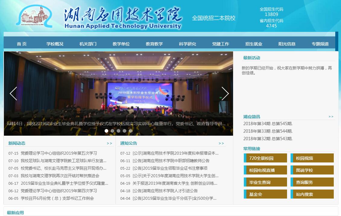 湖南应用技术学院是教育部批准的全日制本科院校,坐落在湖南常德市江南城区,规划总面积2145亩,现已建设1057亩,建筑面积30多万平方米。学校始创于1994年,时称常德电脑技术学校;1998年成为高等教育学历文凭试点院校,更名为常德电脑专修大学;2004年升格为国家统招大专院校,更名为湖南同德职业学院;2014年升格为国家统招本科院校,更名为湖南应用技术学院。学校现设有经济管理、机电工程、设计艺术、信息工程、农林科技、外国语、文化传媒学院、马克思主义学院、公共课、创新创业就业学院及继续教育学院,开办18个本科专业和20多个专科专业(方向)。现有教职员工743人,其中专职教师459人,正副教授184人,博士19人,硕士202人,“双师型教师”占教师总数的69%,有来自16个省市自治区15个民族的在校本、专科学生9900余人,教育教学、实训、文体、生活设施一应俱全,有校内多功能实验室和实训场馆基地125个,校外固定实习实训基地80多个,创业创新工作室70多个,校内外创业孵化基地6个,馆藏图书110多万册,配套电脑3000多台,宽带网络闭路电视覆盖全校,毕业生就业率达96%以上。学校教师公开发表教学、科研论文2000余篇,出版专著及教材36部,获得国家发明专利109项,获得省部级教学、科研奖励11项,承担各级各类省重点及青年教学、科研项目138项。学校先后获得湖南省就业“一把手工程”优秀院校等170多项国家、省、市级荣誉称号。《人民日报》、《中国教育报》及湖南教育电视台等多家媒体对我校做了专题报道,被誉为“应用型、创新型人才培养的摇篮”。