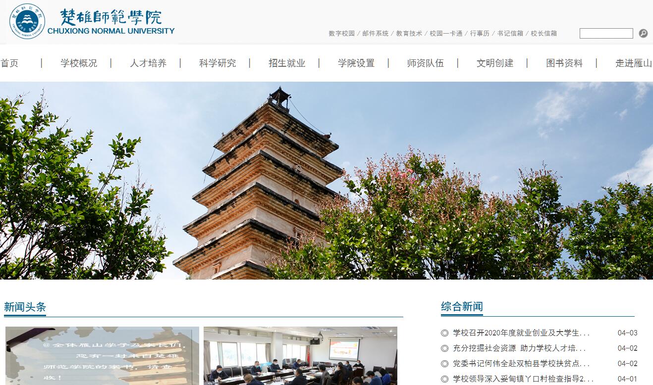 楚雄师范学院是云南省属全日制普通本科高校。2001年5月,经国家教育部批准,在原楚雄师范高等专科学校和楚雄民族师范学校合并基础上组建成立。2009年荣获中央文明委授予的“全国文明单位”称号,是云南省高校中第一家获此殊荣的学校。2010年通过国家教育部本科教学合格评估。2014年被教育部列为“卓越小学教师培养计划改革项目”国家级项目单位。2015年获批为云南省地方大学应用型整体转型改革试点高校。2016年“教育学”入选云南省一流学科(高原学科)建设项目。2017年被中央文明委授予“全国文明校园”,是云南省唯一获此殊荣的高校。2018年顺利通过教育部本科教学审核性评估。目前,正在着力建设以教师教育为特色的边疆民族地方应用型品牌大学。学校位于享有“东方人类故乡”、“恐龙之乡”、“优质野生菌王国”、“中国彝族文化大观园”美誉的云南省楚雄彝族自治州州府楚雄市。气候条件优越,常年平均气温16℃,冬无严寒,夏无酷暑,四季如春。距云南省会昆明100余公里,交通便利,有昆明“后花园”之称。学校土地总面积623.18亩,分为花果山、雁塔两个校区。校园环境优美,数字化校园网络畅通,移动图书馆方便快捷。学校坚持应用型大学的办学定位,彰显“以应用为根本,师范为特色,应用型人才培养特色鲜明,教师教育优势突出,促进边疆民族地方经济建设与社会事业发展成效明显”的办学特色,秉承“树德明理,蕴智强能,学用一体,知行合一”的教育理念,以“思想品德优,专业基础实,职业能力强,综合素质高、工作适应快”为人才培养基本目标,以“上手快,后劲足,能创新,品行好”为特色目标,着力为地方经济建设和社会事业发展培养高素质应用型人才。学校面向全国25个省(市、自治区)招生。现有全日制在校生11722人,学历函授生2000余人,每年非学历培训千余人次,连续十一年获得云南省“毕业生就业工作先进集体”。有教职工758人,其中专任教师558人,博士、硕士400余人,正高级、副高级职称人员237人,其中二级教授6人;有云岭学者1名,云岭教学名师1名,省级教学名师5名,省级学术技术带头人及后备人才11名。学校目前开设56个全日制本科专业, 30余个函授本科专业。分布在文、法、理、工、农、经济、管理、教育、艺术9个学科门类。目前有省级规划硕士学位授权点建设学科3个,省级优势特色重点学科1个,国家级特色专业1个,省级优势特色专业5个。学校以服务地方为己任,积极开展科学研究与社会服务。共有国家级、省部级项目百余项,有厅级、校级和横向项目千余项。建有省哲学社会科学研究基地1个,省高校重点实验室(及培育基地)3个,省哲学社会科学创新团队2个,省高校科技创新团队2个,校县共建研究基地2个。有国家级“卓越中小学教师培养计划改革项目”1项。科研成果获省级及其以上奖励百余项,国家专利获授权近30项。同时,成人职业继续教育与省内外知名大学、企事业、基层一线合作共建,建立了国家基础教育师资培训点、职业技术资质培训中心等各级各类培训基地,全方位、多层次、多形式为地方教育事业、企业和行业服务。学校大力加强对外开放办学,先后与新加坡、泰国、美国、越南、台湾以及国内多家高校建立办学合作关系,开展联合培养、科技合作、境外实习等国际合作项目,推进学校向开放型、国际化发展。学校先后荣获“全国文明单位”、“全国文明校园”、“全国精神文明建设工作先进单位”、“云南省文明单位”、“云南省文明学校”等20余项光荣称号。学校办学整体水平和影响力不断提升。