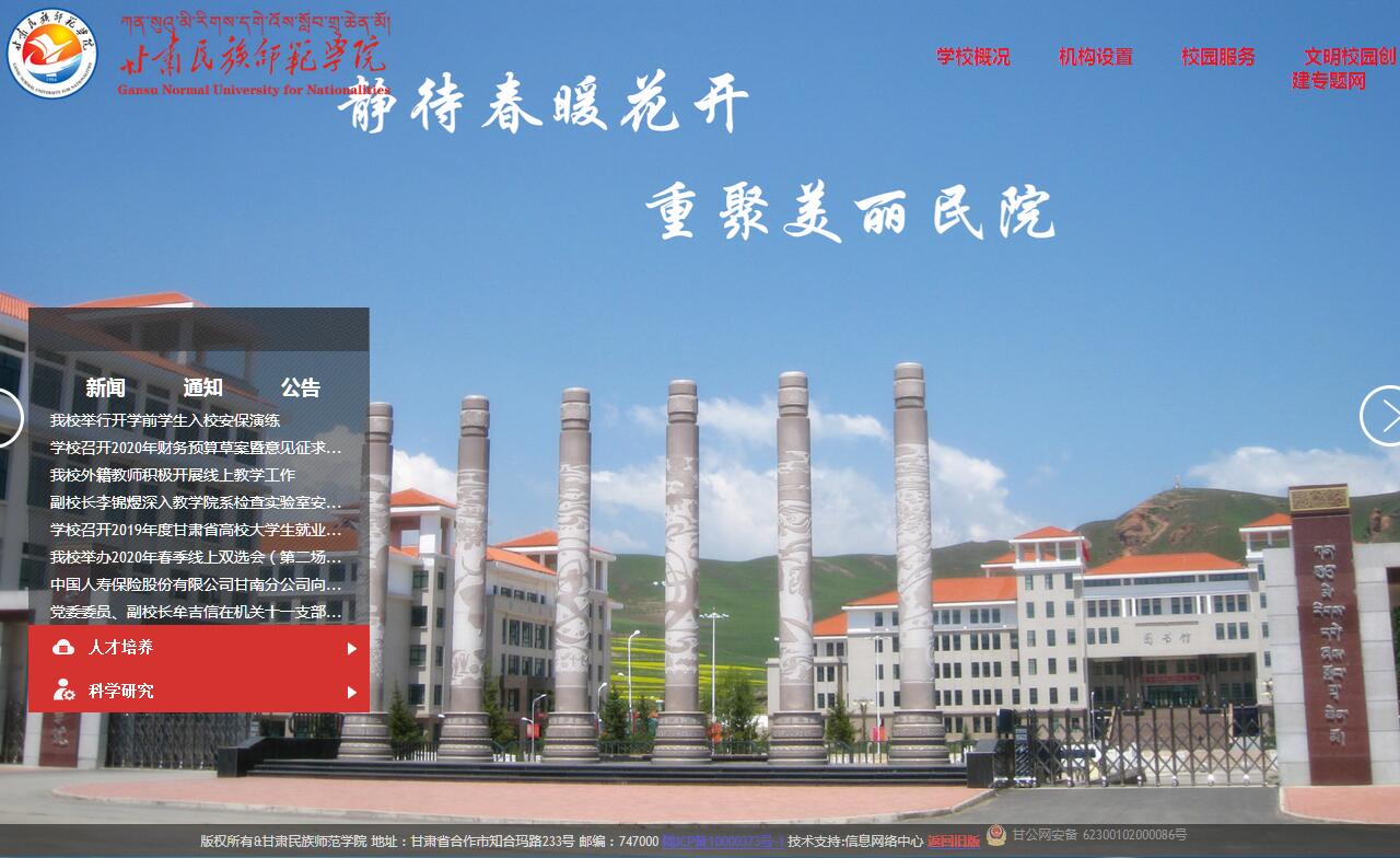 甘肃民族师范学院位于内地通往藏区的门户——甘、青、川三省交界处的甘南藏族自治州首府合作市。学校前身是合作民族师范高等专科学校,始建于1984年10月。1986年5月16日,时任中共中央总书记胡耀邦同志在甘南视察时亲笔题写了校名。2009年3月,学校升本改建为甘肃民族师范学院,是甘肃省唯一一所省属民族师范院校。2013年5月,确定为国家民委与甘肃省人民政府共建学校。学校占地近千亩,校舍建筑总面积31.07万平方米,其中教学行政用房总面积15.60万平方米,实验实训室总面积2.98万平方米。固定资产总值约7.13亿多元,教学科研仪器设备总值达1.076亿元;馆藏各类图书文337.3万册,纸质图书71.8万册。建有校内实验实训室142个,校外实训实习基地93个。校园网实现全覆盖。学校现有教职工700人,其中专任教师506人,占教职工总数的72%;教授51人,副教授152人,硕士研究生以上学历教师356人,占专任教师总数的63.2%;副高级以上职称教师187人,占专任教师总数的37%。国务院政府特殊津贴专家2人,全国模范教师1人,全国优秀教师1人,省级教学名师1人,甘肃省领军人才2人,甘肃省少数民族地区杰出人才3人,甘肃省“555”人才工程1人,甘肃省“园丁奖”12人,甘肃省普通高等学校“青年教师成才奖”13人,全省宣传文化系统“四个一批”人才培养工程2人。学校招生以甘肃为主,面向青海、四川、云南、西藏、内蒙古、宁夏、陕西、山西、贵州、广西、山东、河南、黑龙江、吉林和辽宁等16个省区。现有各类普通在校学生10897人,由汉族、藏族、回族、裕固族、保安族、东乡族等25个民族组成,少数民族占68%,是内地藏族学生人数最多的高校之一。学校现设有16个教学院系(部),49个本科专业及方向,涵盖教育学、理学、文学、法学、历史学、艺术学等9个学科门类。建有1个国家级特色专业建设点,4个省级特色专业,2个省级教学团队,省级精品课程8门,获省级教学成果奖18项。建有1个国家民委人文社会科学重点研究基地,2个国家民委重点建设学科,1个国家民委重点研究中心,2个省级重点学科,1个省级重点实验室和2个省级重点研究培育基地。现有甘肃省藏文古籍文献编译中心、中国藏学研究中心《中华大典·藏文卷》编纂工作站、安多藏文化研究中心、河洮岷文化研究中心、西北少数民族教育研究中心、高寒生态系统研究所等12个研究机构。升本以来,学校教师发表论文2101篇,其中在SCI、EI、CSSCI分别收录13、34、86篇;授权专利35项;出版专(译)著百余部,教材近百部;承担科研项目307项,其中国家及部委项目25项、省级项目38项、厅级项目45项、横向项目18项、校级科研项目181项;获省级以上奖励12项。近年来,学校以科学发展观为统领,全面贯彻党的教育方针,遵循高等教育发展规律,落实《国家中长期教育改革和发展纲要(2010-2020年)》,立足自身办学基础和发展优势,确立了“以阳光品质办阳光大学”的办学理念,确定了跨越建设,转型发展、深化内涵、提高质量的发展思路,进一步理清办学思路、明确办学定位、突出办学特色,明确了发展目标。办学指导思想:以科学发展观为指导,紧紧把握现代高等教育发展趋势,紧紧贴近民族地区经济社会发展要求,紧紧围绕自身实际和差异优势,以发展为主线,以改革为动力,以质量求保证,完善培养体系,突出办学特色,拓展办学功能,创新发展思路,加快应用型转型步伐,提高办学水平和服务区域经济社会发展的能力,努力把学校建设成为区域内高水平有特色的应用型民族大学。办学定位:在服务面向上,立足藏区,面向全省及周边民族地区;在办学科类上,以教师教育为主,兼顾本地区特殊应用人才的培养;在办学层次上,以普通本科教育为主,兼顾成人教育和职业教育;在人才培养规格上,努力培养充分适应民族地区要求的“政治可靠、扎根基层、业务适切”的社会主义建设者和接班人。办学特色:民族师范教育特色:建立适应民族地区基础教育需要的教师教育专业体系;突出藏汉双语人才培养,做强以民族基础教育为主要方向的教育学科。藏区文化特色:发挥甘南作为安多藏文化中心的区位优势,做强藏文化学科,将学校建设成为安多藏区文献典藏中心、科学研究中心和文化传播中心,形成体现藏区社会文化特点的专业和专业方向。高原经济特色:以服务区域的支柱产业为导向,做强高原生态与民族区域经济学科,形成一批与高原区域经济紧密结合的专业,为藏区经济产业结构的优化升级提供多方面的服务。建校以来,学校党委团结和带领全校师生员工,立足高原,艰苦创业,开拓创新,与时俱进,有效发挥了人才培养的基地、科学研究的平台、文化传承的窗口和维护社会稳定的阵地的作用,先后为民族地区培养2万余名合格人才,在促进民族团结、维护民族地区社会稳定,加快民族地区经济社会发展、构建和谐社会中做出了应有的贡献。2009年、2014年学校两次被甘肃省委、省政府授予“民族团结进步模范集体”荣誉称号;2012年被甘肃省委宣传部、省委统战部、省民委命名为全省首批“民族团结进步教育基地”;2013年被确定为甘肃省第十一批“精神文明建设先进单位”;2015年获教育部全国高校校园文化建设优秀成果奖。
