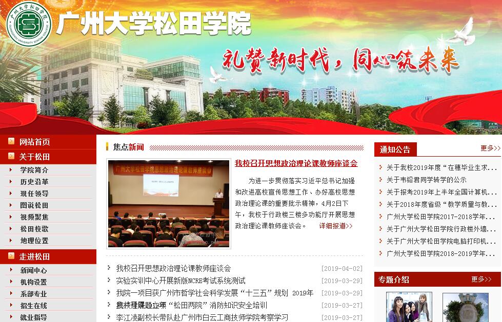 广州大学松田学院始建于2000年9月,座落在美丽富饶的荔枝之乡——广州市增城。2004年4月,经教育部批准,学院升格为独立学院,实现了由专科向本科教育的跨越。2005年1月,学院顺利通过了教育部专项检查。2011年,学院及15个申报专业一次性通过了广东省学位委员会组织的学士学位授予权评估。学院为全日制普通本科院校,面向全国统一招生,学制四年,学生成绩合格者由学院颁发“广州大学松田学院”具印的、教育部统一电子注册的本科毕业证书,符合学院学士学位授予规定者,授予相应学士学位。松田学院毗邻324国道(广汕公路),距广州市中心50公里。学院校园占地面积540亩,校舍总面积21.7万平方米。目前,学院设有8系2部,即电气与汽车工程系、计算机科学与技术系、管理学系、经济学系、法政系、外语系、艺术与传媒系、社会体育系、通识教学部、社会科学部,设有28个本科专业,涵盖了文学、法学、经济学、管理学、教育学、工学、艺术学等七大学科门类;全院在校学生9500多名。学院现有专任教师400余人,其中正、副教授100多人,全院教师获得市级以上表彰50余人次,并有多人获得“南粤优秀教师”、“广州市优秀教师”、“增城市优秀教师”等光荣称号。筚路蓝缕,弦歌不辍。学院坚持“教学立校,特色兴校,人才强校,服务荣校”的办学理念,以创新独立学院管理体制和运行机制为动力,依托母体学校广州大学的资源和平台,坚持规模、质量、结构、效益协调发展;以办学条件建设为基础,以师资团队建设为关键,以学科建设为龙头,以应用型本科人才培养为根本,以教育教学质量和特色谋发展,努力为广东经济社会发展作出贡献。学院以培养掌握一定专业基础知识、学科基础知识和具有一定社会适应发展能力的高素质复合型、应用型本科创新性人才为目标,按“宽口径、厚基础、高素质、强能力”培养要求,强调适应市场需要,制定并实施了“平台+模块”的人才培养方案,重视实践教学环节,强化计算机和外语应用能力训练。学院注重学生思想政治教育,积极完善学生管理体系,提高管理水平,营造全方位的“教学育人、管理育人、服务育人”的学生成长氛围。学院根据生源的基础和社会对人才需求状况,将学生的素质教育放在首要位置。近年来,学院先后成功地举办了艺术系师生书画作品远赴新加坡和法国巴黎的展出;我院学生参加全国大学生数学建模、全国大学生电子设计竞赛、全国大学生广告艺术大赛、全国大学生英语竞赛等各级各类竞赛,127人和5个集体在国家级竞赛中获奖,340人和33个集体在省级竞赛中获奖,106人和13个集体获广州市级奖励。有183人考取硕士研究生,143人通过全国司法考试。有104人获得国家奖学金,1522人获得国家励志奖学金。学院还先后被广州日报报业集团评为“改革开放30周年广东最具竞争力独立学院奖”、“ 改革开放30周年广东最佳就业服务奖”,连续七年被增城市人民政府授予“增城教书育人先进集体”等荣誉称号,校园绿化荣获“广州市花园式单位”称号。现在,广州大学松田学院正顺应着中国高等教育大众化的时代潮流,贯彻教育部“积极支持,规范管理,鼓励创新,提高质量”的方针,为把学院建设成为与社会经济发展需要相适应的,综合实力和办学水平居全国独立学院先进行列的高等院校而努力奋斗!