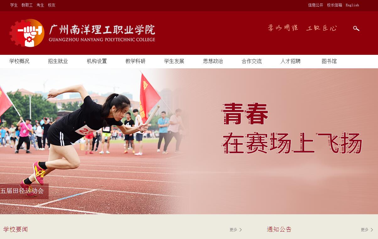 广州南洋理工职业学院,是经广东省人民政府批准、国家教育部备案的省属全日制普通高等学校,简称“南洋理工”。学校与广东科技学院、广州华南商贸职业学院同属广东南博教育集团旗下的高等院校,依托南博教育集团雄厚的办学实力与集团化办学优势,取得了卓越的办学成绩,赢得了社会各界的一致好评。学校以“创百年学府,育产业精英”为愿景与使命,遵循“育人立校,质量兴校,人才强校,特色荣校,制度治校”的办学理念,立足广州、面向珠三角、服务广东,主动适应珠三角产业结构和区域经济社会发展需求,深入推进基于“产教融合、校企合作、工学结合、顶岗实习”的人才培养模式改革,致力于培养“德才兼备,技能突出,全面发展”的应用型、高素质技术技能人才。2016年底,学校正式确立了“十三五”期间升格为本科院校的发展目标。近年来,学校大力推进由外延式发展向内涵式发展的转变,着力打造“思想道德好、实践技能高、综合素质高和就业质量高”即“一好三高”的人才培养特色。先后被民政部授予“全国民办非企业单位优秀服务品牌”称号;被教育部国防教育办公室、全军学生军训工作办公室授予“优秀组织单位”称号;被广东省教育厅评为“广东省就业工作督查优秀等级”,并荣获“最具竞争力提升院校”称号。学校还先后荣获“广东省民办教育突出贡献奖”、“广东最具就业竞争力民办学院”、“广东最具社会认可度学院”、“广东省国防教育先进工作单位”、教育部“国防教育特色学校”等殊荣。目前,广州南洋理工职业学院正站在新的历史起点上,为把学校建设成为广东一流、全国知名的高水平民办理工类大学而努力奋斗!学校发展历程:广州南洋理工职业学创建于1984年,其前身为“广州南洋自学辅导大学”,后于1996年更名为“广州南洋科技专修学院”,2004年经广东省人民政府批准、国家教育部备案设立“广州南洋理工职业学院”,正式升格为全日制普通高等学校。办学条件基本完善:学校坐落在有“广州后花园”之称的广州市从化区。设有建筑工程学院、机电与汽车学院、信息工程学院、经济管理学院、服装与设计学院、外国语学院、中医健康学院、马克思主义学院、通识教育学院九个二级学院;现有全日制专科在校生11235人,教职工700余人,其中专任教师近500人;校园面积509亩,校舍近20万平方米;拥有先进的专业实验室(场)120个,多媒体教室156间,教学仪器设备总值达 4700多万元,普通课室全部安装空调;图书馆馆藏纸质图书88万多册、电子图书41万册;学生公寓全部装有空调、宽带,提供热水供应等,并在生活区建有商业一条街等生活配套设施,获评“广东省学校卫生管理评价优秀学校”。教育教学改革成效显著:学校专业设置以工科类专业为主,经、管、文、艺类专业协调发展,现有招生专业41个,其中省级品牌专业1个,省财政重点支持专业5个,校级重点专业8个;5项省级教学成果培育项目获省教育厅立项;“高职院校‘技能优先 基础模块’教学改革研究”入选2016年度民办职业技术教育“十佳”案例;依托“学生军政教导队”创新大学生思想政治工作模式,成效显著,先后荣获国家级奖项5项、省级奖项13项、市级奖项5项。人才培养质量不断提高:学校遵循“以赛促学,以赛促教,以赛促改”的原则,积极组织师生参加各级各类技能大赛,在校生在全国职业院校技能大赛、全国网站设计开发大赛、全国跨境电商大赛、全国电子商务类三创大赛等赛事中成绩优异;毕业生就业率一直保持在98%以上。根据第三方调查机构麦可思报告,学校在广东省高职院校毕业生就业现状满意度调查中排名全省第二;根据权威媒体广州日报作为第三方评估机构发布的“2017年全国民办高职高专排行榜”显示,我校位居全国民办高职高专院校排名第29名、广东省民办高职高专院校第3名。科研实力大幅提升:近五年来,学校教科研实力及社会服务能力快速提升,先后有100多项科研课题获立项,科研经费位居全省民办高职院校第二;多次获评“广州市科普先进集体”、“广州市先进企事业科协”。