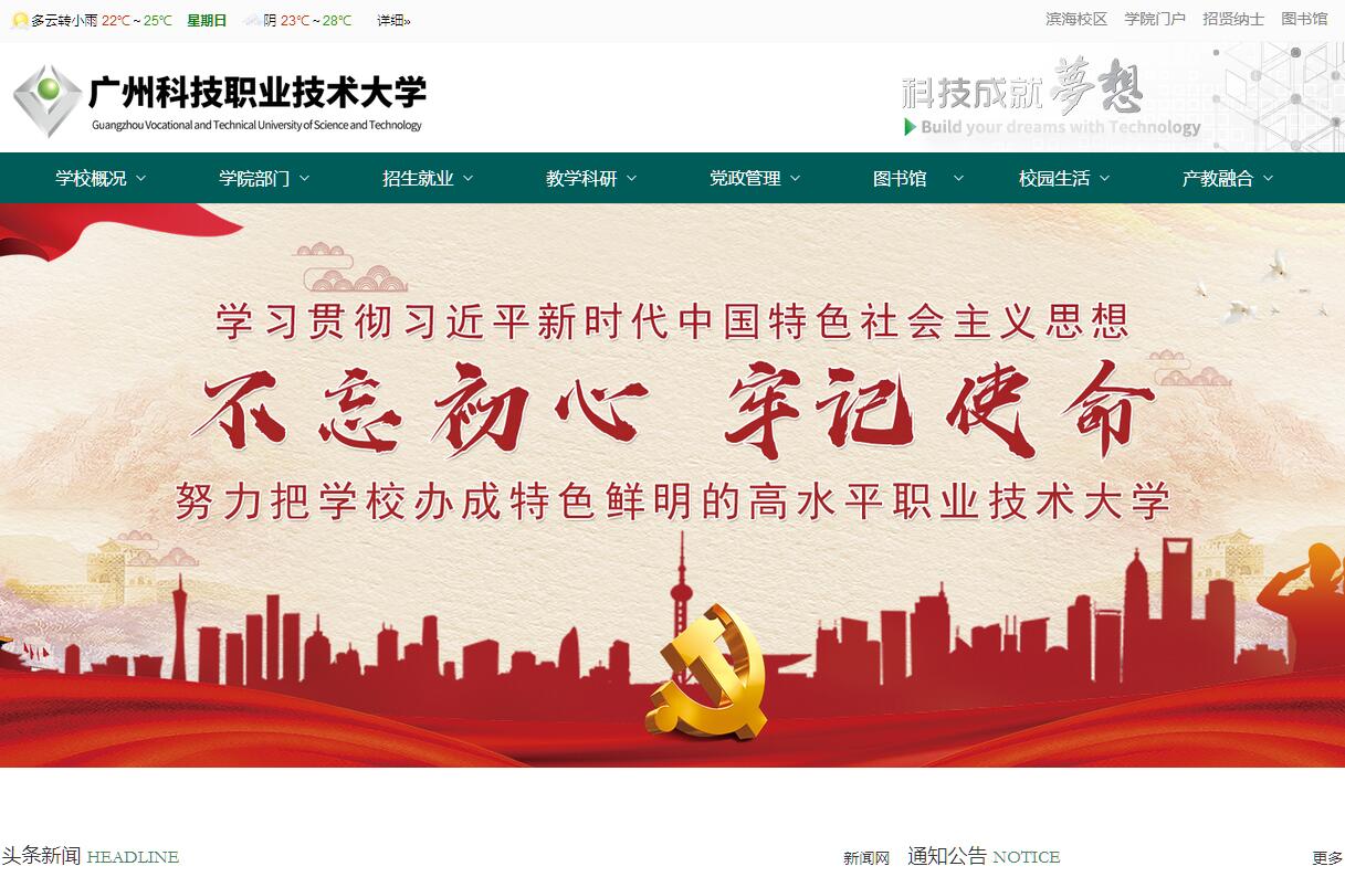 1999年,广东景大经济发展有限公司投资创办了广东南大专修学院。2002年,与广州医学院合作举办广州医学院南大学院,2004年经广东省人民政府批准成为广州科技职业技术学院,2018年升格为本科层次职业学校,2019年经教育部批准,更名为“广州科技职业技术大学”。学校形成一校两区的发展布局。广州校区位于白云区钟落潭高校园区内,滨海校区位于茂名市教育基地“智慧城”高地片区。两校区占地面积共1607亩,建筑面积60万平方米。现有全日制在校生18000多人,教学科研仪器设备总值1.17亿元。图书馆馆藏纸质图书187万册。专任教师1195人,副高级以上专业技术职称教师394人,其中正高级86人,具有硕士学位以上的教师717人,“双师型”专任教师598人。学校软硬件建设已为培养职业本科人才打下坚实的基础。学校设有8个二级学院,建立起以工为主,经、管、文、艺多学科协调发展的专业体系,已开设本科专业14个,专科专业40个。拥有广东省品牌专业1个,省级重点专业2个,省级教学团队2个,优秀教学团队1个,省级专业领军人才1人,省级精品资源共享课1门。广东省工程技术研究中心1个,广东省普通高校工程技术开发中心1个,广东省高校思政课区域协同创新中心1个。广东省高技能人才培训基地,广东省博士后创新实践基地,广东省教育研究院民办教育研究基地。拥有印刷技术等省级实训基地、公共实训中心8个,香江酒店等校外实践教育基地5个。建有校外实习就业实训基地600个,校内实验实训室162间,2020年学校获广东省教学成果一等奖一项,二等奖一项。学校以“快乐体育、时尚体育、交际体育、终身体育”的理念进行体育教学改革,以俱乐部教学模式代替传统教学模式,设有15个体育俱乐部,改革后,成果丰硕,多个项目在国家和省级比赛中获得冠军。先后成立了新能源新材料研究所、机器人应用技术研究所、机电工程研究所、新能源汽车研究所、数码印刷研究所、区块链技术研究院和院士工作站等科研机构。近年来,学校获校外课题及项目93项,经费总额1772万元,获专利授权达238件,其中发明专利30件,跻身全国500强。教师发表论文1267篇,其中核心期刊183篇、被SCI等四大索引收录120篇;出版著作和教材99部。获市级科学技术奖3项,2017年获得广东省科学技术三等奖。学校形成“产学研用融合、教学做一体化、以研究促创新、以创新带动创业”的办学特色。依托印刷技术专业创办广州广科彩色印务有限公司等经济实体4家,学校按照“开一个专业,办一个实体,搭一个平台,孵化一批公司”的思路,孵化出学生创办的公司93个。广科创谷被评定为广州市创业(孵化)示范基地和国家级众创空间。2017、2018年连续两年被评为广东省A级众创空间。酒店管理专业产学研实践案例入选教育部“2012-2014年中国高校产学研十大优秀案例”,并获得中国产学研合作创新与促进奖。学生参与科技创新成果显著,2016年获全国应用型人才综合技能大赛“创新创意一等奖”1项,获全国电子商务技能大赛一等奖1项,2017年获全国科技发明制作类一等奖1项,2018年获全国大学生数学建模竞赛一等奖1项,2019年获全国机械行业职业教育技能大赛二等奖1项,共获省级及以上技能大赛奖项320多项。学校全面贯彻党的教育方针,坚持立德树人,全员育人。思政课建设被评为全省优秀,近三年先后获得教育部人文社科基金项目3项,经费70万元。校园文化丰富多彩,定期开设“名家讲坛”、每年举行技能文化节、读书文化节等活动,与美国、俄罗斯、印度等国驻广州领事馆合作举办“国际文化系列活动”,搭建多元文化交流平台,提高学生参与国际竞争与合作的能力。建校至今培养4万多名毕业生,学生就业率居全省前列。学校于2012年-2015连续四年荣获广东省高等教育院校(民办)竞争力10强单位。2014年,被中国职业技术教育学会授予最具特色民办高职院校称号,2019年获得纪念中国民办教育辉煌40周年广东当代民办学校突出贡献奖,当选为中国民办教育协会职业教育专业委员会副理事长单位。学校的建设发展得到了党和政府各级领导的亲切关怀与支持。秉承广东精神,打造高水平职业技术大学,深耕职业教育,培养具有社会责任感、创新创业能力、职业精神、工匠精神的高素质高层次技术技能型人才,助力粤港澳大湾区启航腾飞。