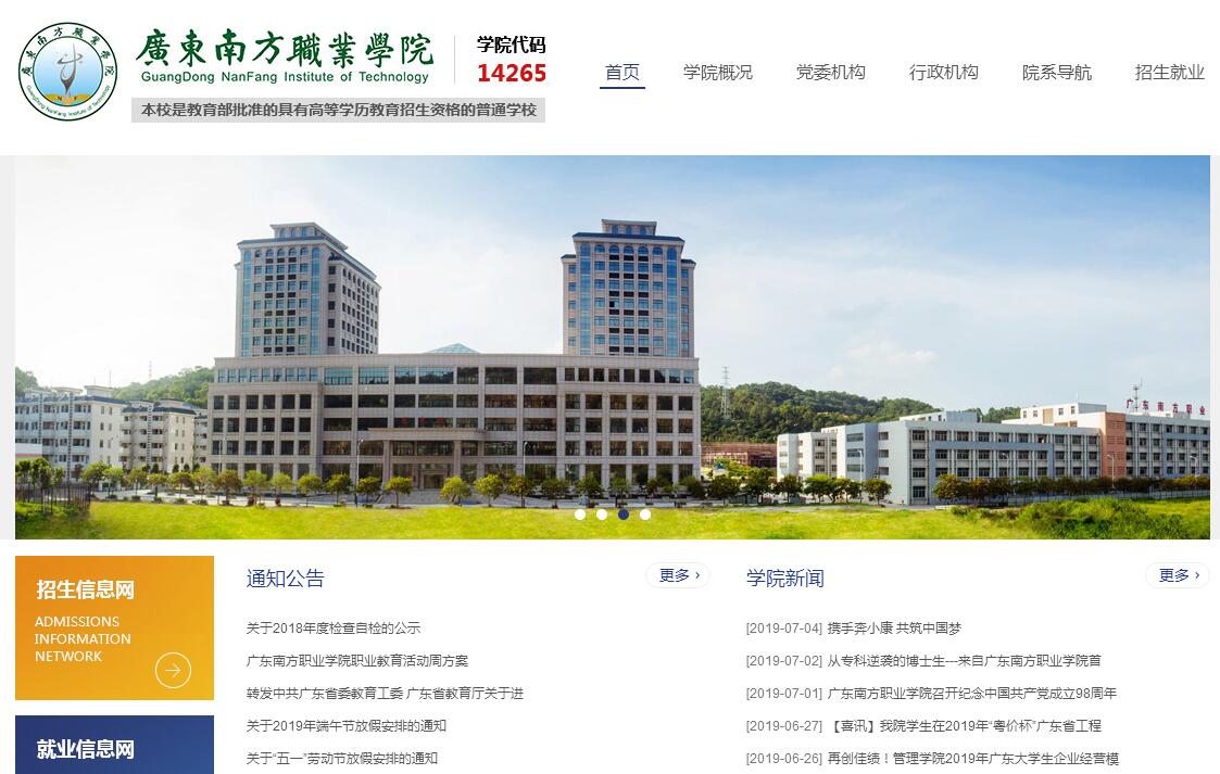 广东南方职业学院是经广东省人民政府批准、国家教育部备案的全日制普通高等院校。办学以来,学校坚持以就业为导向,把人才培养质量放在学校工作的首位,针对广东省特别是珠三角区域经济发展需求和新兴人工智能、智能制造的行业发展趋势,不断调整和优化专业结构,形成了工、经、管、文等学科全面发展的专业布局。学院招生代码:14265。学校坐落在江门市区风景区内,绿道长达6公里,占地面积1400多亩,目前建筑面积30多万平方米,全日制在校生一万多人。毕业生总体就业率每年都在98%以上,校内设立智能系统与大数据研究中心、广东南大机器人有限公司、广东智工机床装备有限公司、广东省博士后创新实践基地、广东省大学生协同创新孵化中心、广东省机器人应用技术创新基地、科技众创空间等多种实践基地。学校设有建设工程学院、智能制造学院、管理学院、经济贸易学院、信息与计算机学院和马克思主义学院、创新创业学院、国际教育学院等二级学院。全院教职员591人,教授、副教授、工程师、讲师、博士、硕士等学历的教师均按比例配备,其中副高职称以上教师占比25%,中级职称教师占比41.13%,研究生学历教师占比34.66%,双师型教师占比61.37%。教学设施齐备,教学科研设备总值6546.93万元。所有课室均配有多媒体教学设备,各专业均配套相应的实验实训室,建有VBSE虚拟社会商业环境实训中心、工业4.0模拟生产车间、数控加工中心、会计手工模拟实训室、ERP沙盘模拟综合实验室、计算机实训实验室、商务运行实训室、模拟导游室、物流企业运营沙盘实训室、电路基础实训室、土力学实训室、PLC技术实训室、通讯工程实训室、工业机器人智能一体化生产线等50多个大型实训实验室。学校图书馆大楼包含图书馆、阅览室、科技创新创业和国际学术交流等功能,全面引入人工化智能管理,图书馆藏书120万册,各类期刊1000余种,阅览室配备5000余座位。学校内生活设施一应俱全。设有省级安全示范食堂、超市、银行、医务中心、移动通讯服务厅等生活设施。学生公寓配有独立空调、空气能热水、直饮水、免费互联网。校园环境湖光山色、鸟语花香,是读书治学的好地方。学校交通方便,市中心多路公交车直达学院,珠三角城际轻轨和深茂高铁近在咫尺,可达广州及全省各地,实现全省2小时生活圈。校内建有人工湖、观光亭、舞蹈健身室、大型演艺舞台、灯光球场、标准运动场、室内体育馆等休闲、体育设施。并开设轮滑、篮球、足球、武术、羽毛球、乒乓球、跆拳道、文学社、动漫社、爱心社、话剧社、英语沙龙、流行前线等40多个社团。丰富的社团活动给学生提供了一个发展自己、展示自己、挑战自己的机会。学校自办学以来,全面贯彻党的教育方针,以服务社会为宗旨,以就业为导向,产学研孵相结合的人才培养模式,以“励耘明德,止于至善”为校训,培养德、智、体、美全面发展的人才,强调明德,立德树人,德育为先,才从属德。以“求德、求知、求能、求业”为办学理念,培养学生养成良好的社会公德、职业道德、家庭美德、个人品德,在此基础上,培养以专业技能和创新能力为核心的各种能力。为深化教学改革,强化学生实习实践能力,学校创办了广东南大机器人有限公司、广东智工机床装备有限公司和广东新偲投资有限公司等高新科技校办企业,并以校办企业和科技创新孵化基地为基础,引入“新型现代学徒制”的教学模式,打造创新人才培养平台,为企业培养技术性、应用型的综合性人才。2017年,广东南大机器人有限公司被授予了“全国高新科技企业”称号。为激发学生对知识探索的积极性,使学生迅速成长为高素质技能型人才,学校积极组织学生参与各级职业技能竞赛,仅校内组织的技能竞赛每年奖金就超过百万元。自办校以来,学生在技能竞赛中获奖超过1000项。2018年,我校学生在全国大学生机器人大赛中荣获国家三等奖、在第十四届全国职业院校“新道杯”沙盘模拟经营大赛中荣获一等奖、在全国职业院校财会职业能力大赛(高职组)中荣获二、三等奖、在全国职业技能“南方测绘杯”大赛中荣获一等奖、在第七届“蓝桥杯”全国软件和信息技术专业人才大赛荣获一等奖。除此之外,在国家、省、市各专业类技能竞赛活动获奖近300项。学校先后与华南师范大学、广东外语外贸大学、广东工业大学、广东财经大学等院校合作举办了相沟通专升本;设立武汉理工大学网络教育专升本学习中心,为学生升本创造条件,并与英国纽曼大学、伦敦摄政大学等国际知名大学合作,为学生提供出国留学机会。学校与1000多家企业建立校企合作关系,打造实训、实习、就业平台,并与部分大型企业合作,设立奖学金,为企业定向培养优秀人才。