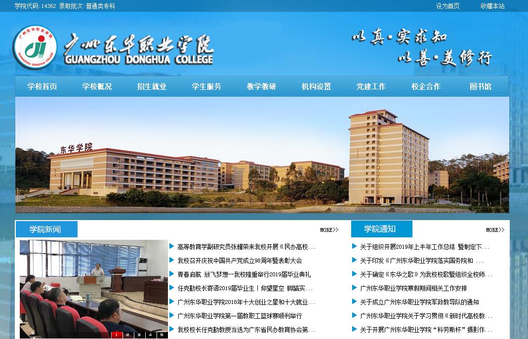 广州东华职业学院是经广东省人民政府批准设立,教育部备案,广东省教育厅主管的一所全日制普通高等院校。学院坐落于广州市白云区帽峰山风景区东侧,毗邻广州天河软件园和广州黄埔科学城,环境优美,交通便利。既是“一处都市里的学府”,也是“一所风景区里的大学”。校园占地面积758亩,基础设施完备,是读书治学、修心养性的圣地。现有在校生10000余人。学院坚持以立德树人为核心,以服务经济社会发展为宗旨,以“以真・实求知,以善・美修行”为校训,以就业为导向,突出职业道德、职业技能和就业创业能力培养,促进知识、技能、素质的协调发展。学院设有软件工程学院、工商管理学院、智能机电学院、会计与金融学院、建筑工程学院、语言与传媒学院、信息工程学院、创新创业学院、公共理论学院、继续教育学院共10个学院,开设了经管类、建筑类、艺术类、信息类、会计类等41个专业(方向)。拥有一支师德高尚、业务精湛、结构合理的教师队伍和管理队伍,同时聘请广州地区高校专家学者、行业企业能工巧匠担任学生的企业及职业导师。学院积极推动办学内涵建设,大力加强“创新强校工程”和“质量工程建设”,教学科研水平不断提高,取得了一批教学科研成果,具有多项专利技术。学院积极推行专业设置与产业需求、课程内容与职业标准、教学过程与生产过程“三对接”,学历和职业资格“双证书”制度。学院建有数控摸具、汽车维修车间,以及移动互联机器人、信工小发明、物联智能、CAD/CAM、PRO/E建筑材料等69个实训室,为学生提供良好的实训条件。学院与行业企业深度融合,与广州地铁、中国建设银行、中铁集团、广汽集团、高新技术开发区等百家企业建立了良好的校企合作关系,形成校外实训基地网络,为学生的实习与就业搭建起广阔的平台。依托实习基地,探索人才协同培养机制,开展创新创业实践,努力办出职教特色。坚持依法治校,规范管理,加强校风建设,党建工作、团学工作和社团活动有序开展,校园文化生活丰富多彩。毕业生素质好,社会评价高。毕业生总体就业率达97%以上,用人单位对我院毕业生满意度及毕业生对就业满意度均达96%以上。“大潮起珠江,敢为天下先”。目前,东华学院正以全面贯彻习近平总书记视察广东重要讲话精神为契机,实施“十三五”发展规划,进一步扩大办学规模,优化办学条件,加快内涵建设,提升人才培养质量,为把学院打造成广东高职教育的辉煌品牌而努力奋斗!