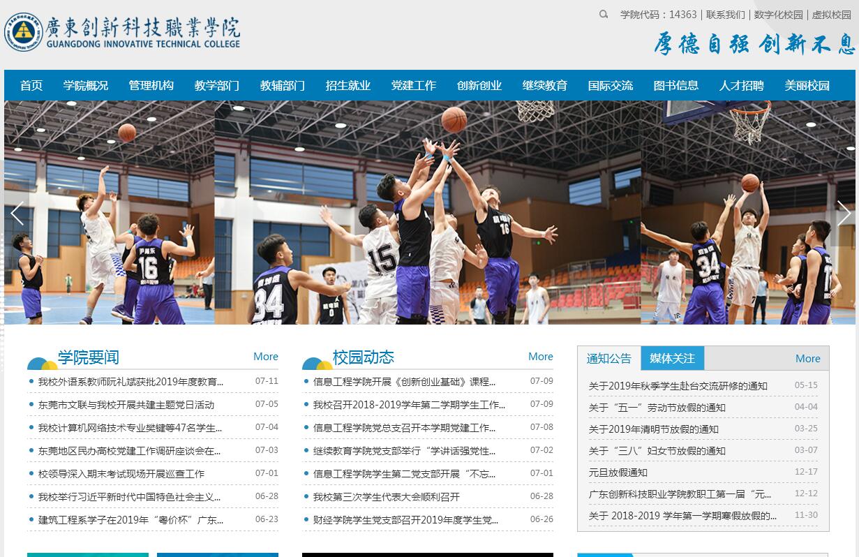 广东创新科技职业学院是经广东省人民政府批准、教育部备案、广东省教育厅主管的一所全日制普通高等职业院校。学校创建于2011年,现拥有12000多名学生规模。学校下设信息工程学院、财经学院、机电工程系、建筑工程系、管理系、艺术设计系、外语系等7个二级学院(系),开设30个专业。学校位于粤港澳大湾区的东莞市,地理位置优越、便利。学校坐落在“中国会展名镇”、“广东省中心镇”厚街镇的教育文化园区,毗邻包括世界500强企业三星集团、泰科和广东现代国际展览中心、世界鞋业总部基地、联创国际信息产业园等国家级产业园区。名企云集,产业集群,院校聚集,优势突出,人才需求旺盛,为学校办学提供坚实有力的支撑。学校环境优美恬静,依山傍水,麒麟山、孔子像、亭湖桥柳相互映照,适宜学子学习、学者修学。学校有省内同类院校最大建筑规模的图书馆,文化中心、体育馆、标准化运动场等应有尽有,整个校园布局合理,简约大气。学校坚持“高起点、高标准、严管理、创新路、铸特色”的办学方针,大力推进教育创新,深化教学改革,实施校企合作、工学结合,突出强化技能训练,提高学生的实践技能水平。校园建有一流的教学、实训实验设施,设备先进,管理规范。已建设近199个实验实训场室,教学仪器设备总值达到4000余万元。学校毕业生以其适应性强、专业技能力强、综合素质好而受到用人单位普遍欢迎和充分肯定,近年学生就业率均在98%以上。学校高度重视实践教学,坚持“校企合作,工学结合”的人才培养模式,与东莞三星视界有限公司、南兴家具装备制造股份有限公司等数十家知名企业开展校企合作,为学生实习、实训和就业搭建了广阔平台。2012年以来先后有100多名学生参加全国性、全省性等各类技能竞赛中获奖,在省内同类院校中一枝独秀。学校注重职业教育与学历教育的衔接性,与华南师范大学、华南农业大学、天津大学等国内知名大学合作,构建“中职教育、高职教育、本科教育(专升本)”的升学体系。学校还与美国、新西兰、澳大利亚等国家和台湾地区的大学开展对外交流和合作办学,为学生开辟海外求学的绿色通道。学校高度重视学生的综合素质和综合能力培养,校园文化活动丰富多彩,每年举办“点子大赛”、“工模活动”、“校园购物节”、“技能比赛”、“校园文化节”等盛大活动,此外还有40多个学生社团供学生锻炼与提升创新力、组织力和沟通力。学校鼓励学生创新创造和创业,不少毕业生创办了自己的公司。校园功能齐全,学生公寓设施齐备,均配有空调、独立浴室、独立卫生间、热水器等生活设施,生活十分方便。校园实施“一卡通”管理,校园安保措施到位,24小时安全监控,和谐安全。学校坚持“服务产业转型升级,谋求创新跨越发展”,不断创新举措,利用区域地缘优势、专业优势、师资优势以及多种形式办学优势,致力于为广东省尤其是珠三角地区培养高素质技术技能人才。