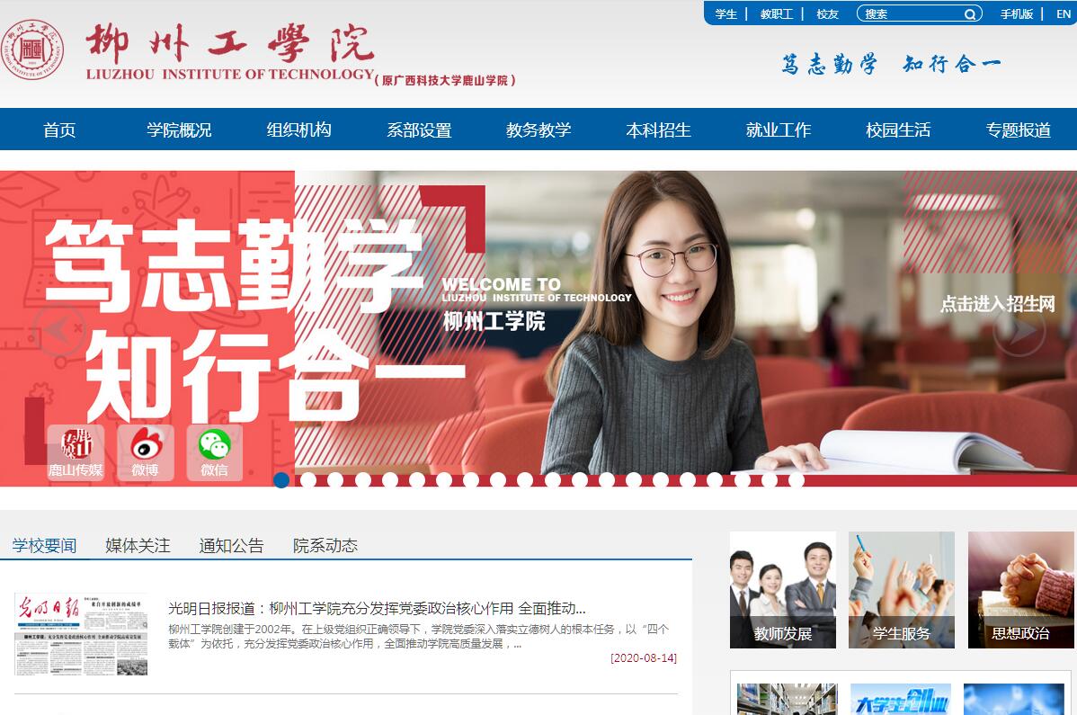 柳州工学院创建于2002年,前身为广西科技大学鹿山学院,由柳州市政府与广西科技大学共同举办。2020年4月,学院经教育部批准转设为独立设置的普通全日制本科高校,更名为“柳州工学院”。学院位于广西工业重镇、历史文化名城柳州市,校园占地面积1283.21亩,总投资逾13亿元人民币,总建筑面积42.54万平方米。拥有配套设施先进的教学与实验实训楼群,建设有基础实验中心、金工实习中心、各专业实验实训室、仿真实验实训中心等近170个实践教学平台,图书馆纸质馆藏书约99.87万册。学院建有一支德才兼备,素质优良,结构合理的师资队伍,拥有享受国务院津贴专家、自治区优秀专家、第一批广西高层次人才、自治区突出贡献科技人员、广西高校百名中青年骨干教师、柳州市政府签约理论专家、柳州市优秀青年科技人才等一批优秀教师,现有专任教师699人,其中约35%具有高级职称,50%具有研究生学历。学院立足广西,面向全国,紧密结合区域经济与社会发展需要,坚持“差异化”“特色化”发展之路,形成了多学科协调发展的学科专业格局,现有机械工程系、汽车工程系、土木工程系、电气与计算机工程系、经济管理系、艺术与设计系、外国语言文学系、食品与化学工程系、思想政治理论课教学科研部、数理教学部、体育教学部、外国语言教学部、公共艺术教学部等8个教学系5个教学部,开设38个专业,面向全国26个省(自治区、直辖市)招生,在校生逾12000人。近年来,学院不断深化教育教学改革,逐步建立起了以校企合作、产教融合为核心的协同育人体系。全院8个系先后成立了校企合作理事会及校企合作教学指导委员会,与国内100多家企业签署了校企合作协议并成立校外实习实训基地,行业、企业专家深度参与学院教学的各个环节。学院十分重视大学生的素质教育,着重培养创新型人才。学生在国内外大学生数学建模竞赛和全国大学生电子设计竞赛中,获得全国一等奖、二等奖等荣誉十余项。学生自行设计、制作的赛车,多次代表中国大学生车队,参与国际大学生方程式汽车大赛并获佳绩。在全国机械设计创新大赛、中国“互联网+”大学生创新创业大赛、全国大学生艺术展演等各级各类竞赛中,我院学生共获全国性奖项一百余项。服务地方经济建设和社会发展,是柳州工学院始终秉承的办学理念。学院是第一批加入中国应用技术大学联盟的成员,是广西首批4所新建本科院校整体转型发展试点学院之一。近年来,学院教师获得授权专利430项,学院知识产权总数排名全区33所本科院校第10位、全区独立学院第1位。根据武书连中国独立学院排名显示,学院综合实力由2014年的第91名跃升至2019年的第41名。学院坚持社会主义办学方向,坚守“为党育人,为国育才”使命,落实立德树人根本任务,发扬“笃志勤学、知行合一”的校训精神,秉承“德为先、质为本、重应用、求创新”的教育理念,努力培养思想品德优良、知识结构合理、实践能力突出,富有创新精神、具有开阔视野的高层次应用型人才,毕业生受到社会广泛欢迎,连续多年就业率达95%以上,曾先后获得“中国民办高等教育优秀院校”、广西壮族自治区“文明校园”、“广西高校毕业生就业创业工作突出单位”、广西壮族自治区“安全文明校园”等荣誉称号。当前,学院广大师生正凝心聚力谋发展,为把柳州工学院建成国内高水平特色鲜明的应用型大学而努力奋斗!