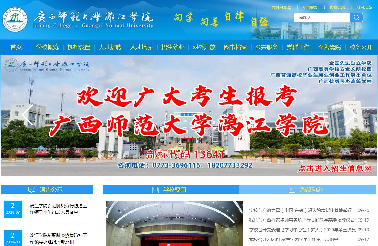 广西师范大学漓江学院创建于2001年5月,是经教育部批准,由广西师范大学按新机制、新模式举办的全日制应用型普通本科高等学校(独立学院)。学校是中国独立学院协作会常务理事单位、中国教育发展战略学会教育管理信息化专业委员会理事单位、全国(宁波)文化创意产教合作联盟理事单位、广西高等教育学会会员单位、广西“应用技术大学(学院)联盟”会员单位。学校地处国家历史文化名城桂林市,坐落于漓江之滨、雁山脚下,东向与广西师范大学雁山校区隔路相对。校园占地近900亩,建筑面积21.92万平方米,图书馆藏书76.8万册,建有多媒体教室93间、各类实验实训场所(室)76个(间),总资产近7亿元。学校环境优美,办学和生活服务设施完善,无线网络校园全覆盖,为学子们营造了沐浴书香、畅游学海、静学深思的修读氛围。学校现有语言文学学院、传媒学院、经济与管理学院、商贸与法律学院、教育与音乐学院、设计学院、体育与健康学院、理工学院、马克思主义学院/至善学院(合署)等9个二级学院,校企共建名淘电商学院、粤嵌电子工程学院、融媒体学院等3个产业(行业)学院。开设49个本科专业,初步形成了涵盖经、法、教、文、理、工、管、艺8个学科门类,以面向和对接现代服务业专业为主体、以教师教育类和人文社科类专业为两翼,以文化创意与教育服务、财经商贸与法律服务、信息与通信技术服务、旅游+运动康养服务4个专业集群为平台的“一体两翼四集群”专业结构格局。建有广西高校自治区级特色专业2个,广西高校自治区级创新创业教育示范专业、自治区级转型发展试点专业(群)、自治区级协同育人(建设)平台、自治区级实验教学示范(建设)中心、自治区级大学生校外实践教学基地、自治区级大学生创业示范基地各1个,以及广西民办高校重点专业和重点支持建设专业8个,自治区一流本科专业建设点2个,自治区级一流本科课程3门。学校面向全国22个省(市、自治区)招生,现有全日制普通本科在校生12568人,其中高职高专起点(专升本)学生269人。近年来,学生在国家级、自治区级各类学科(技能)大赛中获奖2000余人次,斩获全国大学生电子设计竞赛一等奖、全国高校国际贸易专业技能大赛一等奖、全国大学生广告艺术大赛二等奖,以及广西师范生教学技能大赛高中组一等奖和初中组一等奖、全国大学生数学建模竞赛广西赛区一等奖、全区师范生教学信息化大赛一等奖等高含金量的奖项。近五年来,毕业生就业率居广西同类高校前列,先后获得2015年度、2018年度、2019年度“广西普通高校毕业生就业创业工作突出单位”殊荣,2019届毕业生初次就业率和一次就业率分别达到91.93%和89.01%。截止2019年7月,学校为国家和地方输送了14届毕业生共28000余人。学校现有教职工近500人,其中自有专任教师近300人。自有专任教师中,副高以上职称64人,硕士以上学位210人。拥有全国优秀教育工作者1人,教育部万名优秀创新创业导师库入选导师4人,自治区优秀创新创业导师人才库首批入选导师13人,教育部全国高校思政教育优秀工作者1人,广西高校首批“卓越学者”1人,广西高校优秀中青年骨干教师培养工程人选3人,广西高校优秀青年骨干教师国内访问学者计划人选4人,西部地区高校人才培养特别项目人选3人,广西高校青年教师教学业务能力提升计划人选58人,广西民办高校“优秀教师”15人,国家留学基金委建设高水平大学公派研究生项目人选2人,中国教育发展战略学会教育管理信息化专业委员会理事1人,全国(宁波)文化创意产教合作联盟理事单位理事1人,广西高校中国语言文学类教学指导委员会副主任委员1人、高等学校对口支援教学指导委员会委员1人、英语类教学指导委员会委员1人,国家社科基金课题立项、项目结项通讯评审专家1人,广西高校教师系列专业技术职务评审专家1人,广西高等学校教师资格专家审查委员会委员1人,广西民间文艺家协会副主席1人,广西语言文学学会会长1人,广西壮学学会常务理事兼副秘书长1人,广西师范大学博士后合作导师1人、博士研究生导师1人,广西师范大学硕士研究生导师10人,等等。学校还聘请张葆全、施建军等一批高校知名学者、企事业单位和党政机关骨干人员担任学科专业首席教授。学校依托广西师范大学在师资力量、学术研究、教学管理的优势和广西区及桂林市优惠政策支持,不断提升核心竞争力和美誉度知名度。近五年来,获得各级各类科研教改课题300余项,其中教育部人文社科项目1项、教育部产学合作协同育人项目4个、广西哲社规划项目10项、广西本科教学改革工程项目62项;获得全国教师教育教学信息化大赛一等奖3项、广西高等教育自治区级教学成果奖一等奖1项、二等奖2项、三等奖3项,广西社科研究优秀成果奖二等奖3项、三等奖1项。先后获得了“全国先进独立学院”、“全国民办高等教育创新创业教育示范学校文化建设奖”、“全国大中专学生志愿者暑期‘三下乡’社会实践活动优秀单位”、“广西教育系统先进集体”“广西高等学校先进基层党组织”、“广西高等学校安全文明校园”“广西高等学校大学生思想政治教育工作先进单位”、“广西卫生优秀学校”、“广西普通高校毕业生就业创业工作突出单位”、“广西优秀民办高等学校”、“广西民办高等学校突出贡献奖”等一系列荣誉