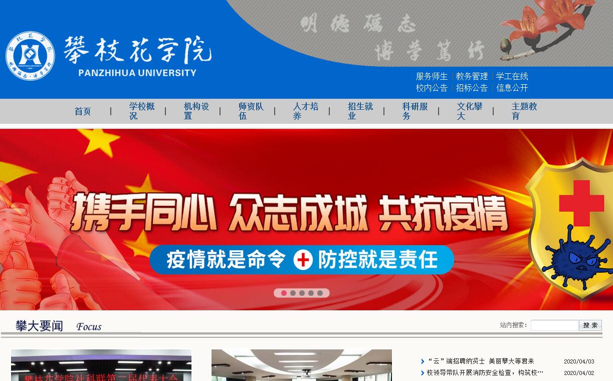 攀枝花学院是教育部布点在川西南、滇西北唯一一所以工为主的综合性普通本科院校。学校坐落于著名的钒钛之都、阳光花城、康养胜地、四川南向开放门户、全国唯一以花命名的优秀旅游城市--攀枝花市。学校始建于1983年,1994年与攀枝花教育学院合并,1998年四川省攀枝花卫生学校并入,2001年经教育部批准升建为本科院校并更名为攀枝花学院,2004年攀枝花市高级技工学校整体划归学校,2005年增列为学士学位授予单位,2006年攀枝花市中西医结合医院作为直管附属医院划归学校管理,2007年顺利通过教育部本科教学工作水平评估。学校现占地面积81.52万平方米,校舍面积54.06万平方米,固定资产总值7.07亿元,馆藏图书340.21万册(纸质图书133.51万册),教学科研仪器设备总值2.07亿元。下设19个教学单位、3个科研单位、7个教辅单位、16个党政群团部门、2个下属法人单位和1个直管三甲附属医院(攀枝花市中西医结合医院)。学科门类齐全,特色鲜明。学校是全国100所应用型本科产教融合发展工程项目建设高校,2016年成立全国首个康养学院,2017年成立全国首个中国特色社会主义理论教育学院,2018年成立全国首个钒钛学院。开设有52个本科专业、41个专科专业,专业设置涵盖理、工、文、法、经、管、医、艺、农9个学科门类,形成了以工为主、多学科兼容,普通高等教育、高等职业教育、中职教育、成人高等教育协调发展的办学格局。建有国家级特色专业1个、国家级专业综合改革试点项目1个、省部级优势专业13个、省级特色专业7个、省级应用型示范专业3个、省级专业综合改革试点项目3个、省级卓越人才培养计划12项、省级精品课程11门。2016年入选“教育部·中兴通讯ICT产教融合创新基地项目”第二批合作高校。师资力量雄厚,人才济济。现有教职工1093人,其中专任教师803人,副高及以上专业技术职务人员363人,占专任教师的45.21%;硕士以上学位624人,占专任教师的77.71%。现有国务院政府特殊专家津贴获得者1人,四川省学术和技术带头人2人,四川省第十一批有突出贡献的优秀专家1人,四川省第十一批学术和技术带头人后备人选15人,攀枝花市学术和技术带头人及其后备人选、攀枝花市有突出贡献专家、攀枝花市委直接掌握联系的高层次人才等119人。育人体系完备,成效显著。学校现有全日制本专科在校生及研究生、留学生共计16000余人,中专、技校在校生1500余人。近年来,本科生毕业率和学位授予率均保持在90%以上,用人单位满意度保持在96%以上,连续多年被评为“四川省高校毕业生就业工作先进单位”,建校以来已为社会培养本专科毕业生4.8万余人。考研通过率呈逐年上升趋势,2017届学生毕业率94.66%、就业率97.62%,考研上线435人。成立了创业学院、大学生创新创业俱乐部、大学生科技创业孵化园、大学科技园,大学生科技创业孵化园获批“四川省首批高校毕业生创业示范园区(基地)”,大学生创新创业俱乐部入选“四川省大学生创新创业俱乐部”,大学科技园通过省级大学科技园评审;十二五以来,立项大学生创新实验项目500余项,直接受益学生3000余人,孵化学生创业项目122个,成功孵化企业37家,实现创业就业500人,带动参与创业大学生超过8250人次。学生在各项学科竞赛、创新创业大赛中屡创佳绩,获得省部级及以上学科竞赛奖励1020项,其中国际级获奖3项,国家级获奖491项,2014年在美国大学生数学建模竞赛中获一等奖,2015年获全国大学生移动互联网创业大赛高校第一名。重视科研工作,成果丰硕。学校是四川省知识产权优势培育单位、四川省首批激励科技人员创新创业改革试点高校、四川省职务科技成果权属混合所有制改革试点单位,建有市级以上科研平台41个,其中国家钒钛检测重点实验室1个、国家级攀枝花钒钛孵化器1个,钒钛资源综合利用四川省重点实验室等省级重点实验室(工程研究中心)25个,攀枝花市岩矿重点实验室等市级科研平台14个。“十二五”以来,承担国家级科研项目5项,省部级科研项目152项,各级各类科研项目共计1355项,科研经费总额7293万元。获得省市级科技成果奖励113项,专利授权1637件,国内外公开发表学术论文8175篇,出版学术专著、教材301余部。在钒钛新材料、生物资源开发、太阳能技术等领域实现科技成果转化26项,可实现产值5亿元。坚持开放办学,合作广泛。学校先后与美国、英国、加拿大、泰国等国外高校及四川大学、电子科技大学、西南大学、西华大学等国内高校,在教学、科研和研究生教育等方面建立了合作关系。与东南亚、南亚国家合作开展留学生培养、文化互通和科研交流,8名老挝留学生已完成学业并顺利毕业,2017年招收51名来自巴基斯坦等国家的临床医学专业留学生。2018年学校成立国际教育学院(国际交流与合作处),将进一步推进学校办学更加国际化。植根攀西沃土,成效明显。围绕攀枝花市“钒钛”“阳光”两篇文章,建设有国家钒钛检测重点实验室、国家级攀枝花钒钛科技孵化器等科研平台,组建了钒钛新能源材料及其应用省级创新团队,与攀钢集团、泓兵公司等相关企业围绕钒钛资源综合利用共建联合实验室15个,加入全国钒钛资源综合利用产业技术创新战略联盟、全国钛白粉产业技术创新战略联盟、四川省钒钛产业协会、四川省石墨烯产业技术创新联盟等产业联盟与学会,成为国家钒钛资源综合利用及钒钛新材料