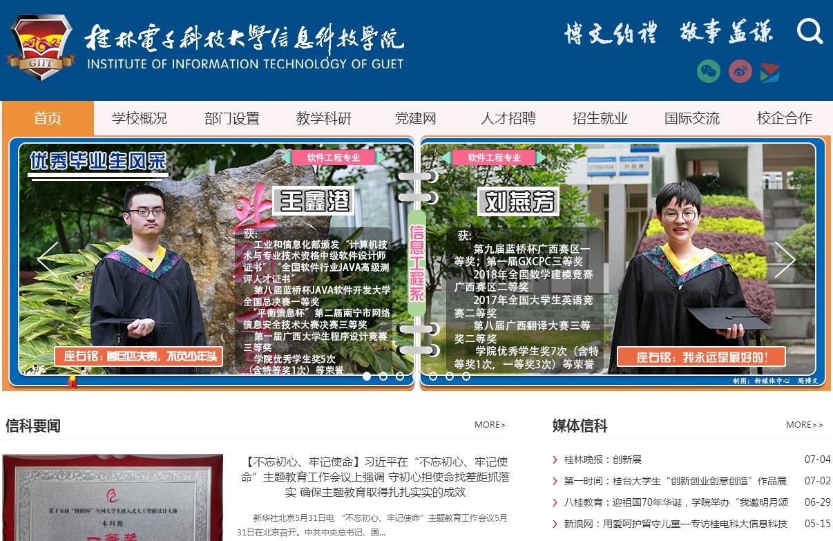 桂林电子科技大学信息科技学院(以下简称学校)创办于2001年,是经教育部批准设立的实施普通本科学历教育的高等院校。举办方桂林电子科技大学是全国四所电子科技大学之一,是工业和信息化部与广西壮族自治区共建高校,广西壮族自治区重点建设高校。中国绕月探测工程总设计师、国家最高科学技术奖获得者、中国科学院孙家栋院士为桂林电子科技大学名誉校长。学校坐落在历史文化名城、国际旅游胜地桂林,毗邻桂林电子科技大学花江校区。依托桂林电子科技大学的学科、专业优势以及优质的教育教学和管理资源,已逐步发展成为具有较高办学水平的普通本科院校。现有31个本科专业,面向全国25个省(市、自治区)招收全日制普通本科生,在校生近万人。办学定位。 立足广西,面向全国,服务行业及区域经济社会发展,逐步建成以工为主,信息学科优势突出,多学科协调发展,在全国同类院校中特色显著的高水平应用技术型大学。求学环境。 学校占地面积近1000亩,校园环境优美,学习、生活条件完备。学校被评为“中国综合实力独立学院”、“广西高校思想政治工作先进单位”、“广西壮族自治区高等学校安全文明校园”、“自治区卫生优秀学校”、“全国高校学生公寓管理服务先进单位”。学生食堂和公寓被评为“广西高校示范性标准化学生食堂”和“广西高校示范性标准化学生公寓”。专业建设。 以市场需求为导向,经过多年建设,学校形成了特色鲜明的专业建设格局。构建了电子信息技术、计算机工程应用技术、机械设计制造与装备三大工科专业群。计算机科学与技术专业群为广西新建本科院校转型发展首期试点专业群,电子信息工程专业、材料成型及控制工程专业为广西民办高校重点专业。材料成型及控制工程专业被评为广西高等学校特色专业及课程一体化建设项目。平台建设。 分别与TI、NI、讯方三家公司合作,获3个教育部产学合作协同育人项目。建立了通信等6个不同学科类别的大学生创新实践基地、1个大学生创新创业中心和1个大学生爱心茶室。工程技术人才实践教育基地被评为“自治区级大学生校外实践教育基地”,大学生创新创业中心被评为“广西高校大学生创业示范基地”。大学生心理健康教育与咨询中心被评为首批广西高校大学生心理健康与咨询示范中心。加入了全国应用技术大学(学院)联盟,进一步助推学校建设高水平应用技术型大学进程。人才培养。 学校坚持立德树人的根本任务,坚持“育人为本、质量立校”的办学理念,致力于培养具有创新精神和实践能力的高水平应用型人才。不断深化产教融合,推进校企合作,实施“3+1”等校企联合培养模式,构建了学校与行业、企业协同育人机制。积极培育“知行文化”,获全国高校校园文化建设优秀成果二等奖1项。学生在各级各类科技竞赛中屡获佳绩。2011年以来,学生在大学生课外学术科技作品竞赛等竞赛中获全国性奖项600余项、自治区奖项1300余项。学生男子篮球队在2016年CUBA(阳光组)中国大学生篮球联赛决赛中获第9名,这是广西高校大学生篮球在全国联赛中的最好成绩。毕业生深受用人单位欢迎,学校历年就业率均在93%以上。学校五次被自治区教育厅评为“全区高校毕业生就业工作先进集体”。师资队伍。 学校实施人才强校战略,师资队伍综合水平高。通过实施优秀人才引进、创新团队培养、青年教师业务能力提升、教师国际化、“双师型”教师培养等计划,聘请特聘教授、兼职教授、客座教授聘请等措施,逐步形成一支数量充足、师德高尚、业务精湛、结构合理、学术水平较高、可持续发展的高素质专业化师资队伍。教师中有广西高校本科教学指导委员会副主任委员1人、委员2人,有广西“新世纪十百千人才工程”第二层次人才1人、广西高校百名中青年学科带头人1人、广西高校优秀人才资助计划2人、广西高校骨干教师培养计划1人、广西十百千拔尖会计人才培养对象1人。获自治区级教学成果奖二等奖1个、三等奖2个。在第十七届全国教育教学信息化大奖赛中,我校教学团队一举夺得了大赛的最高奖——特等奖。国际交流与合作。 学校积极开展做国际交流与合作,拓展师生的国际视野。与英、美、澳、新西兰、泰国、马来西亚、台湾等国家或地区的大学签署了合作协议,学生可以参加各类长、短期出国(境)研修、交流、交换和攻读硕士学位项目。奖助学金。 为激励品学兼优的学生,树立优良学风,学校设立了各类奖学金,其中特等奖学金10000元/年,一、二、三等奖学金分别为6000元/年、3000元/年、1500元/年,国家奖学金8000元/年,国家励志奖学金5000元/年,自治区人民政府奖学金5000元/年。设立了新生奖学金,奖励额度最高为 40000元/生。展望未来,学校秉承“博文约礼、敬事益谦”的校训精神,实施“质量立校、特色兴校、人才强校、依法治校”的发展战略,走特色化、差异化和内涵式发展道路,不断深化高等教育综合改革,全面推进转型发展,全面提高办学质量,不断提升学校的综合实力、核心竞争力和社会影响力,逐步将学校建设成为在全国同类院校中特色显著的高水平应用技术型大学。