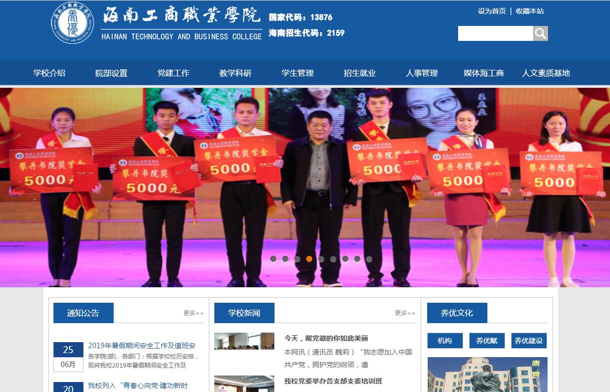 海南工商职业学院是教育部备案的全日制普通高等职业院校,坐落于海南明代先贤唐胄创办的养优书院原址——海南四大文化名村之一的海口攀丹村。学校前身为2004年创办的海南万和信息职业技术学院,2010年4月,教育部批准海南万和信息职业技术学院更名为“海南工商职业学院”。2012年5月,唐胄后人唐捷先生全资受让海南工商职业学院并出任法人代表和董事长。学校秉持“养优”之校训、“自强弘毅”之校风、“立德尚教”之教风、“向学笃行”之学风,坚持“师生为本,人才强校,质量立校,特色兴校,管理优校”办学理念,着力培养优秀之品德、优容之胸怀、优良之习惯、优异之学业的高素质技术技能型人才。学校地理位置优越,东临南渡江、西衔美舍河,位于海南省政治文化中心十分钟步行交通圈内,紧邻中共海南省委、人大和政协,毗邻海南省图书馆、博物馆、歌舞剧院、文化艺术中心、文化体育公园、体育中心等。学校校园环境优美,占地面积500余亩,建筑面积约23万平方,拥有标准的室外运动场和泳池,可容纳2000多人的综合性大礼堂。学生宿舍面积66347平方,学生食堂面积7287平方,固定资产总值5.3亿元;教学科研仪器设备总值8796万元;图书馆馆舍面积24900平方米,阅览座位1620个,现有纸质图书52万册,中文纸质期刊386种,电子图书135万册,电子期刊16698种,学位论文323437篇。学校还设有附属医院、附属小学、附属幼儿园。2013年10月,投资8400万元兴建的实训大楼,楼高15层,建筑面积18854平方,能够为学生提供充足的实训场所,配备各类先进的实训仪器,拥有目前省内最大的私有云平台,为学校开展高水平的实训教学提供了良好的条件。学校办学面向市场,形成了主动适应地方经济社会发展需要、结构合理、具有鲜明高职高专特色的专业群。现设经济管理学院、建筑工程学院、旅游艺术学院、信息工程学院、海洋学院和汽车工程学院6个二级学院和思政课部、公共课部2个教学部。2018年共有35个专业面向全国招生,其中,省级重点专业1个,省级特色专业3个,高职院校省级骨干专业2个。另外,还设有唐胄养优文化研究中心、省大学生人文素质教育研究基地(省人文社科基地)、省高校特色实验(实训)教学示范中心和省级创业孵化基地。学校拥有一支专兼结合的高素质师资队伍,其中高级职称教师62人;硕士研究生以上学历101人;“双师素质”教师162人。学校现有在校生6000余人,生源范围覆盖海南、广东、贵州、云南、甘肃、黑龙江等20个省(市)自治区,招生录取报到率连续五年位居省内同类院校前三名。学校设有中高职、高职和普通本科相衔接的“3+2”分段培养的专业以及“专升本”和“专接本”继续教育平台,设有“海南省第84国家职业技能鉴定所”,具备接收外国留学生资格,并被教育部确定为全国第一批教育信息化试点单位。学校全面推进素质教育,以“全面发展、一技多能、特长鲜明的高素质技术技能人才”为培养目标,不断提高人才培养质量。2011年以来,我校学生在省内外各项赛事中取得优异成绩,共获奖321项,其中,获国家级一等奖3项、二等奖12项、三等奖3项、优秀奖和其他奖4项;省级一等奖34项、二等奖57项、三等奖135项、优秀奖和其他奖73项。学校依托海南区位和办学体制机制优势,按照国务院“五个对接”要求,坚持以职业能力培养为核心,构建多元化立体化实践教学体系。持续推进产教融合、工学结合,强化校内实训,深化校企合作,部分专业与行业企业联合招生和联合培养,拓展并不断深化“订单式”培养。实施“教学做一体化”和“一系一品”工程,开办院办实体企业7个,建立校内实训基地39个,与深圳中兴通讯股份有限公司、北京红树林国际酒店管理公司等数十家企业合作建立校外实训基地57个,大学生创业孵化基地1个,学子创业工作室12个。在长三角、珠三角等产业密集地区设立就业联络处,搭建毕业生就业联络平台。目前,学校已形成招生、教学、实训、就业完整的人才培养链条。2010—2017年,海南省人力资源和社会保障厅公布的毕业生初次就业率,我校连续八年均在92%以上,位居全省高校前列。