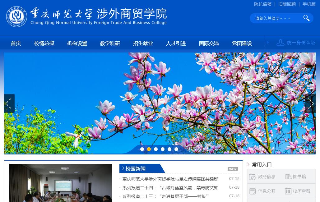 重庆师范大学涉外商贸学院是2002年经教育部批准设立的全日制普通本科高校。曾被评为“全国先进独立学院”、“中国品牌影响力独立学院”。学院秉承厚德、笃学、砺志、创新的校训,以内涵发展、产教融合、服务地方、形成特色为主线,人才培养质量和办学水平不断提高。经过近二十年的发展,学院已形成经、管、文为主体,理、工、艺综合发展的学科专业格局。现有本科专业37个,专科专业4个,涉及7个学科门类、18个一级学科。英语、国际经济与贸易、旅游管理等三个本科专业为重庆市“三特行动计划”特色专业,应用经济学是市级重点(培育)学科,国际经济与贸易是市级一流(培育)专业,国际经济与贸易、旅游管理是市级转型发展试点专业。目前在校学生17000余名,办学规模在本市同类院校中排名前列。现有合川与铜梁两个校区,设有跨境商务学院、管理学院、外国语学院、文学与创意传播学院、数学与计算机学院、大数据与智能工程学院、表演艺术学院、艺术设计学院、体育系、政治课教学部等10个二级学院(系、部),正筹建影视融媒体学院与音乐舞蹈学院(暂定名)。建有智慧实验实训大楼、标准图书馆、体育馆、实验剧场、模拟演播厅和200余间多媒体和智能化教室;设有智能教育与智慧学习协同创新中心,网络舆情大数据研究中心、数字媒体技术与应用研究所、全媒体创意传播研究中心、“智慧管理+”研究发展中心等科研机构。有市级实验教学示范中心、市级众创空间、市级大学生创业孵化基地。学校积极开展校地、校企合作,全面深化“产教城”融合发展。“互联网+”时代下的双创型计算机人才培养模式、跨境数字经济产学融合创新创业人才班教学研究、腾讯云大数据综合实验室建设等5个项目获教育部2018年第一批产学合作协同育人项目立项;与腾讯云(北京)有限公司共建西南地区高校首家腾讯云实验室;与爱奇艺(重庆)有限公司、欧文教育集团等知名企业开展学生带薪实践项目;学生赴美国、迪拜等国家带薪实习项目发展成熟;与马来西亚精英大学、泰国教师发展与服务友好中心开展师生留学游学访学活动;与阿里巴巴等100余家企业建立了校企合作关系并签订共建实习实践基地协议;长期为合川区政府、合川区文化和旅游发展委员会、财政局等单位开展培训服务,服务于地方发展。专业教师中具有硕士及以上学位的达75%以上。与美国、加拿大、韩国、泰国、意大利等国家多所高校建立了良好合作关系,常年聘请外籍教师在校任课和讲学,派送教师到美国、马来西亚、韩国、泰国等国家进行短期学术交流和访学活动。人才培养质量得到社会和用人单位的广泛认可,毕业生就业率保持在95%以上,学位授予率91%左右,考研上线率占每年应届毕业生总人数的4.5%左右。近三年,学生在全国大学生物流仿真设计大赛、全国大学生数学建模竞赛等各类竞赛和大赛中屡获佳绩,共获国家级一等奖30余项、国家级二等奖100多项。学院先后荣获“重庆市园林式单位”、“重庆市安全文明校园”、“重庆市普通高等教育学生管理工作先进集体”、“重庆市普通高等教育学生学籍管理工作先进集体”、“重庆市共青团工作先进集体”、“重庆市暑期三下乡社会实践活动先进单位”、“重庆市普通高校毕业生就业工作先进集体”、“重庆市普通高校毕业生创业工作先进集体”、“重庆市创业孵化基地”等荣誉称号。