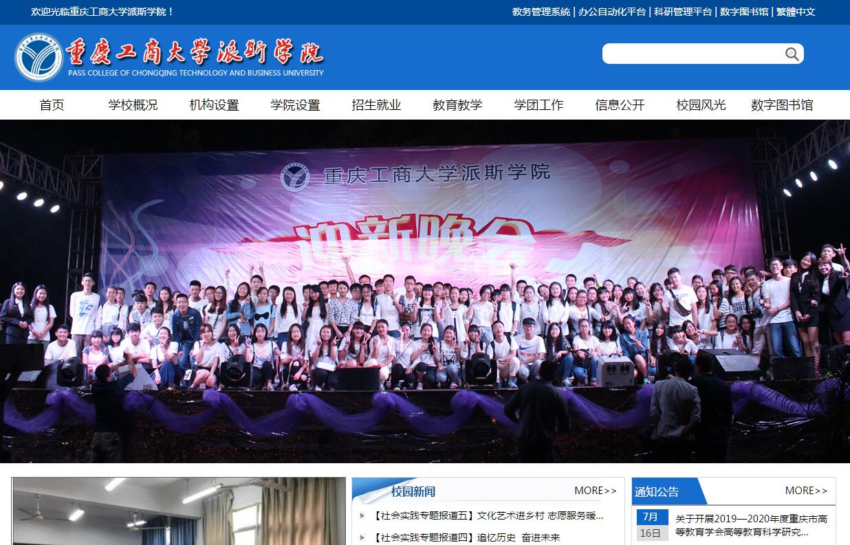 重庆工商大学派斯学院2003年12月经教育部批准为全日制本科独立学院(教发函[2003]541号文件),是一所具有学士学位授予权的普通本科高等学校。学校座落于中国历史文化名城——重庆市合川区城区内,校园古朴典雅、环境怡人,具有深厚的历史文化底蕴。现已初步形成了以经济、管理类学科为主,会计学、金融学、工商管理三个专业群相互支撑,文学、工学等专业相互促进的应用型人才培养模式。累计为社会培养输送了2万余名本专科毕业生,为地方和国家经济社会的发展做出了应有的贡献。学校的建设与发展,得到各级领导的关怀与支持。时任中央统战部副部长、全国工商联党组书记胡德平曾多次来校视察指导工作。时任重庆市市委副书记滕久明、市人大副主任陈雅棠、市政协副主席黄立沛以及教育部、市教委各级领导多次莅临学校指导工作。学校的办学成就得到了政府和社会的高度评价和肯定,重庆市政府授予“社会力量办学先进单位”称号、重庆市教委评定为“平安校园”、教育部中国教师发展基金会认定为“全国民办教育先进单位”。学校现有在校全日制普通本专科学生10236人。有一支品德高、知识渊博、教育技能强的教师队伍。设有会计学院、管理学院、金融学院、文学与传媒学院、外国语学院、软件工程学院、基础部等7个二级学院(部)和教务科研处、学生工作部、后勤基建处等管理部门,开设有会计学、金融学、投资学、税收学、金融工程、工商管理、市场营销、审计学、财务管理、旅游管理、英语、商务英语、广播电视学、汉语言文学、计算机科学与技术、物联网工程、汽车服务工程、物流工程、房地产开发与管理等22个本科专业和市场营销、会计、证券与期货等3个专科专业。其中会计学、金融学、工商管理专业在重庆“三特行动”计划专业评比中被评为市级特色专业。学校教学条件完善。建有校园网和图书馆,图书馆藏书丰富,并常年订有数百余种中文学术期刊、“中知网学术期刊数据库”和“万方学术期刊数据库”等图书文献资料;建有功能齐全的二级学院实验室(实训基地)及二级实验(实训)室;建有设施齐全的学生公寓、食堂、体育馆、球类运动场和塑胶标准田径运动场等。学校以教学为中心,建立了教学督导机制,狠抓教学质量和全面素质教育,增强实践能力;开设“就业指导”、“大学生职业生涯规划”等课程,指导和帮助学生对未来发展准确定位;高度重视就业工作,多渠道拓宽信息源,邀请用人单位来校选拔人才;鼓励本科毕业生报考研究生,支持专科毕业生“专转本”,学校考研、专升本率稳步提高。学校以建设和谐校园为目标,以素质拓展工作为推助器,以培养学生的健全人格为落脚点,大力推进校园文化建设,全面提高学生综合素质。打造了科技文化艺术节、社团文化节、社会实践、志愿服务、十佳评选、宿舍安全文化月等校园文化活动,学生们广泛关注和热情参与,共同构建了和谐文明、富有挑战、敢于创新的育人环境。学校将传承和发扬“含弘自强、经邦济民”的派斯精神,秉承“质量立校、特色兴校、人才强校”的办学理念,遵循“厚德博学、求是创新”的校训,不断深化教育体制改革,坚定不移的走内涵式发展道路,求真务实,开拓创新,努力把学校建设成为具有鲜明财经特色的应用型本科高校。